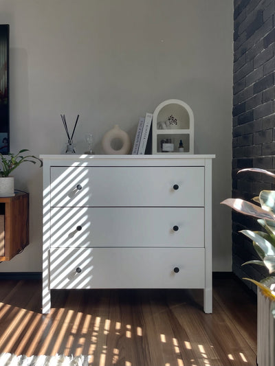 ベッドルームでもほかの場所でも、どんなインテリアとも合わせやすいシンプルで機能的なチェストです。お気に入りの服も予備の寝具も、どちらも収納できるスペースがあります。