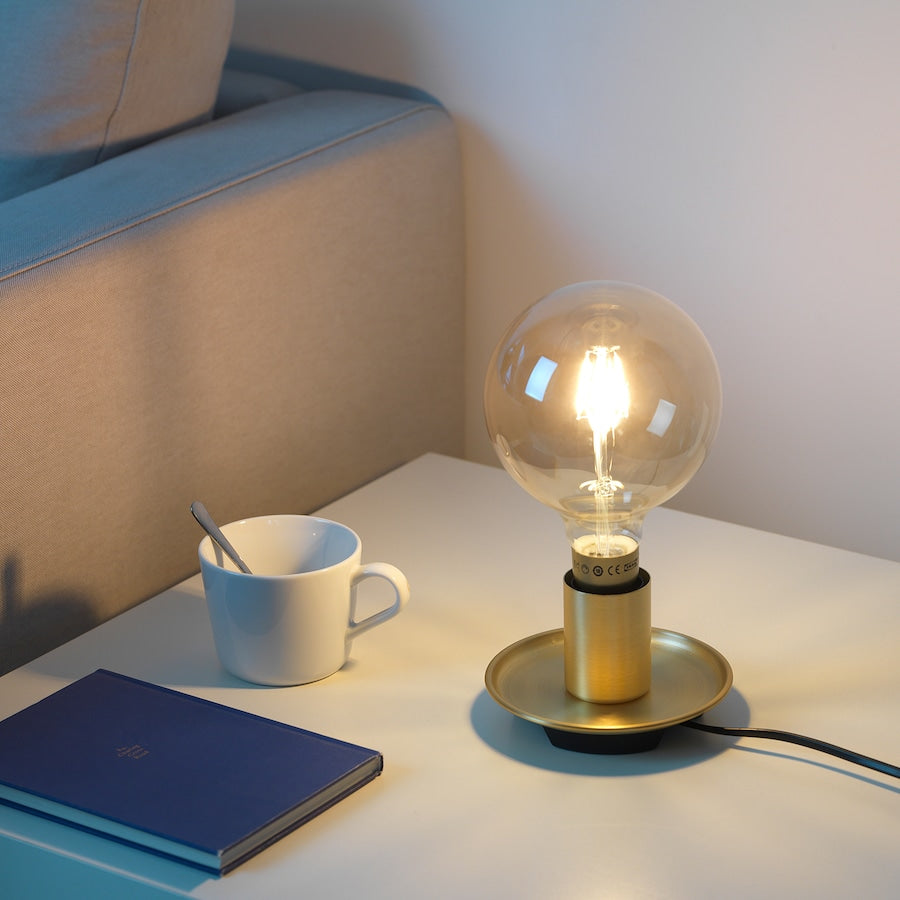 黄銅色で高級感が漂うテーブルランプベースです。ランプに装飾的な電球を組み合わせて、心地よい雰囲気を作ります。