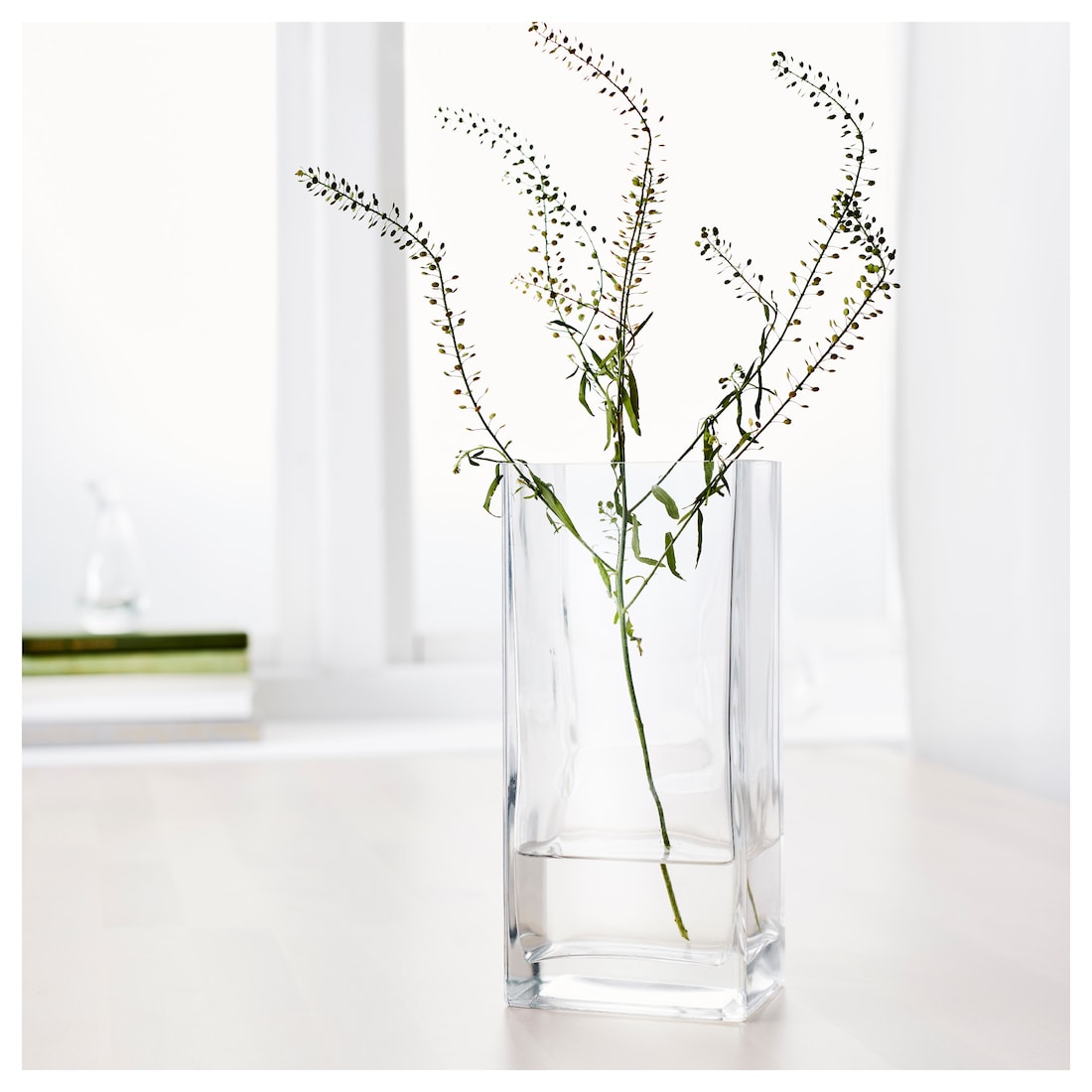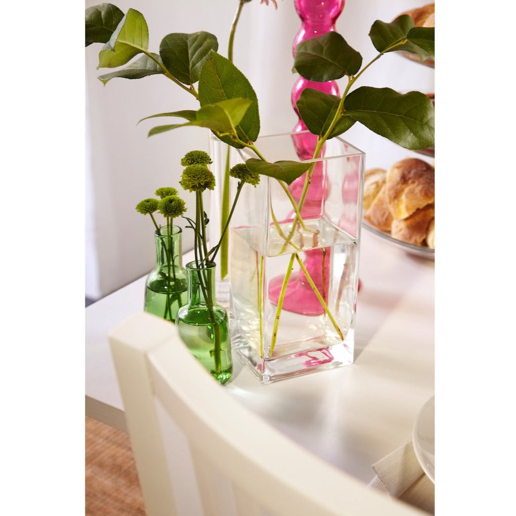 熟練した職人による吹きガラスの花瓶です。大きな花束も入れられる長方形の形をしています。お気に入りの花でいっぱいにして、形や香り、色合いを楽しめます。