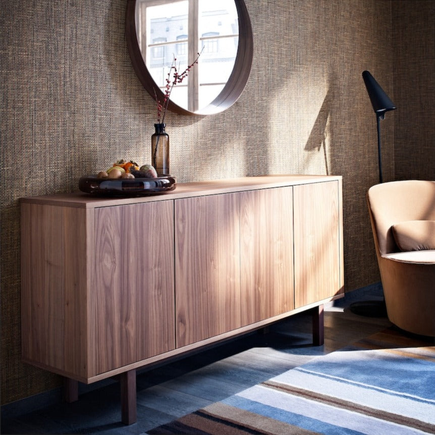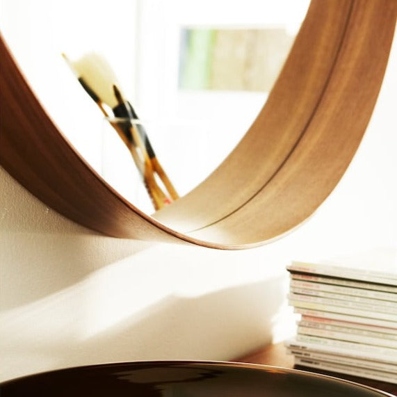 すっきりとした木製フレームのミラーです。ウォールナット材突き板を使用しているので、一つひとつ木目が異なります。ミラーフレームの下部は棚になっており、携帯電話や財布などを置けます。