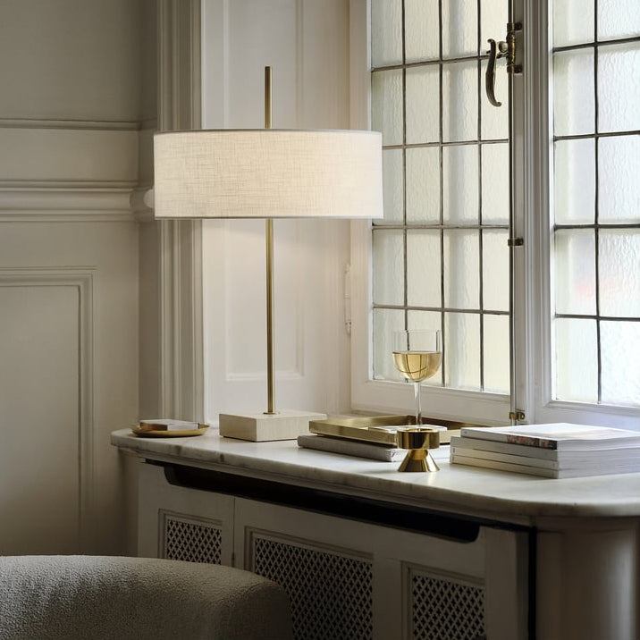 ランプを安定させるトラバーチン製ベースの上に、すっきりとエレガントな黄銅色の支柱と、心地よい光が広がる優れた構造のテキスタイルシェードを組み合わせています。ランプにスマートな電球を選択すると、用途やシーンに合わせて光を調整できます。