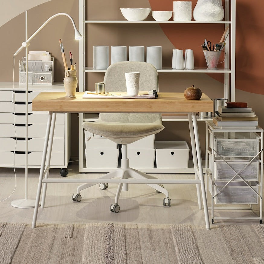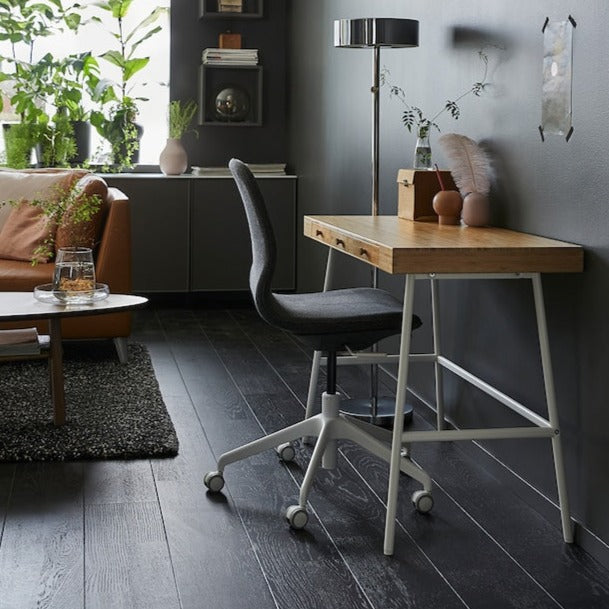 再生可能でサステナブルな素材の竹を使用したスタイリッシュなデスクです。竹は耐久性に優れ、背面にも仕上げを施しているので、部屋の中央にも置けます。引き出しには抜け落ち防止のストッパーが付いています。