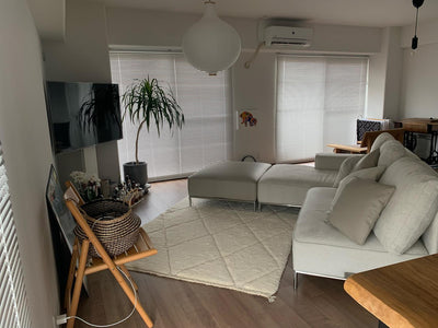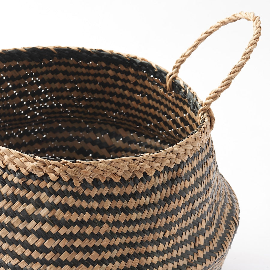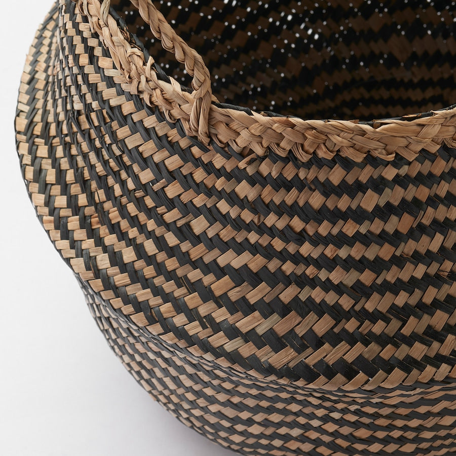 持ち手を出して収納物を目隠しすることも、内側に折り込んで収納物をディスプレイすることができる手編みのバスケットです。手編みの多機能なバスケットが、天然素材ならではのナチュラルな表情をプラスします。