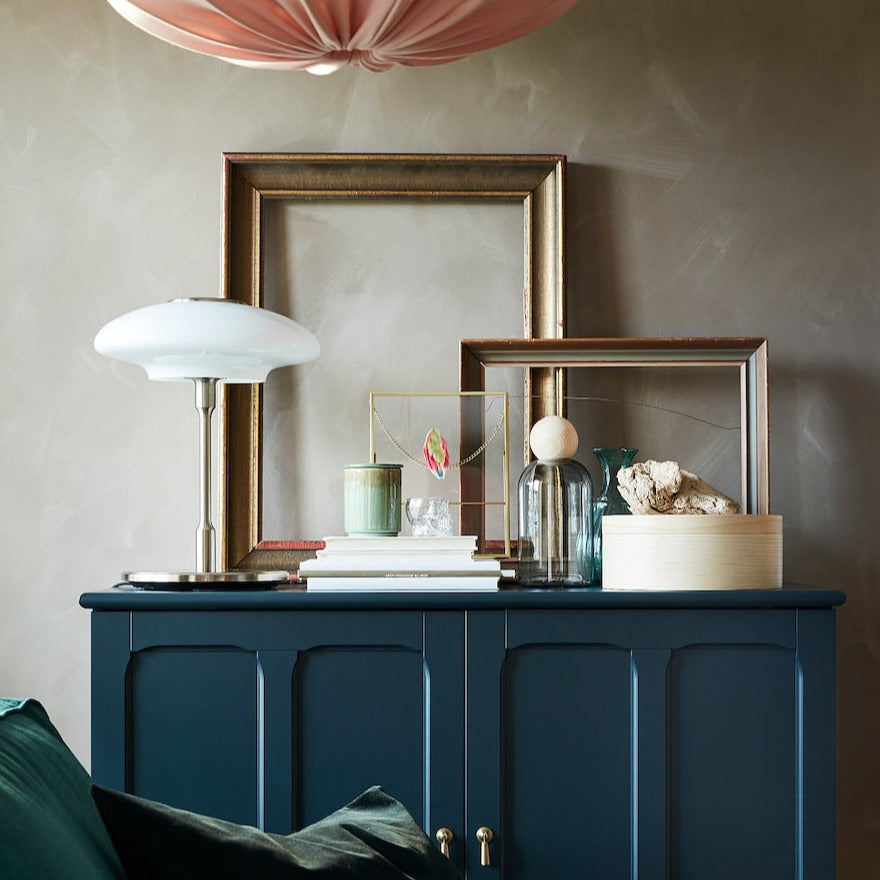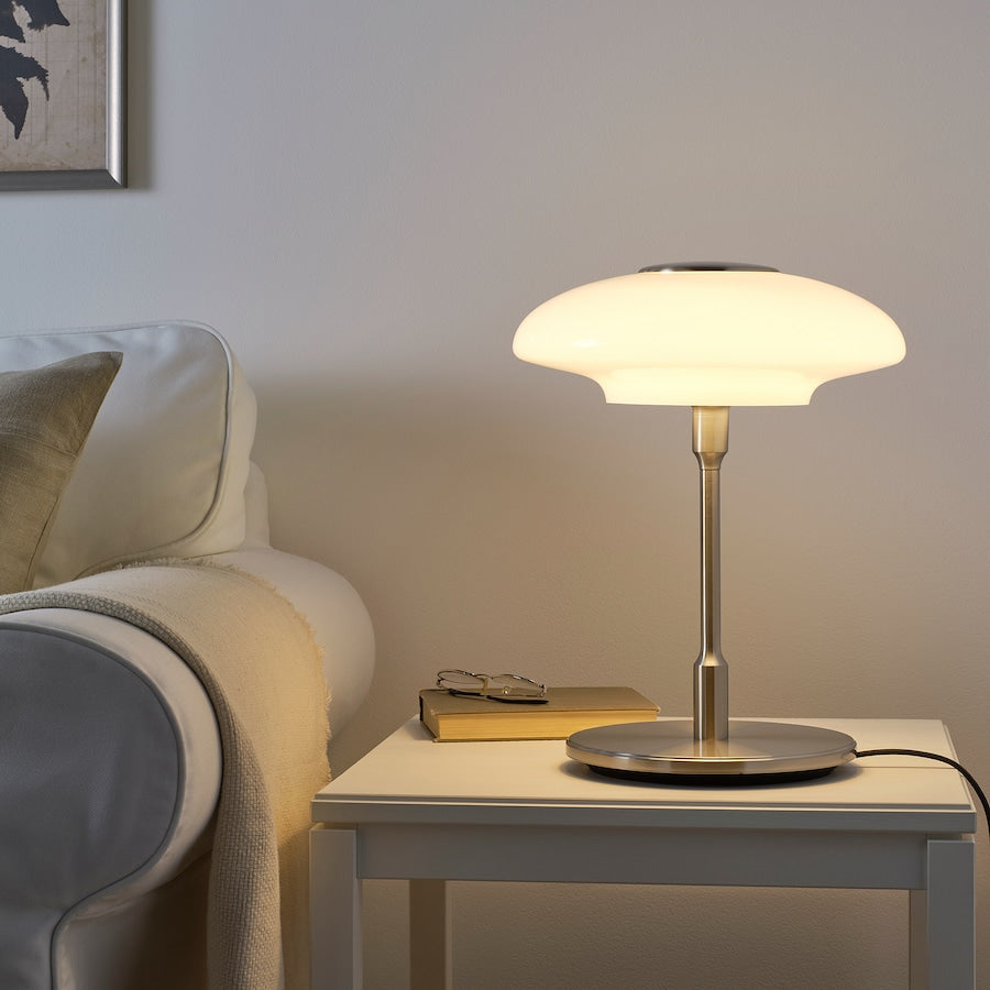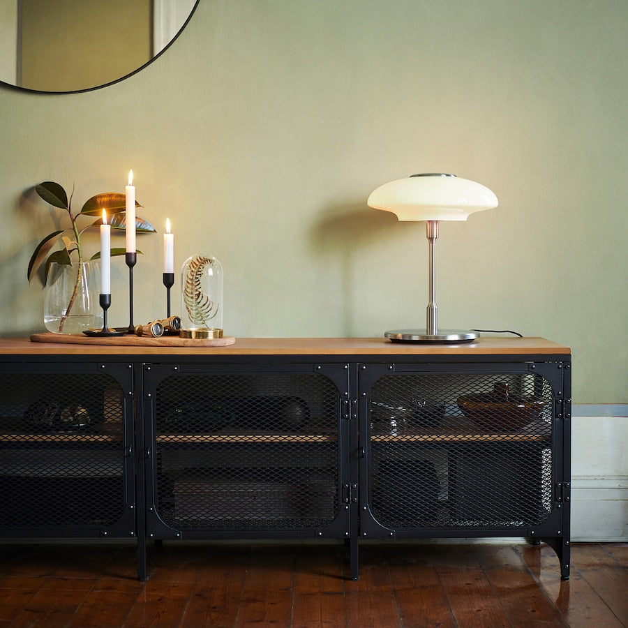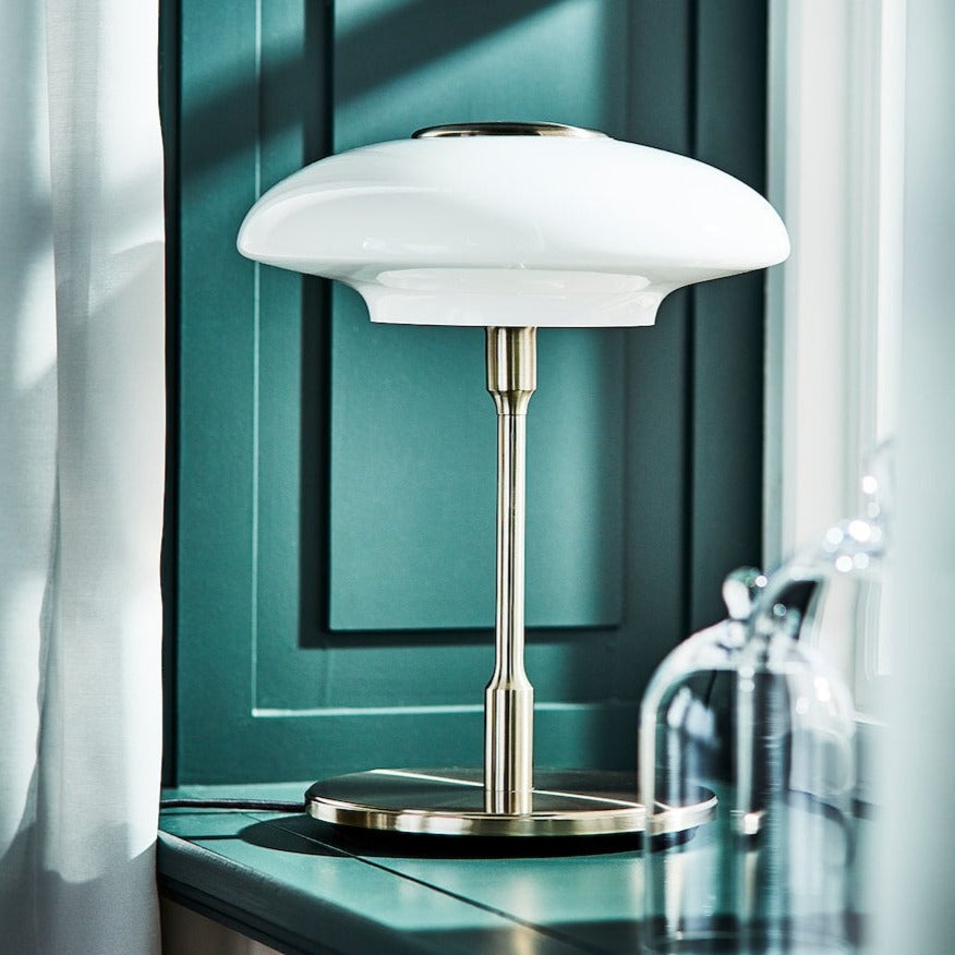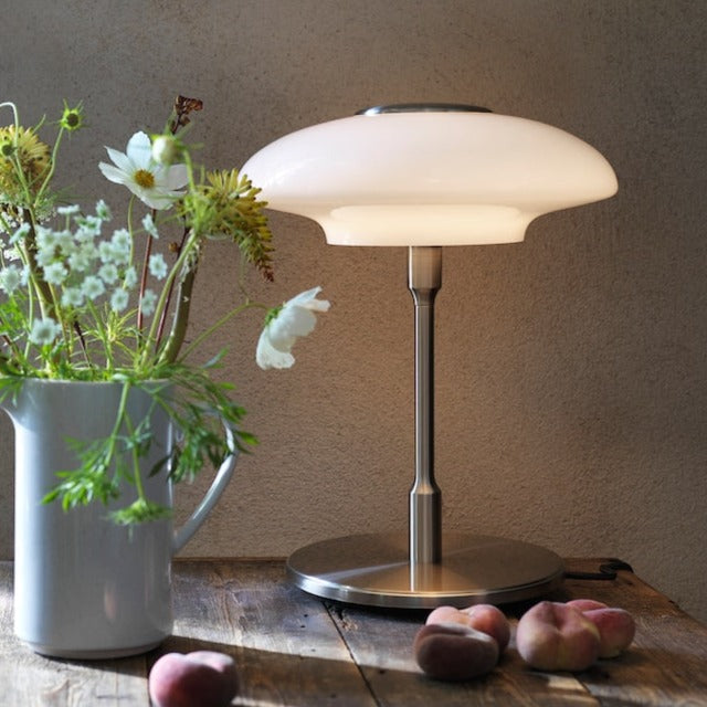 素材に金属と吹きガラスを使い、クラシックながらも頑丈なデザインが特徴のテーブルランプです。ムード照明にも機能照明にもなります。室内にちょっとノスタルジックなムードをプラスします。