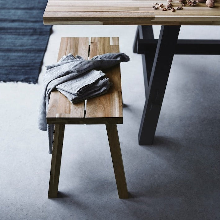 無垢材製のシンプルなベンチです。耐久性のある天然素材で、必要に応じてやすりをかけ、表面処理を施すことができます。