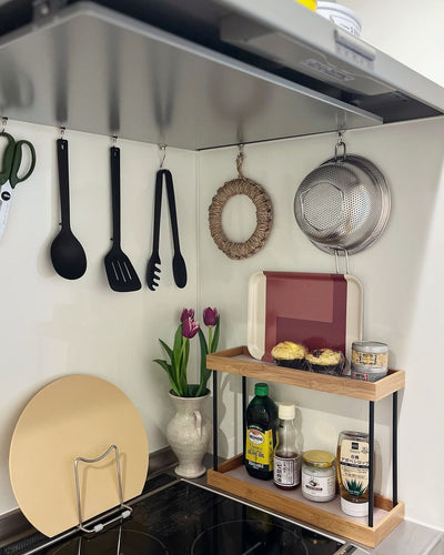 複数段の竹製キッチン収納です。お手入れの簡単な耐摩耗性に優れた天然素材で、キッチンにぬくもりと活気を演出します。ワークトップをすっきりと整理してスタイリッシュに保つのに役立ちます。このオーガナイザーは、ふた付き容器やスパイスミル、ボトルの定位置をつくれるので、必要なものをいつでもすぐに見つけられます。