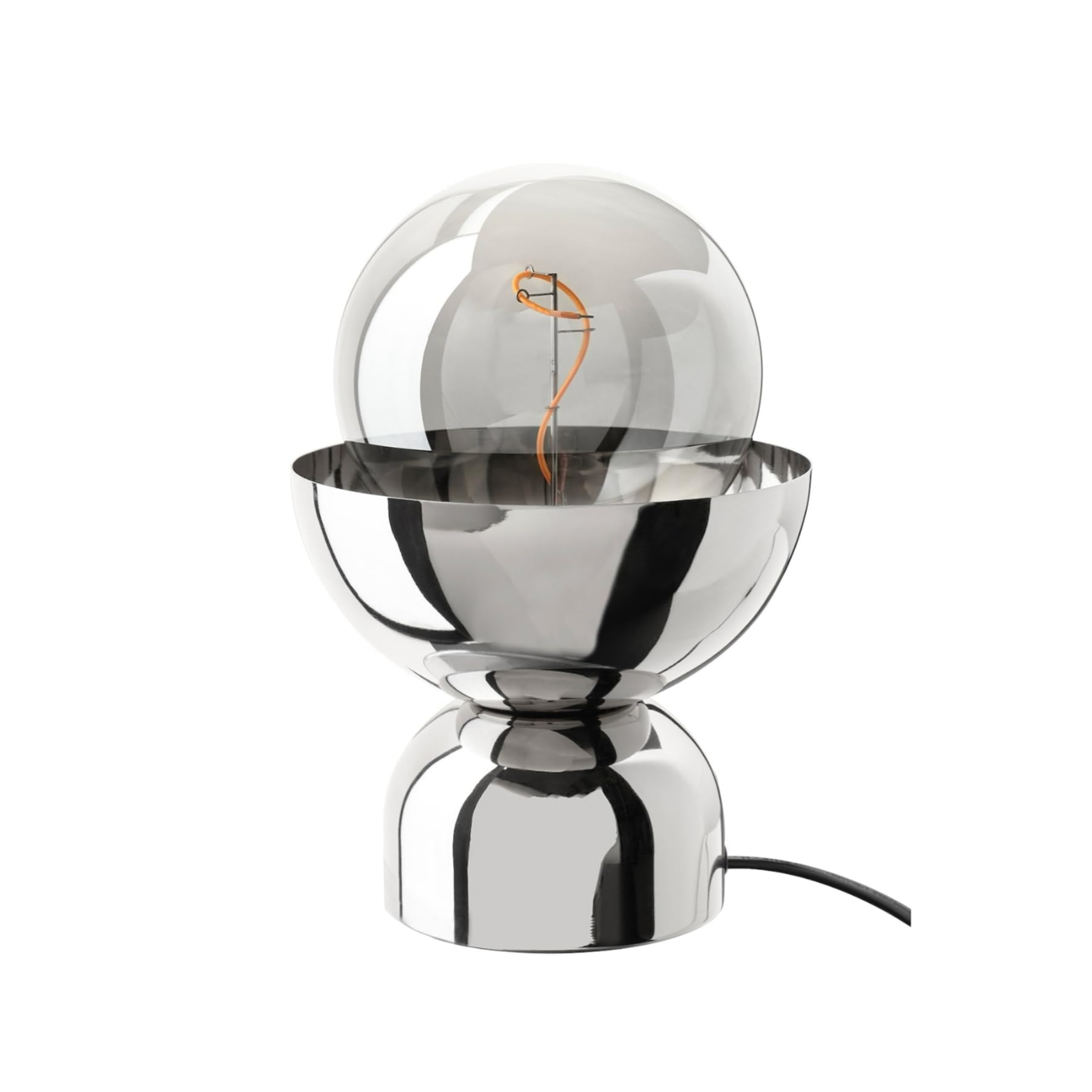 丸みのある金属製のテーブルランプです。装飾的なLED電球のらせん形フィラメントから、柔らかな光がスモークカラーのガラスを通って広がり、部屋の中に心地よい雰囲気をつくります。