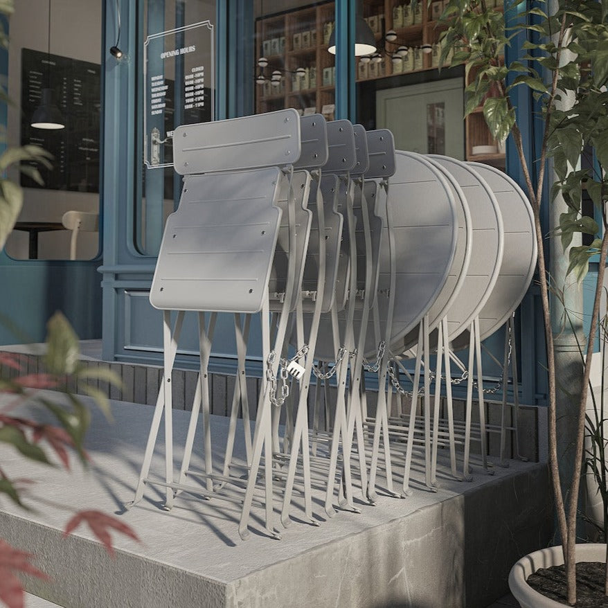 簡単に折りたたんでかたづけられる屋外用のテーブル&チェアセットです。バルコニーのようなスペースにぴったりのアイテムです。