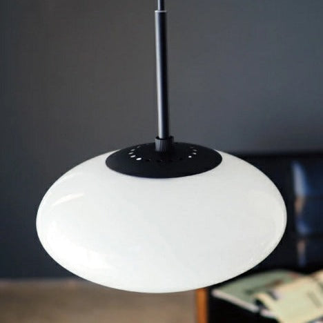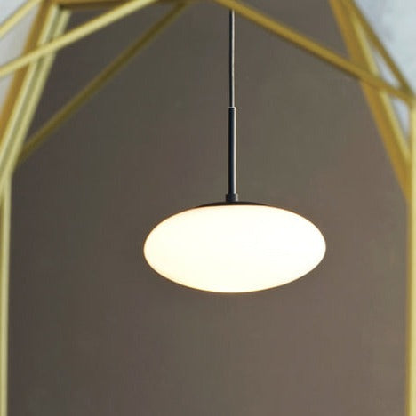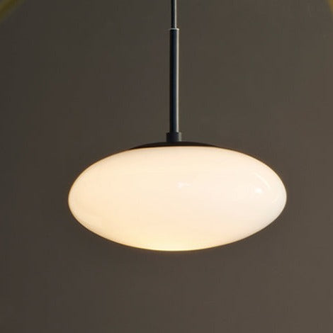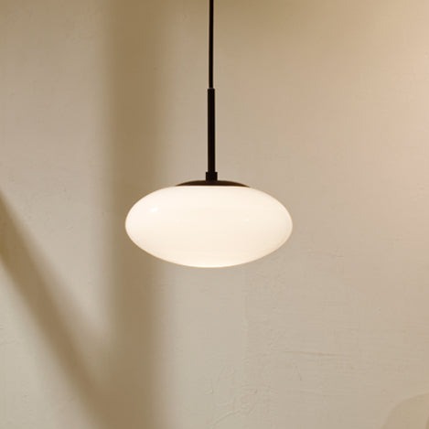 艶やかなオーバル型のガラスセードが、洗練された印象を与えるペンダントライトです。マットブラックのボディと乳白ガラスのコントラストがモダンなムードを漂わせます。乳白ガラスから漏れる光が、夜空に浮かぶ月のようにお部屋を柔らかく包み込みます。