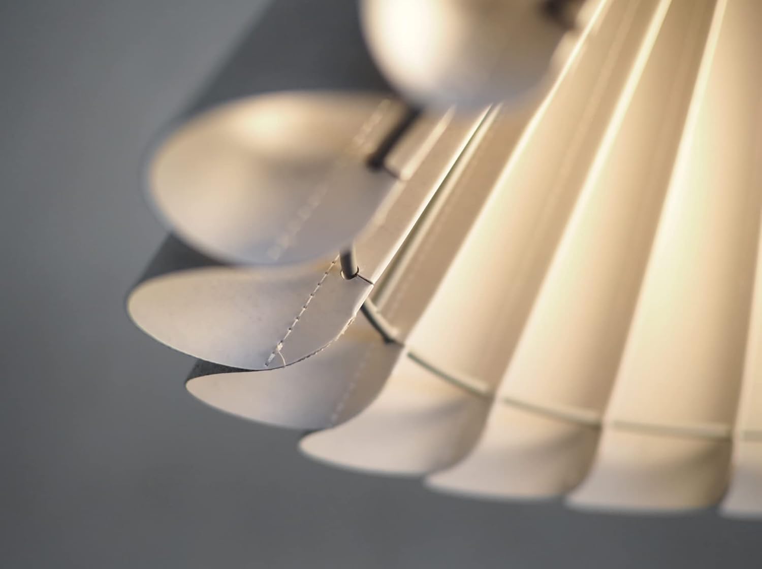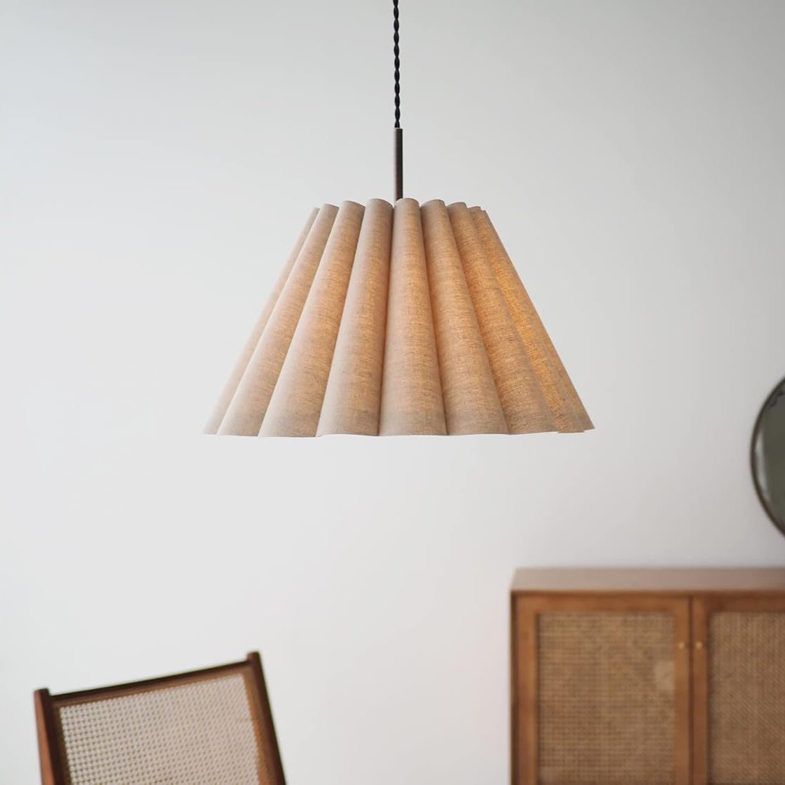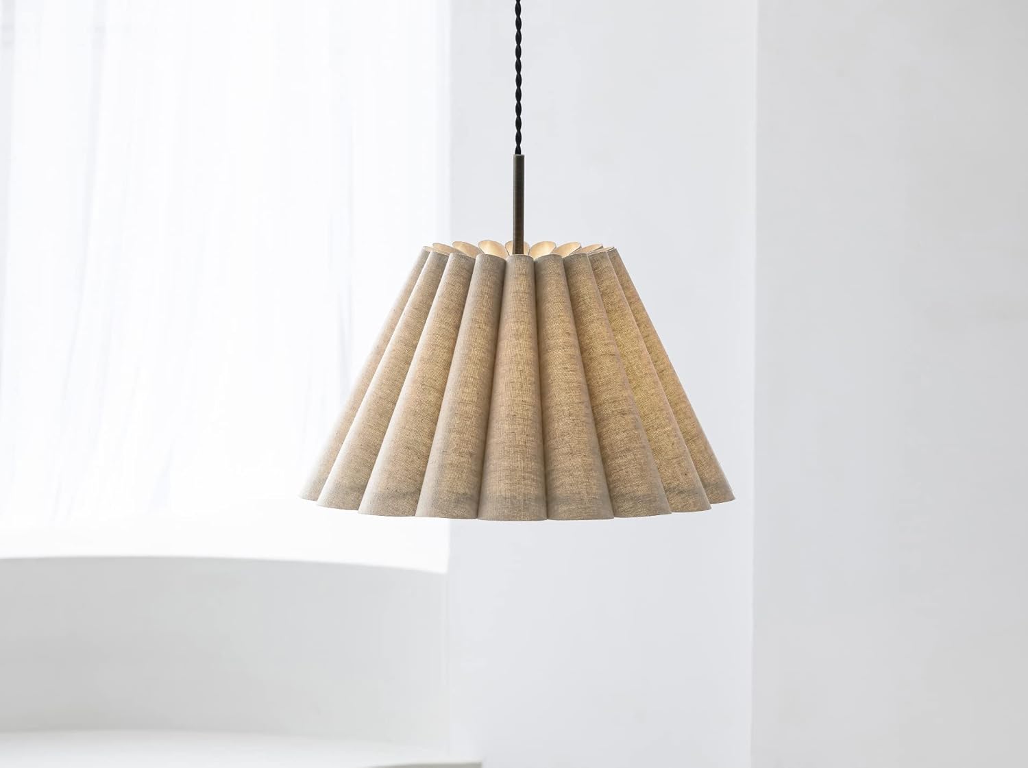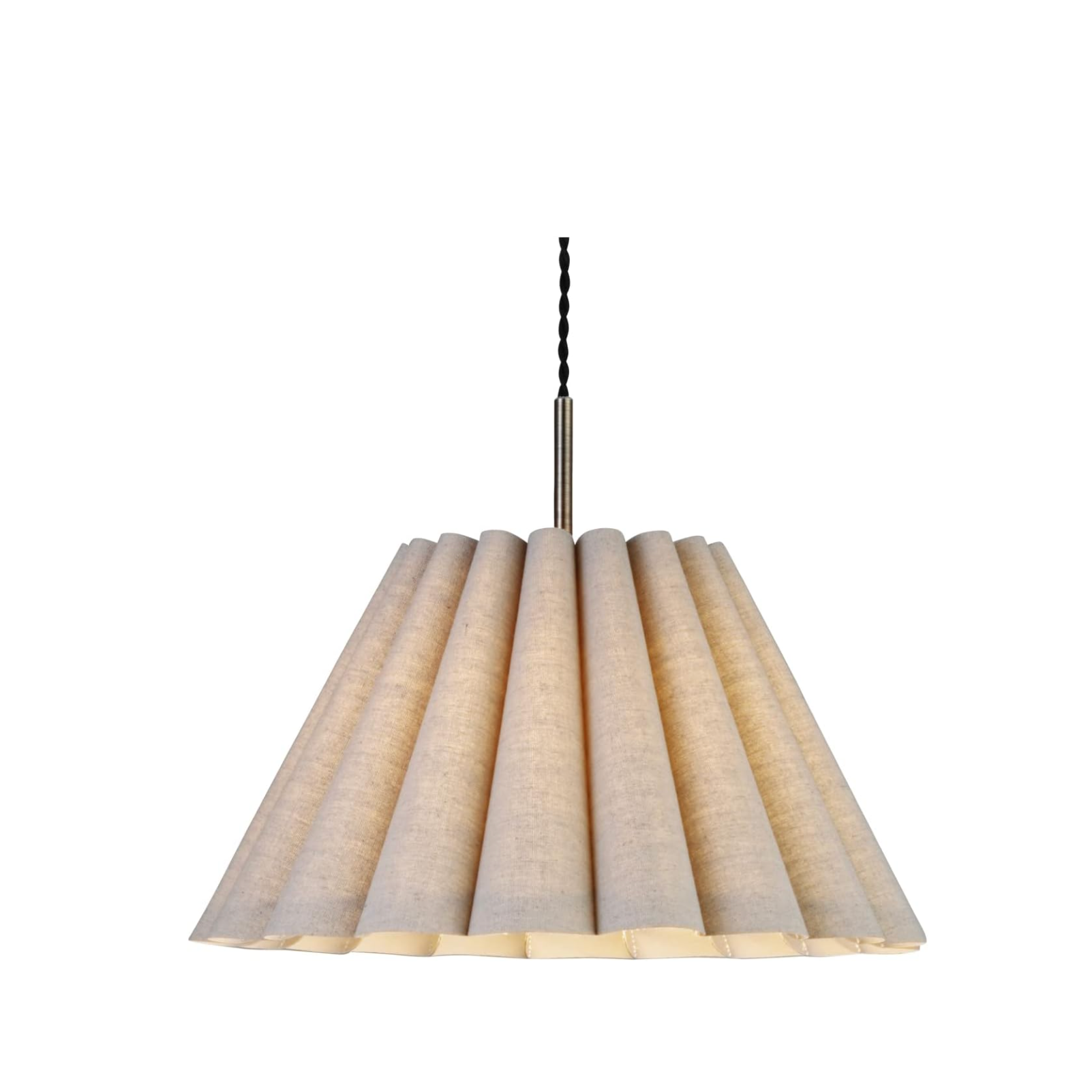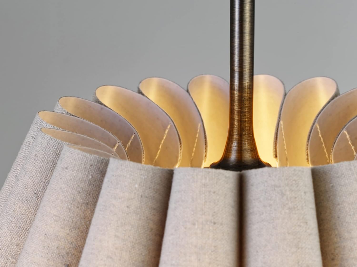 柔らかなドレープがゆったりと広がるビンテージライクなペンダントライトです。反復する膨らみと谷間が光のグラデーションを生み、立体的なフォルムと共に空間をシックに演出します。グレーのファブリックに合わせた鈍く輝くゴールドのパイプが個性と深みを与えています。