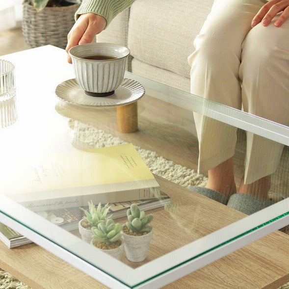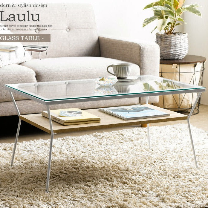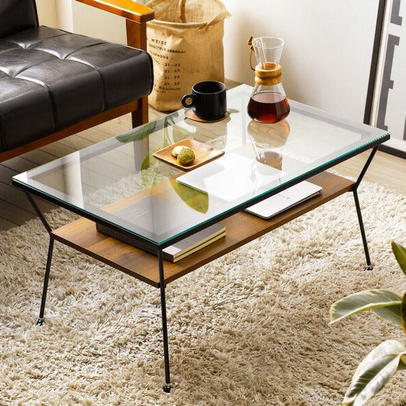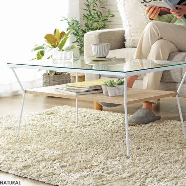 透きとおるガラス天板が部屋に抜け感をプラスするローテーブルです。棚板にはお気に入りを並べて、自分だけのとっておきの空間になります。くの字に曲がったフレームがアクセントになって、木製テーブルと比べて床面を多くみせることで、ワンルームでも圧迫感を感じさせない広々とした印象になります。