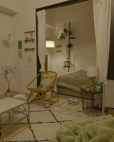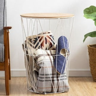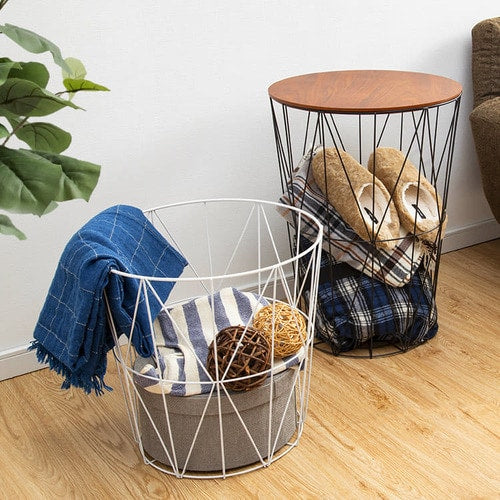 見せる収納と一つになったワイヤースチールテーブルです。フロアチェアのサイドテーブルとしてちょうどいい高さです。小物収納だけでなく、ランドリーバスケットとしてもご使用できます。
