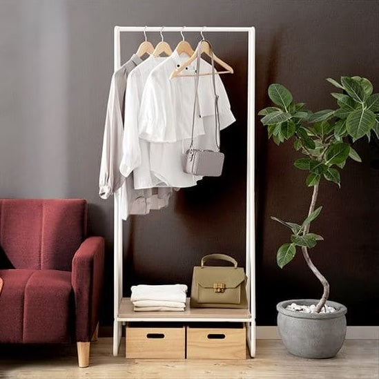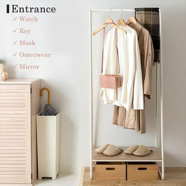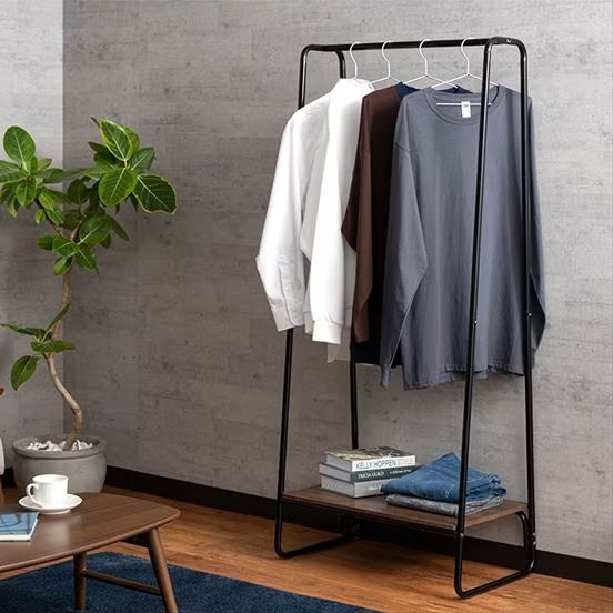シワなく衣類を収納するのに適したデザインパイプハンガーです。ハンガーには衣類をかけて収納し、底板には、帽子やカバンなどのファッション小物の収納に活用できます。ハンガー部分はクロムメッキ加工を施したスチールを使用しており、ハンガーがこすれても色がはげない設計になっています。