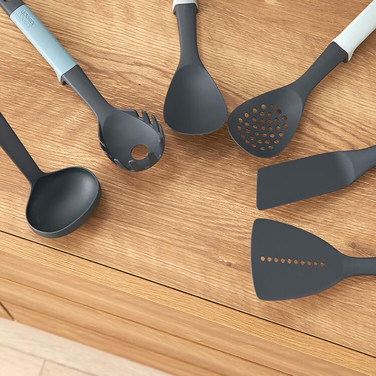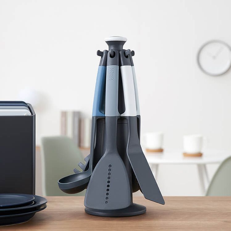 カラフルなキッチンツール6本と回転台のセットです。ツールのヘッドが台につかない設計なので、衛生的にキッチンツールを収納できます。