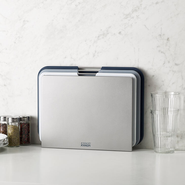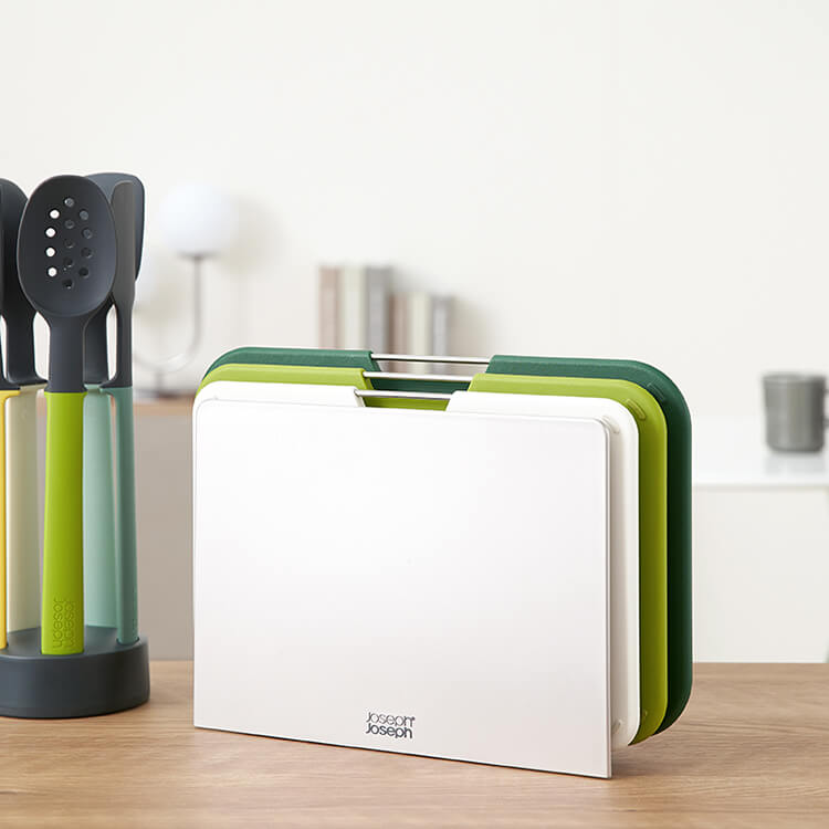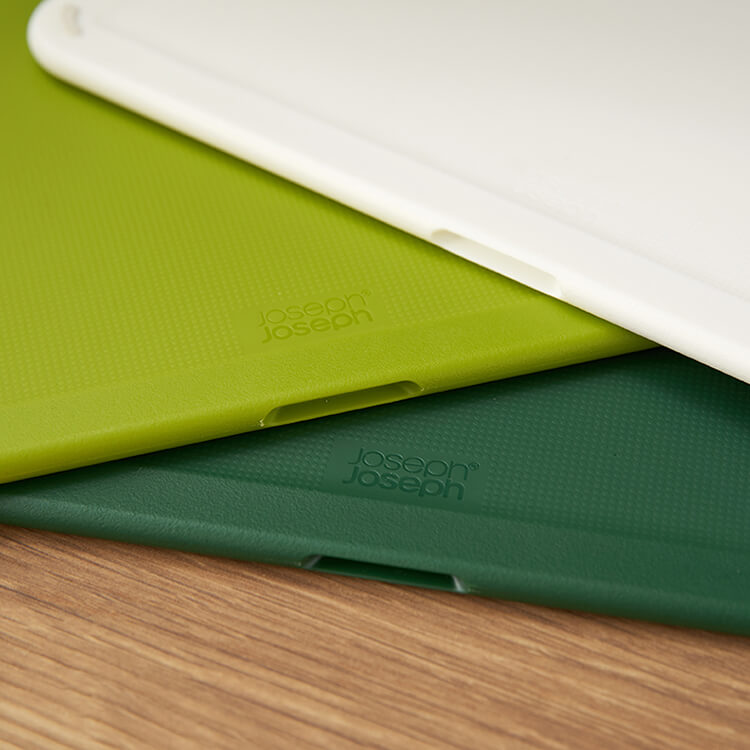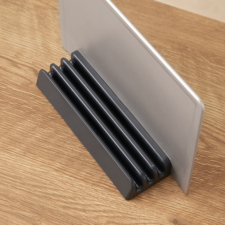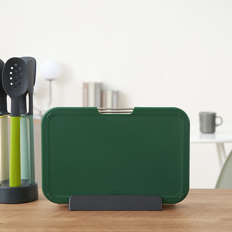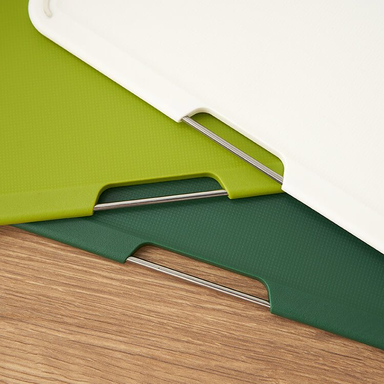 収納性と衛生面を考慮した進化型まな板セット。乾きやすく、すっきりと収納できるスタンド付きで、まな板の出し入れも簡単です。スタンドには、まな板が階段状に収まり、離した状態で立てられるため通気性が良く衛生的なつくりです。スタンド底面、まな板の裏面にはすべり止め付き。使用時もまな板が滑りにくく、収納時も安定して収納できます。