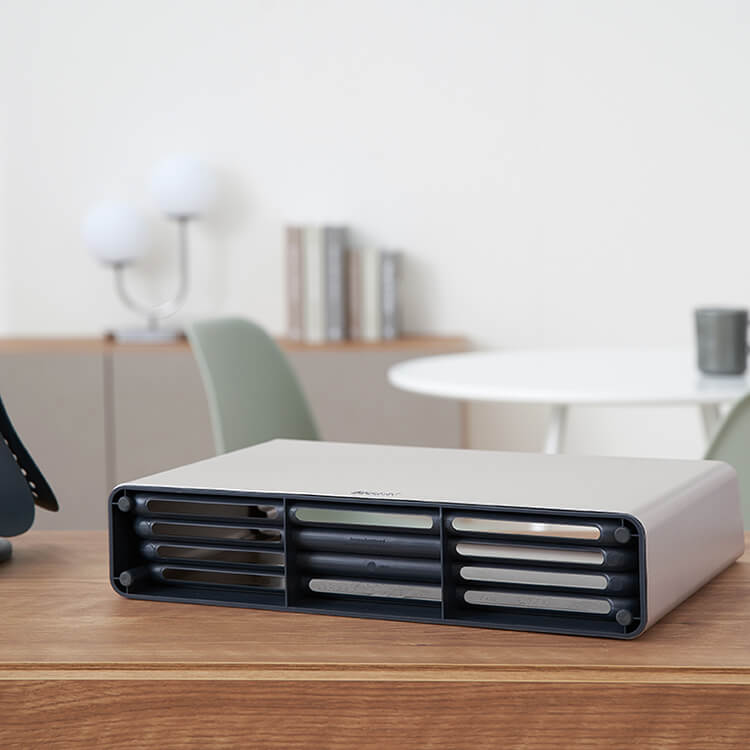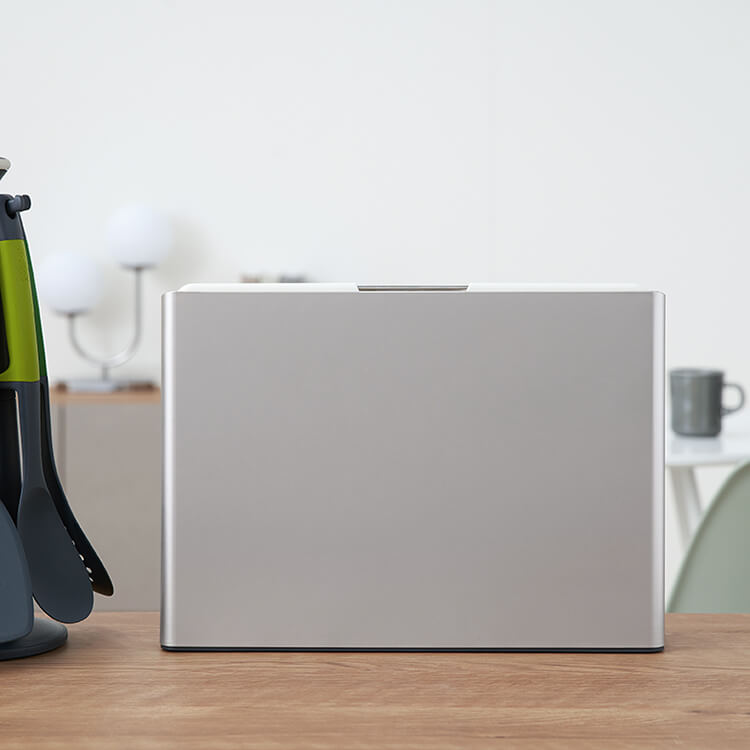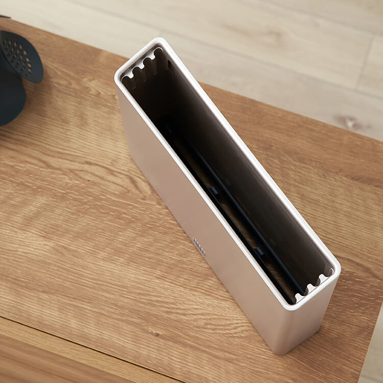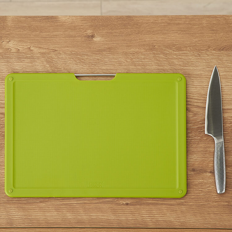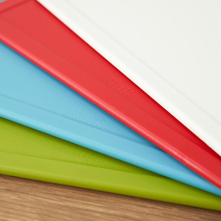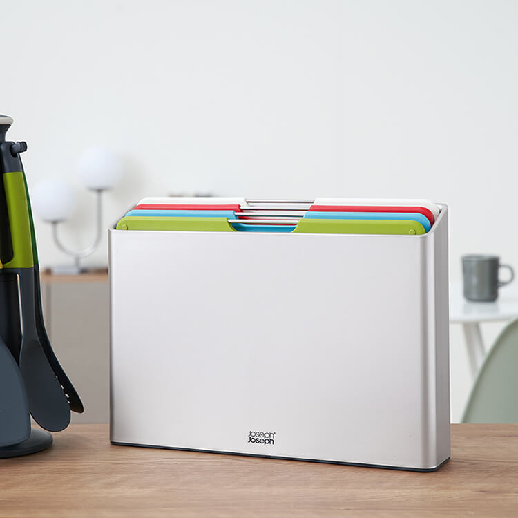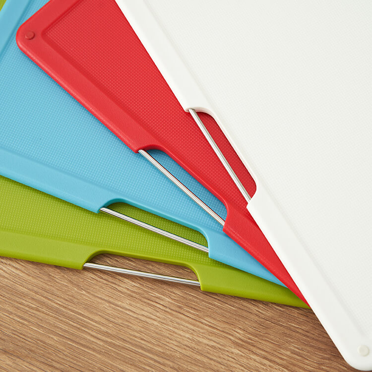 食材による使い分けができるカラフルなまな板4枚セット。きれいに整理して収納できるケース付き。ケースには、まな板が階段状に収まり、離した状態で立てられるため衛生的です。ケース底面にはすべり止め付きで、安定して収納できます。