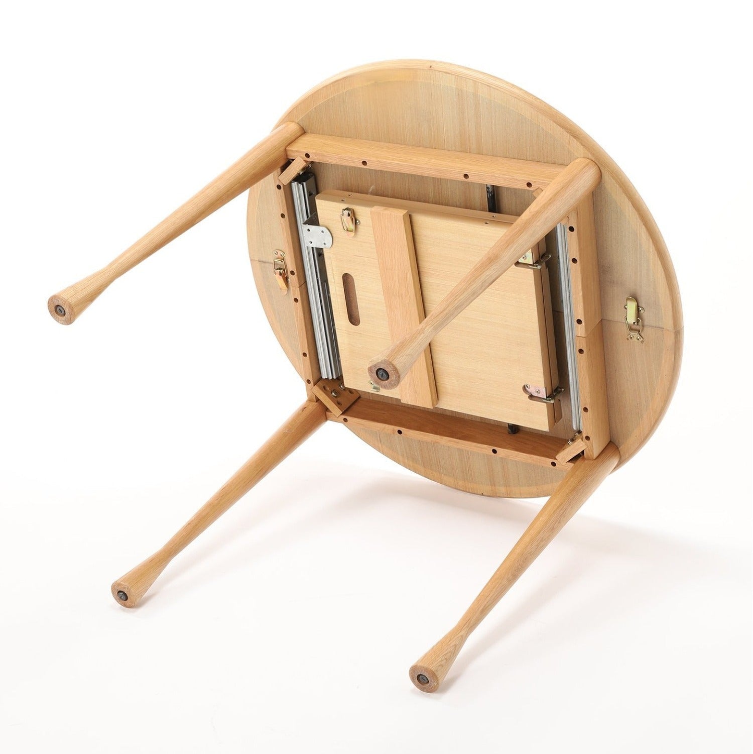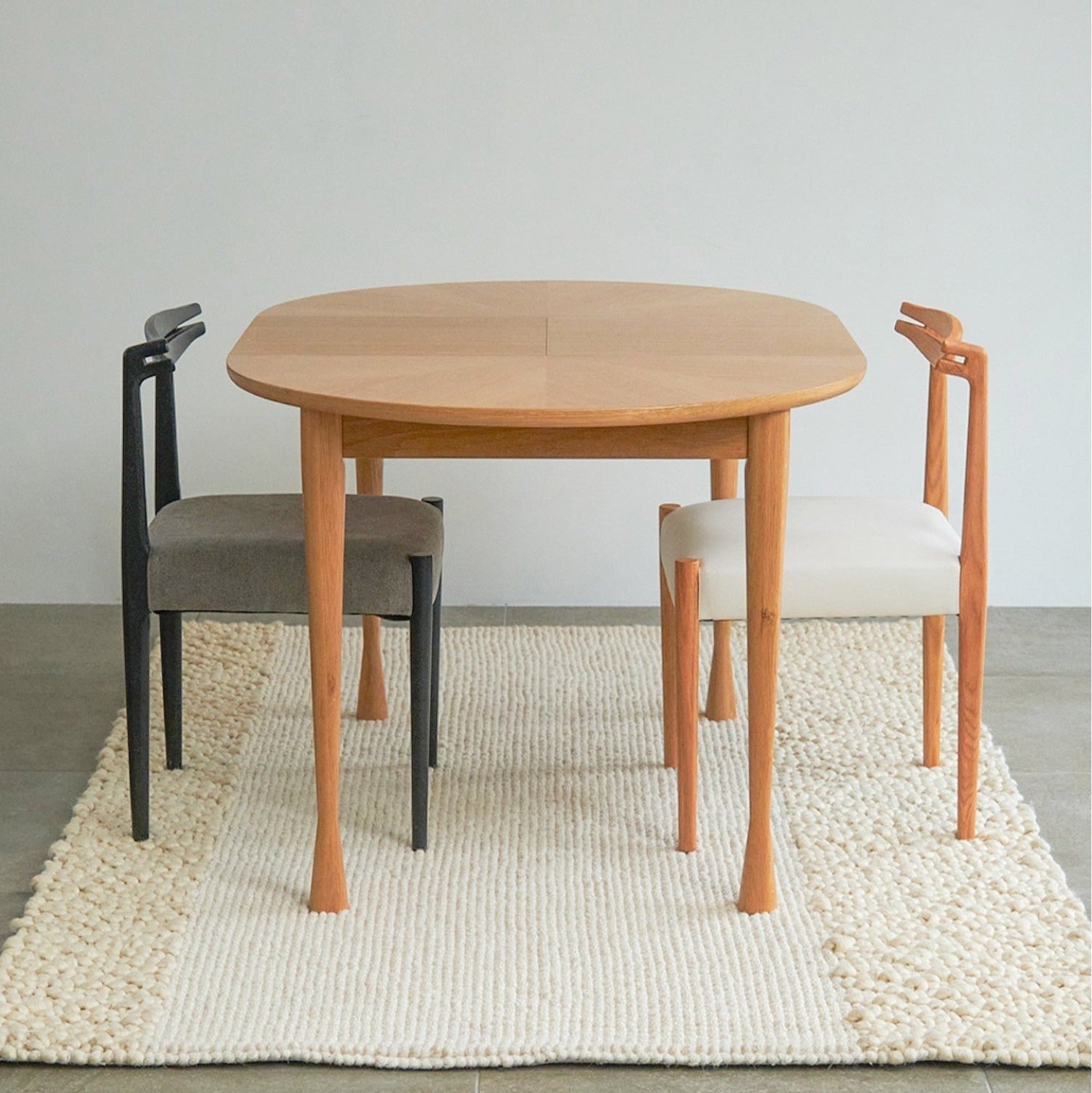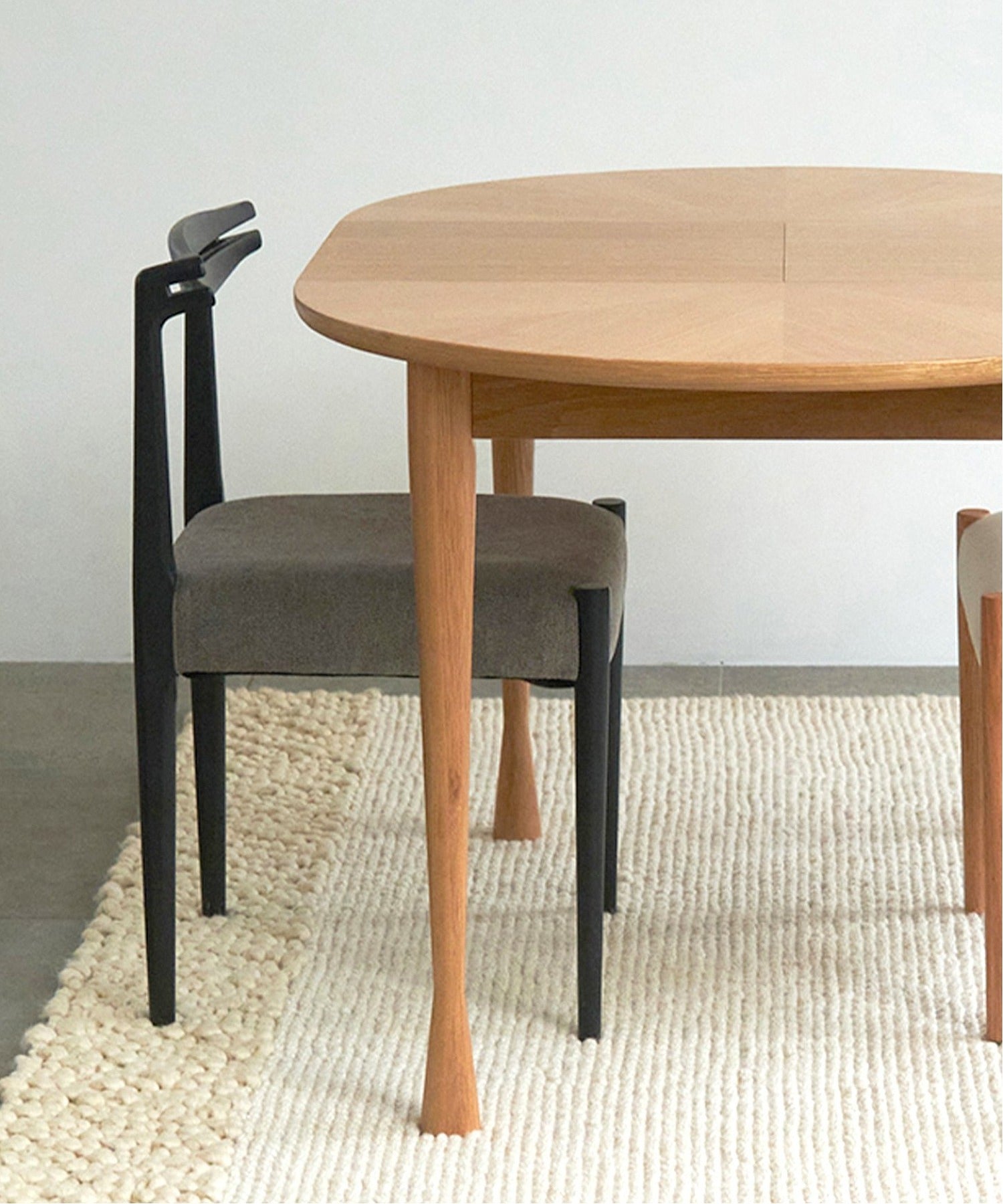 直径90cmのコンパクトなラウンドテーブルです。先端にかけて徐々に細くなっていく脚先が最後また少し太くなるデザインが特徴です。天板は中心から突板を放射状に張り分けた矢羽根張り。見る角度によって表情が異なり、インテリアのアクセントになるダイニングテーブルです。天板の下に40cmの幅のエクステンション天板が内蔵されており、90cmから130cmまで広げることができます。