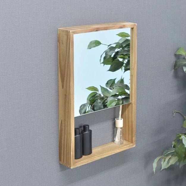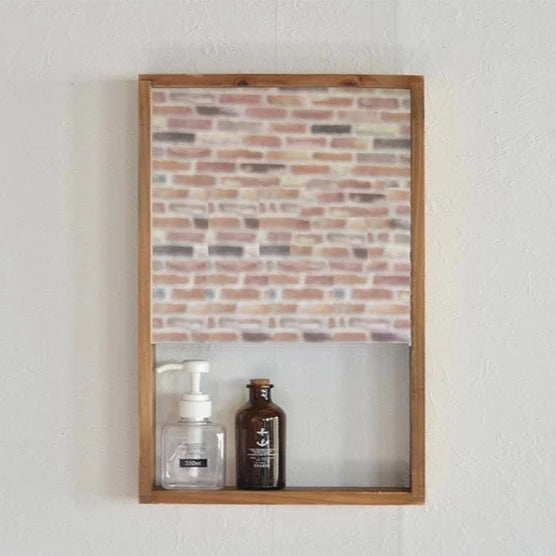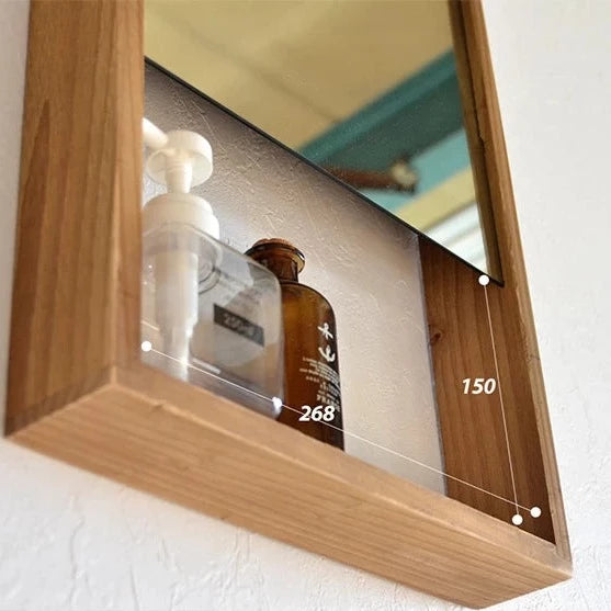 収納スペース付きの壁掛けミラーです。杉の天然木で作られ、ヴィンテージ感の風合いを感じられます。また、ちょっとした収納スペースがあるので、ハンドボトルや香水など軽いものを置くこと可能です。