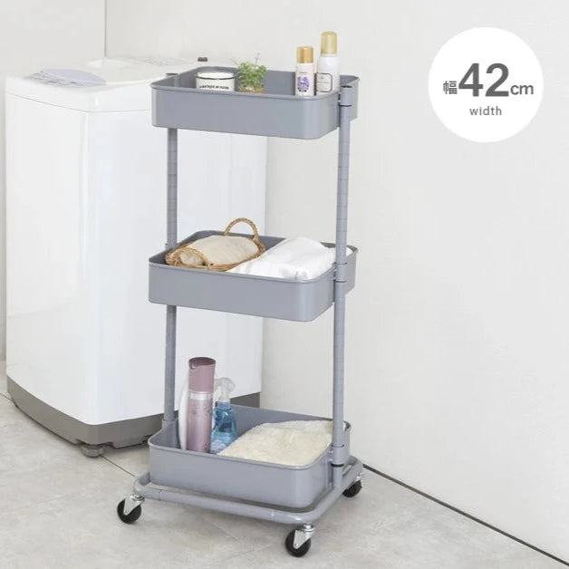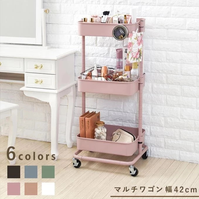 かごの高さが変えられ、物が落ちにくく、こまかいメッシュが特徴のワゴンです。落ち着きのあるオシャレなくすみカラー6色から選ぶことができ、お部屋のインテリアに合わせて使用できます。