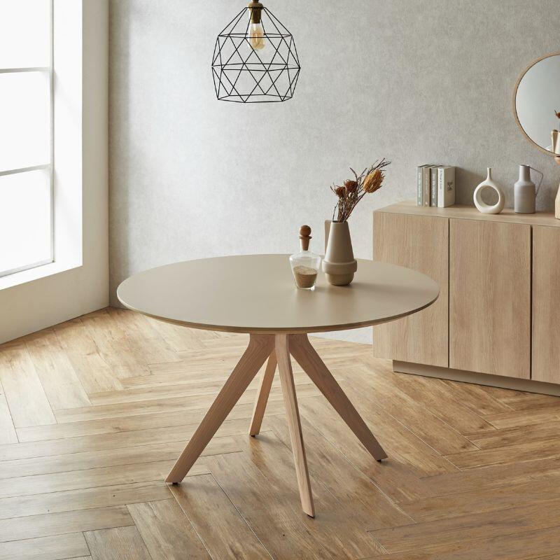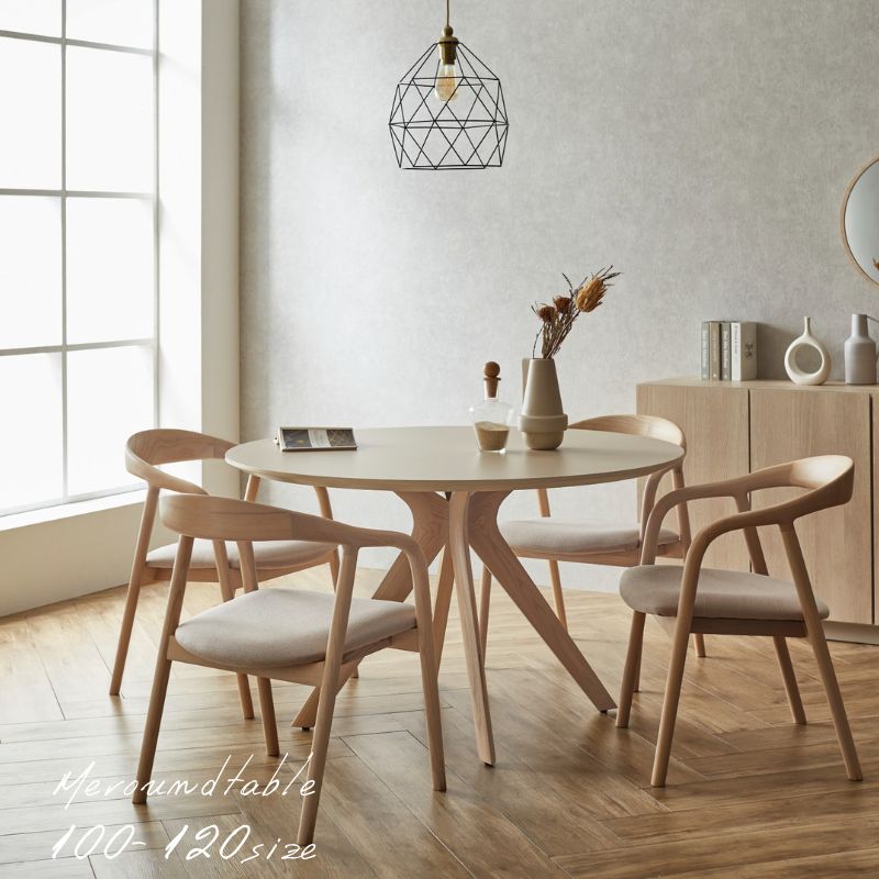 アッシュ材の脚を使用した高級感と温かみを感じさせるラウンドテーブルです。テーブル天板は特殊の船底加工により薄めに感じられるすっきりとシャープな印象になっています。