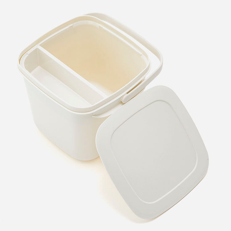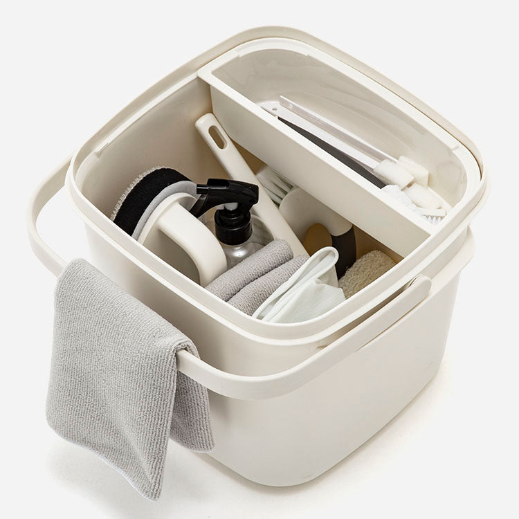 掃除道具や日用品、おもちゃの収納にちょうどいいバケツです。スプレーボトルや小さなスポンジやブラシなどの小物が迷子にならない小物ケースがついています。フタ付きで2個重ねて収納することも可能です。