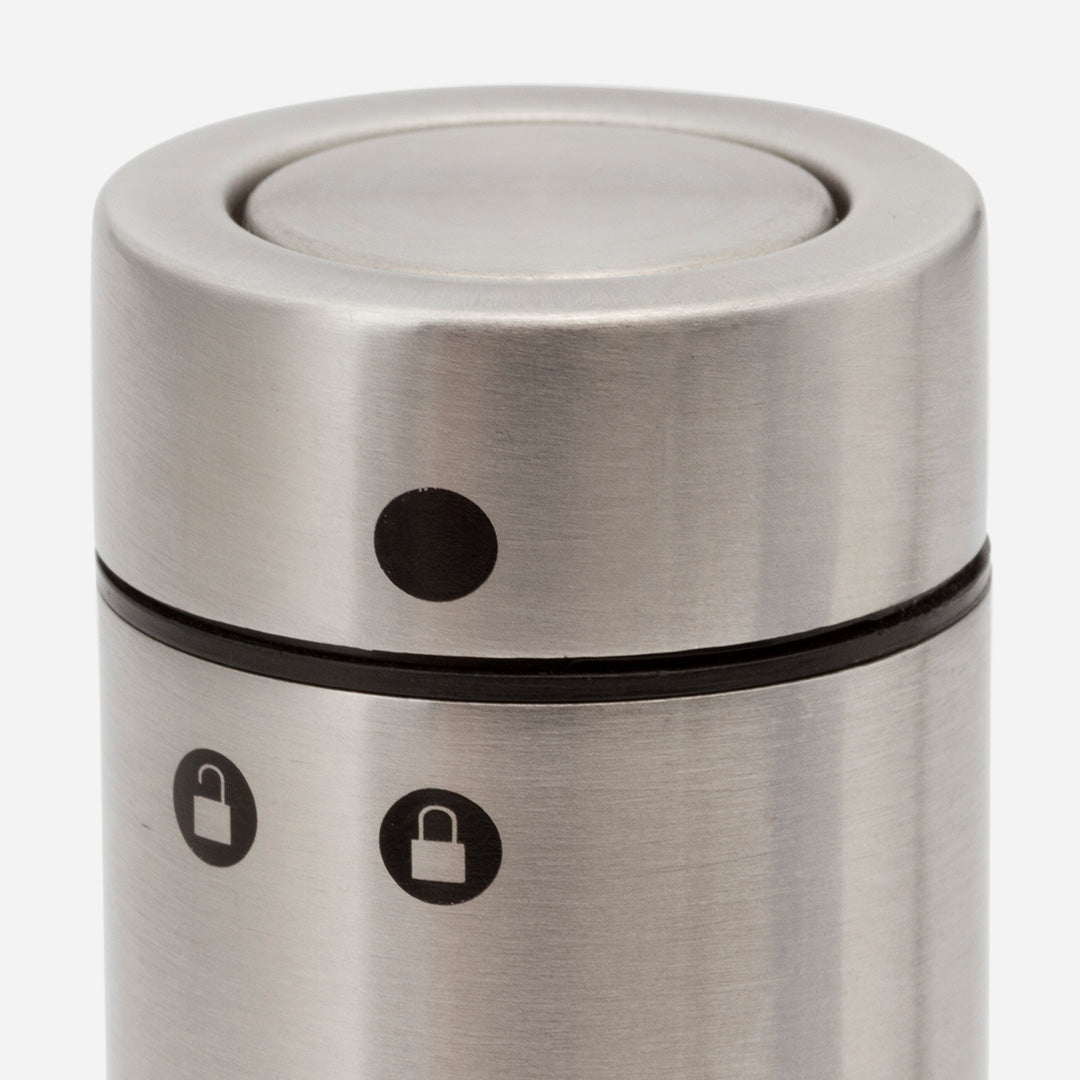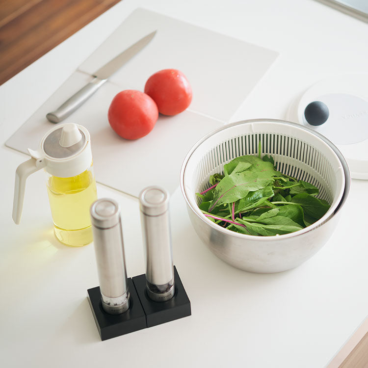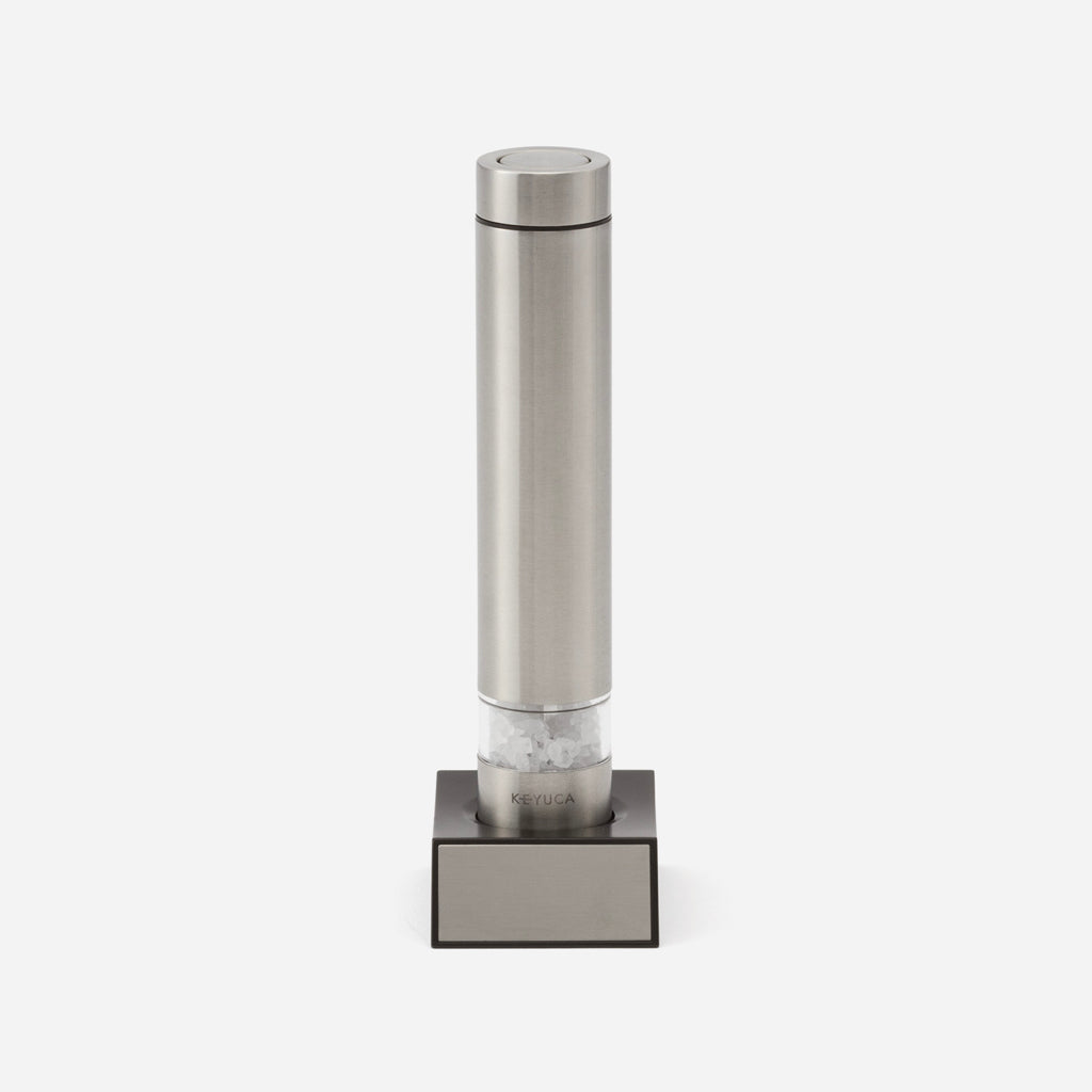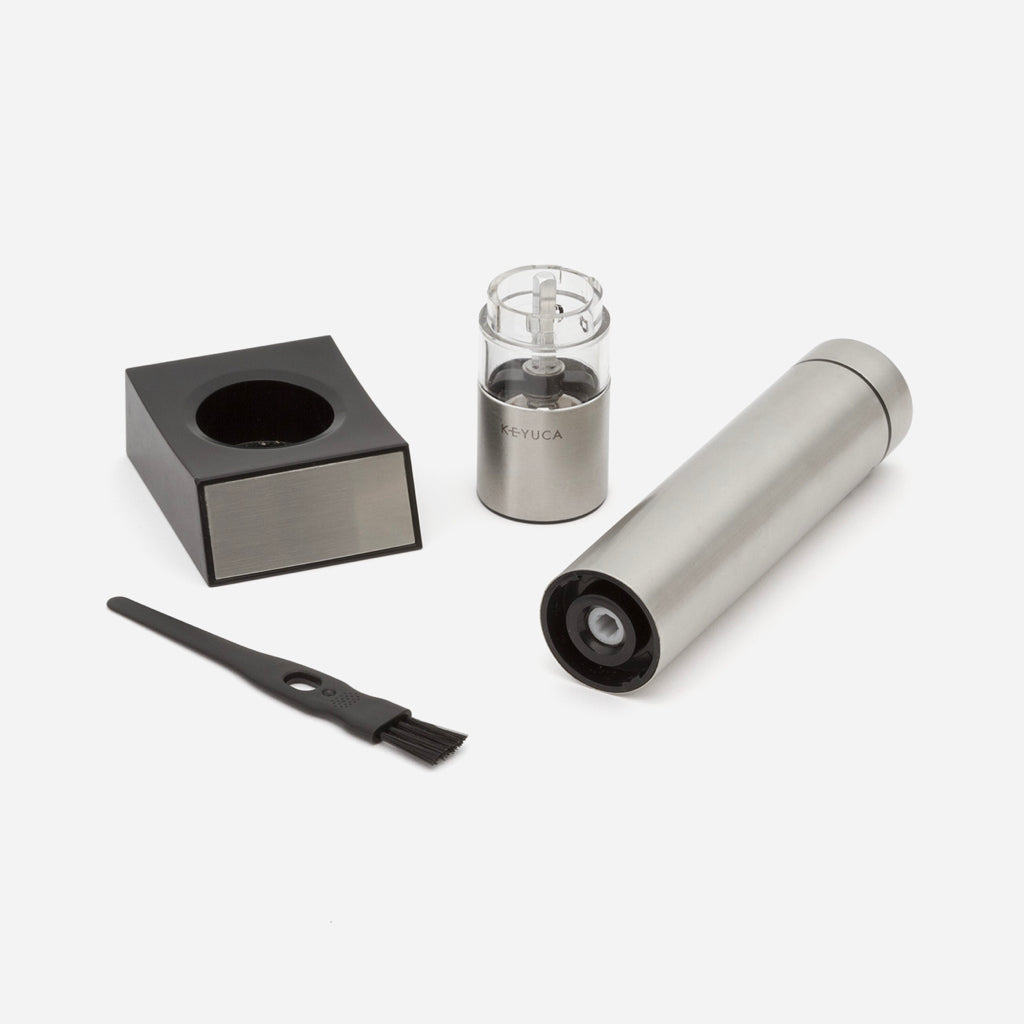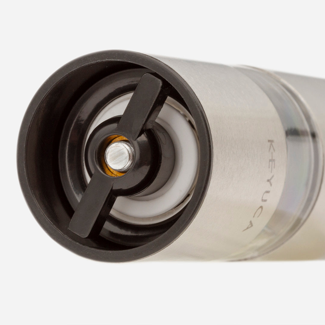 インテリアに馴染むスタイリッシュなステンレス製の電動ミルです。片手でワンプッシュで利用でき、料理中も片手でラクラク挽けます。つまみを回して粗さの調節も可能です。残量が見える透明キャビンが特徴です。