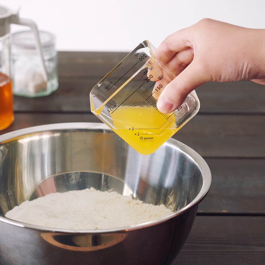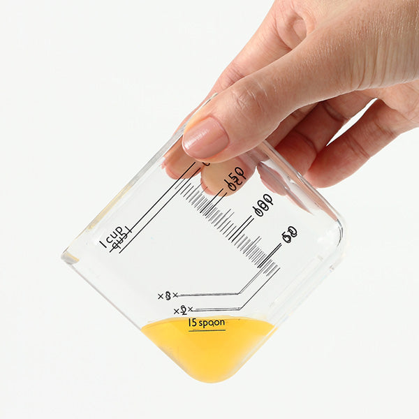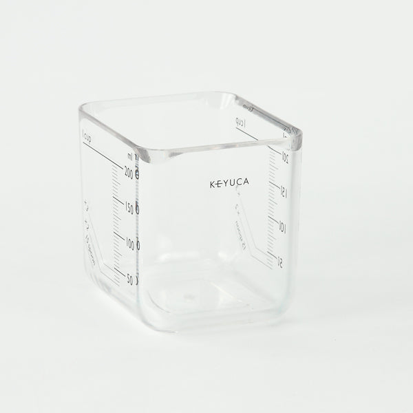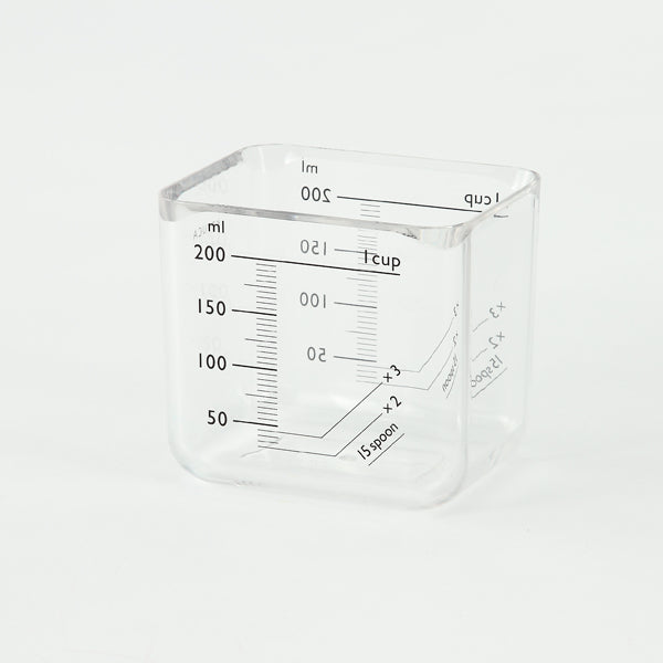 コンパクトなキューブ形状で洗いやすく、スッキリと収納できる計量カップです。透明度が高くて熱に強いポリカーボネート製です。電子レンジでも使用可能です。