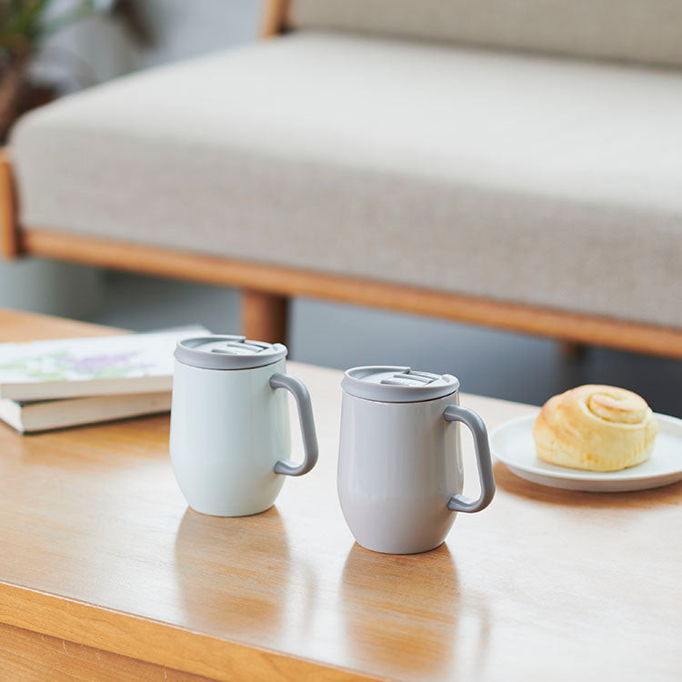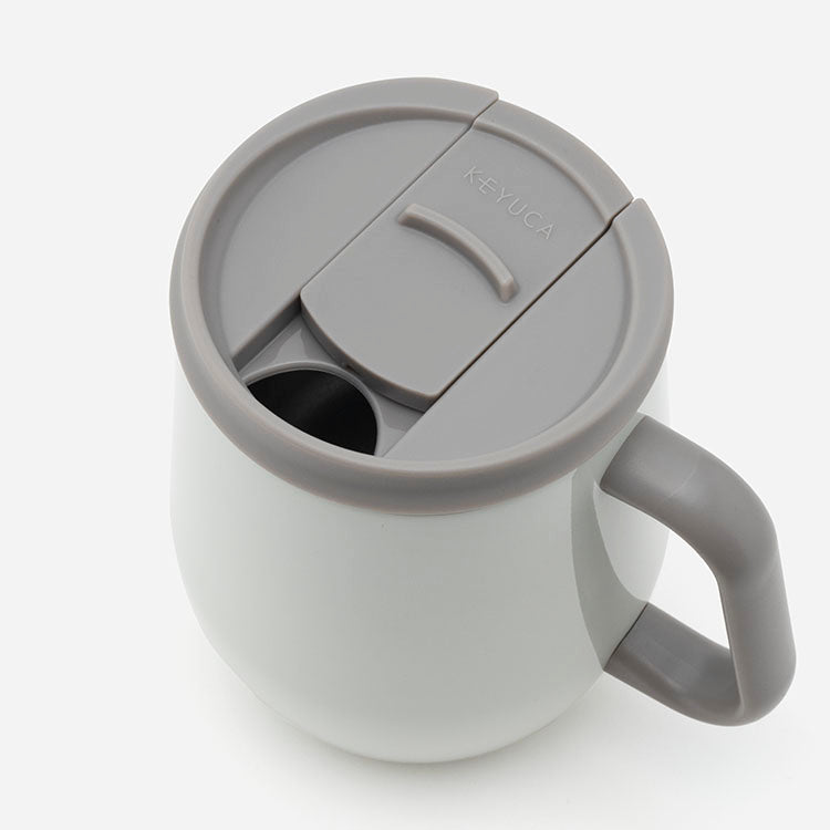 適温を保つフタ付きのステンレスマグです。フタは開け閉めしやすいクリック感のあるスライド式で、飲み口の大きさを2段階で調節することができます。