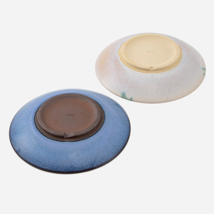 萩焼の青が引き立つ面白みあるうつわです。釉薬をペイントするように垂らしたプレートと、釉薬が形に添って垂れ、いろいろな青が混ざったような深い青色に仕上がったプレートのシリーズです。