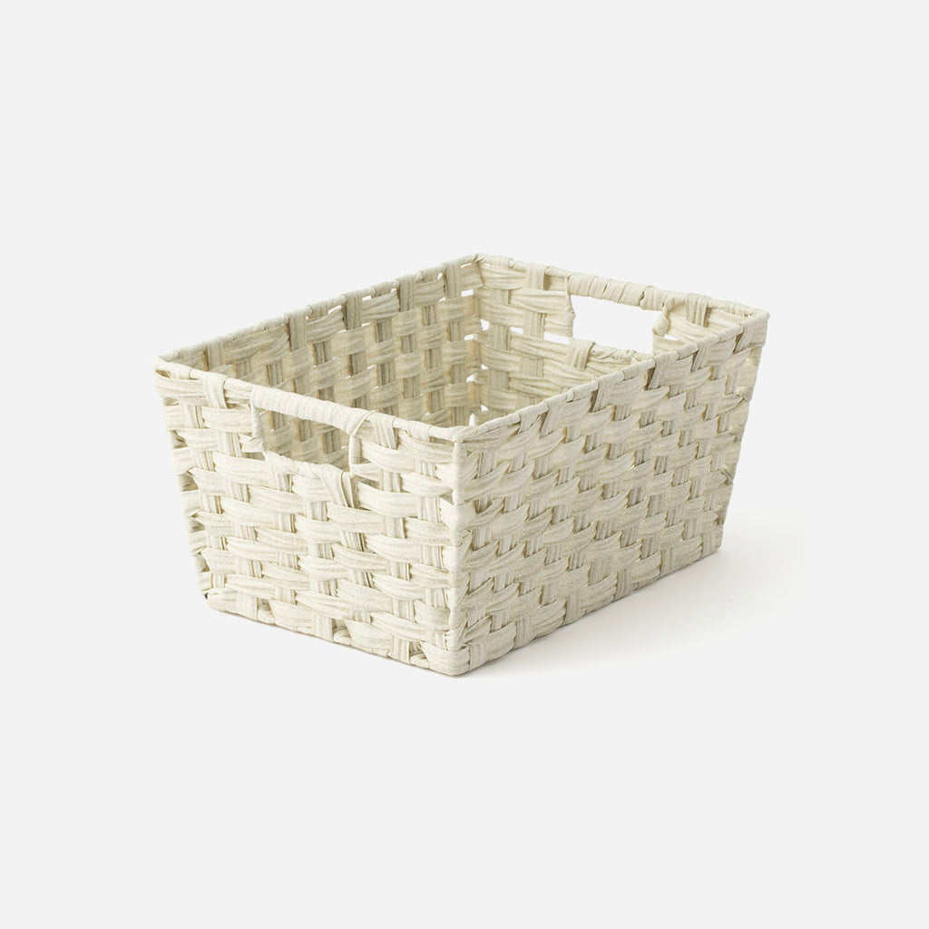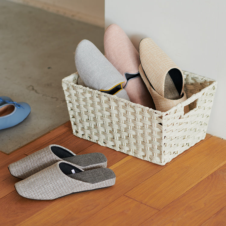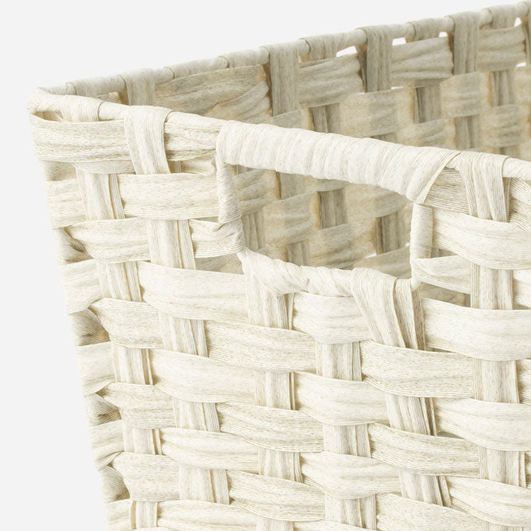 平織りで編まれた樹脂製の収納ボックスです。樹脂製ですが、紐の色味を1色の構成ではなく、よく見るとホワイトとライトグレーのような色がまざった紐で編み、質感も極力つやを抑えた仕上がりにすることで、ナチュラルなテイストに仕上がっています。