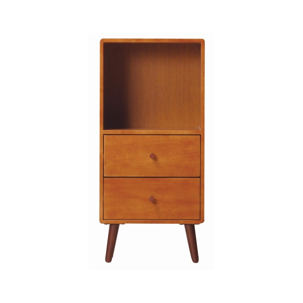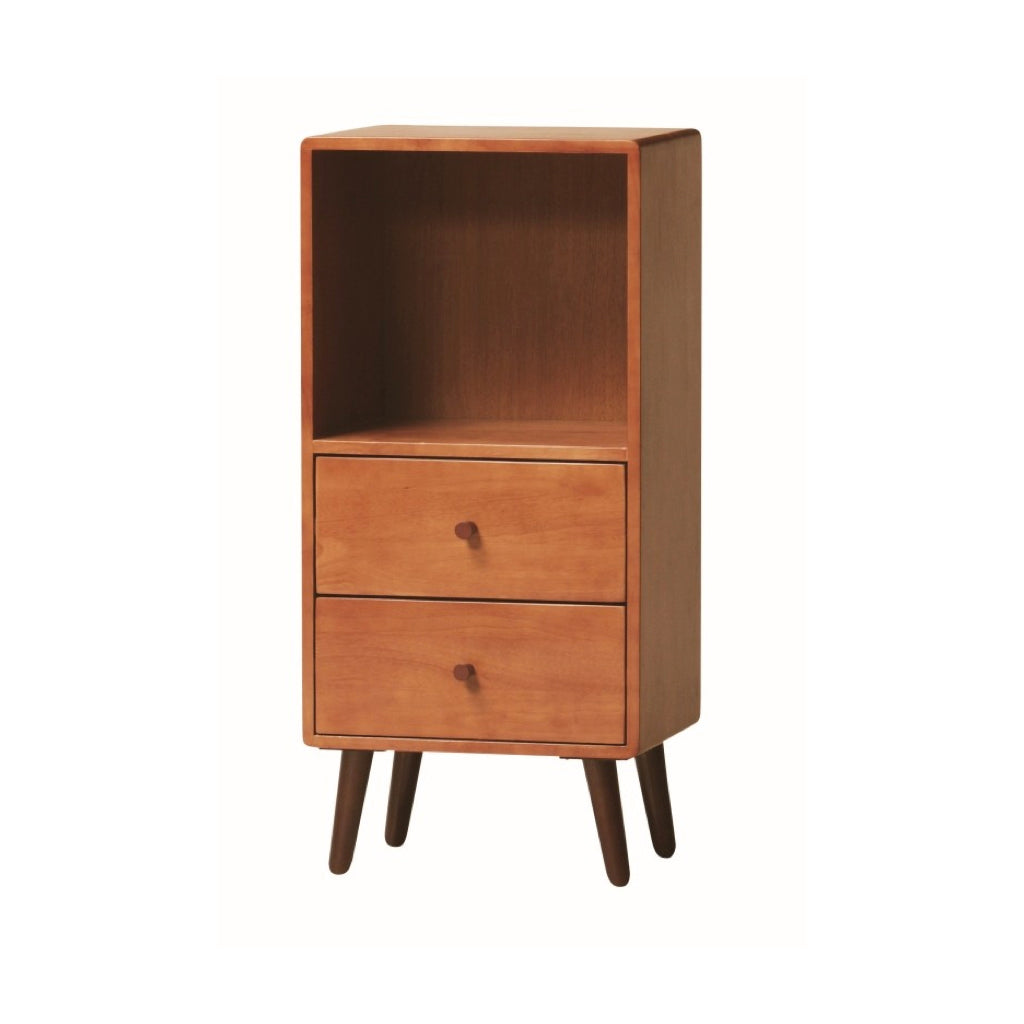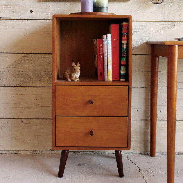 暖かなブラウンカラーと、コンパクトなサイズ感で一人暮らしのお部屋などにぴったりのリビングシリーズKOKOAのチェストです。チェストは角の丸みが特徴の柔らかいデザインをしています。雑誌を収納できるオープンスペース部と2杯の引き出しがついています。脚がついているため、一番下の引き出しも使いやすい高さに。床掃除も楽々です。4本の足と引き出しの取っ手をとりつけるだけで完成するので、組立が簡単です。