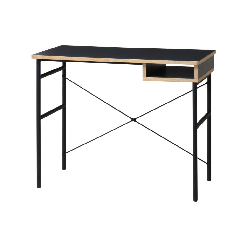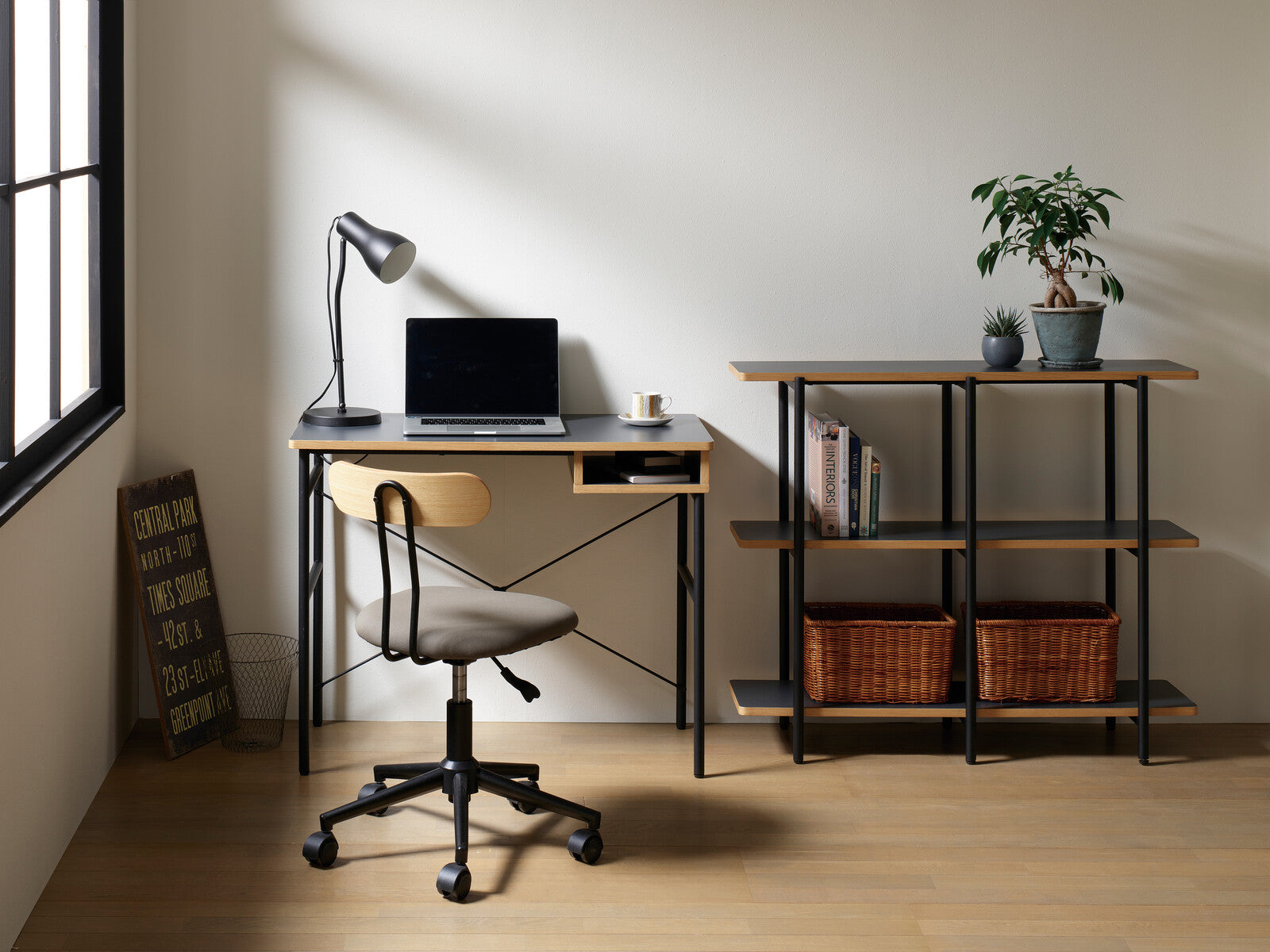 人の手によって良質な日用品や雑貨が生み出される北欧のクラフトのデスクです。そこで使われるシンプルで実用的なアイテムを日常に取り入れることで、STUDIOシリーズはスマートで豊かな暮らし/空間を提供します。耐久性の高いメラミンとスチールの組み合わせ、アクセントにオーク材を使用し工房らしさを表現しています。幅900mmのデスクです。クロスバーを組み替えることで、棚板は左右どちらでも使用できます。脚部にアジャスター付。