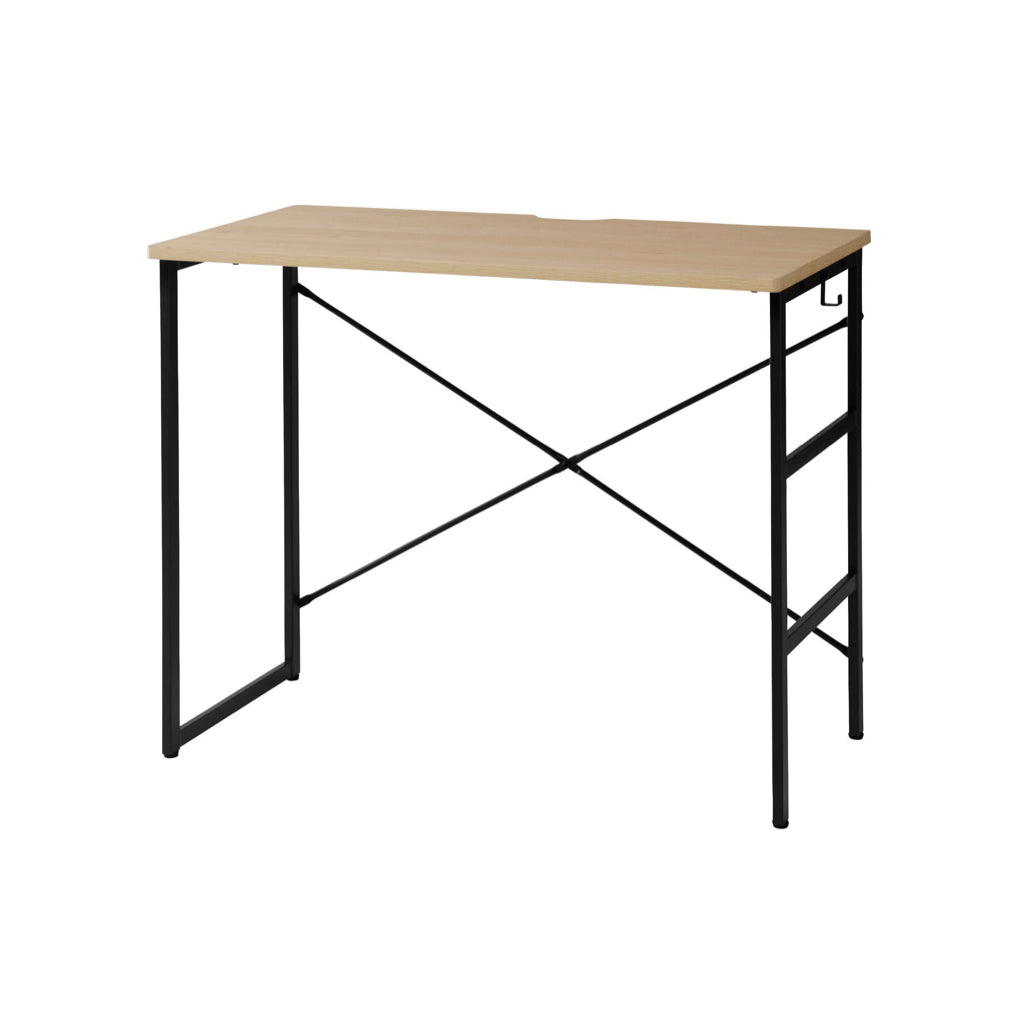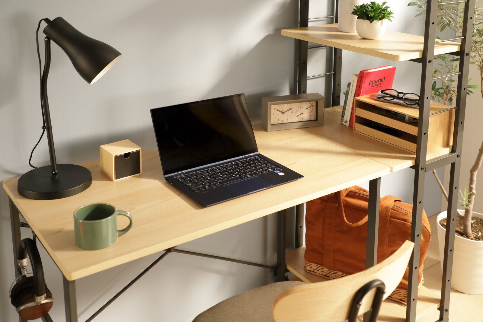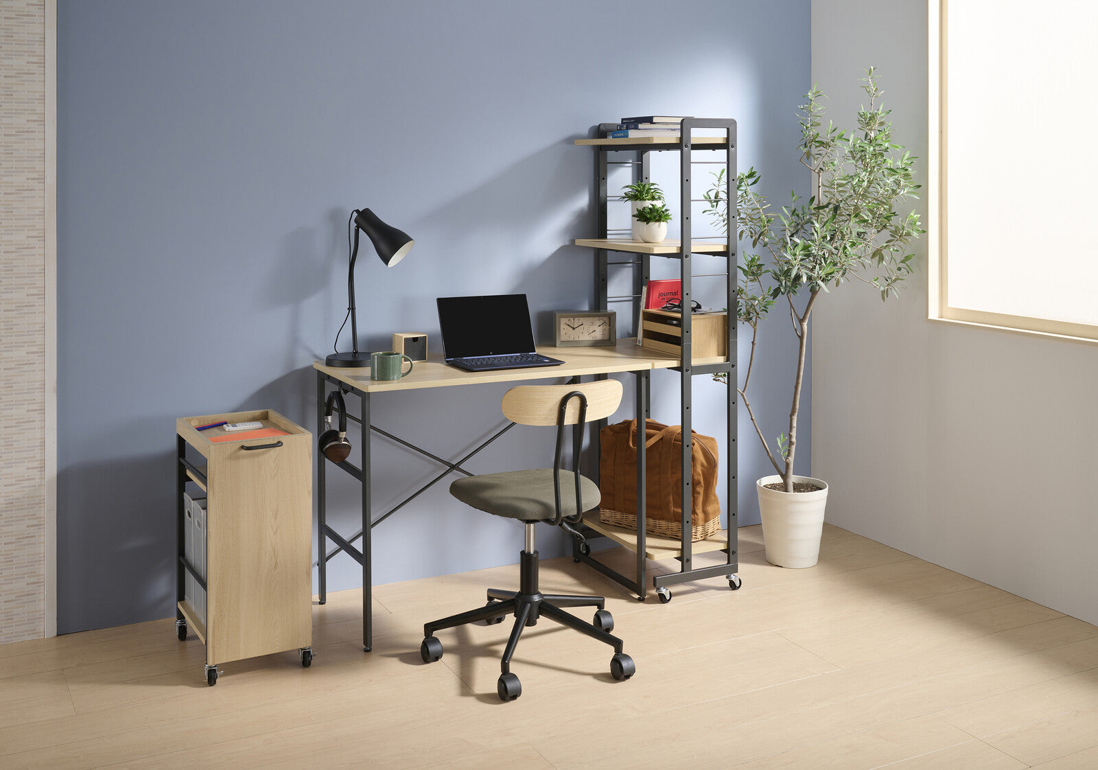 淡いブラックのフレームに使いやすい機能をデザインとして落とし込んだデスクです。落ち着いた木目柄と合わせる事で成立するモダンなインテリアです。コンパクトな幅900mmサイズと、広々と作業できる幅1400mmサイズの2型をご用意しています。開口部の広いフレームはラックと隣り合わせで使用した際に、下部の荷物を取り出しやすい仕様です。天板には配線穴を設けており、壁に付けての使用時でもケーブル類の管理に役立ちます。天板は傷や熱、汚れに強いメラミン化粧板を採用しております。フック側のフレームには引っ掛けた鞄等が揺れない様にフレーム数を増やしています。
