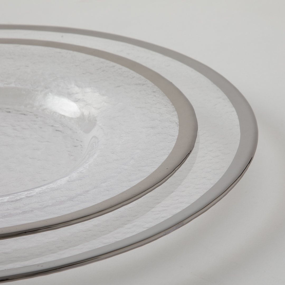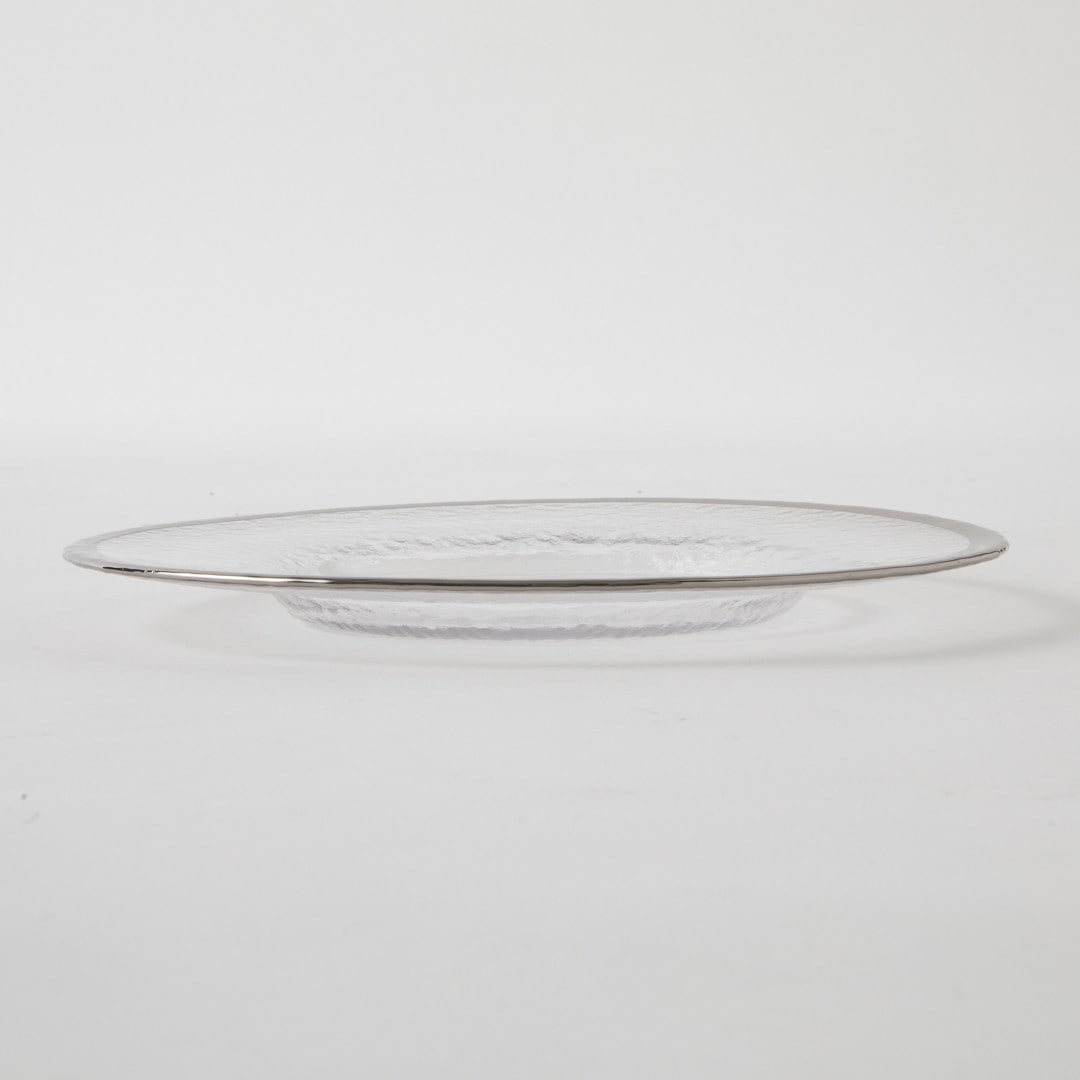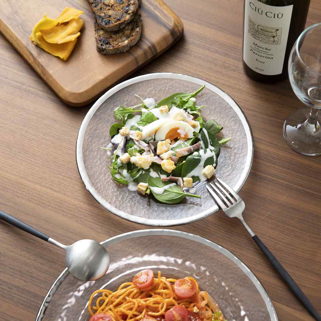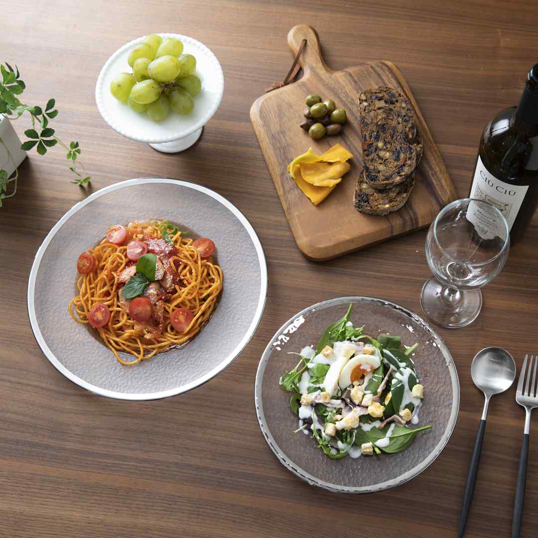 涼しげで高級感のあるガラスプレート 食器は、料理ごとだけでなく季節ごとに変えることでより美味しく楽しむことができます。こちらのガラスプレートは夏にぴったりな1枚で、シンプルかつ涼しげな雰囲気に仕上がっているのが特徴です。涼しさだけでなく高級感もあるプレートとなっているので、ちょっとしたお祝いの席やおもてなしの際にも活用できます。サラダやお刺身などを盛り付けるのにぴったり シンプルで透明感のあるこのガラスプレートは、いろいろな料理を盛り付けることができます。サラダやお刺身、カルパッチョなどにぴったりなプレートですが、その他スイーツやフルーツ、パスタなどを盛り付けるのにもおすすめです。シンプルなプレートなので、カラフルな料理が映えてとても美しく仕上がるでしょう。暑い夏には、アイスクリームやシャーベットを乗せて食べると、涼しさを感じながら過ごすことができます。レストランのようにきれいに料理を盛り付けることができる 普通に盛り付けているのにレストランのような仕上がりになる、そんな魔法がかかったようなプレートでもあるこちらの商品は、リムが広く作られているため盛り付けがプロ並みになります。リムのおかげで、様々な料理をより美味しくおしゃれに盛り付けることができるのです。シルバーラインが幻想的な雰囲気を演出している こちらのプレートは、シルバーラインが美しく、より料理を引き立たせてくれます。凹凸を感じられるガラス部分が幻想的であり、シルバーラインが神秘的な雰囲気も醸し出しているようです。光の加減で見え方が異なり、その美しさを感じながら料理を味わうことができるでしょう。2種類のサイズからより使い勝手の良いものを選ぼう いろいろな料理を乗せて楽しめるこのプレートは、サイズが2種類あります。デザートやサラダを乗せるのにぴったりな直径 22cm、パスタやカルパッチョなどのメインディッシュを乗せるのおすすめな直径28cmとがあります。Sサイズ、Mサイズという表記がされているため、どんなときに使うことが多いか、どんな料理を盛り付けたいかなど考えながらじっくり選んでみましょう。
