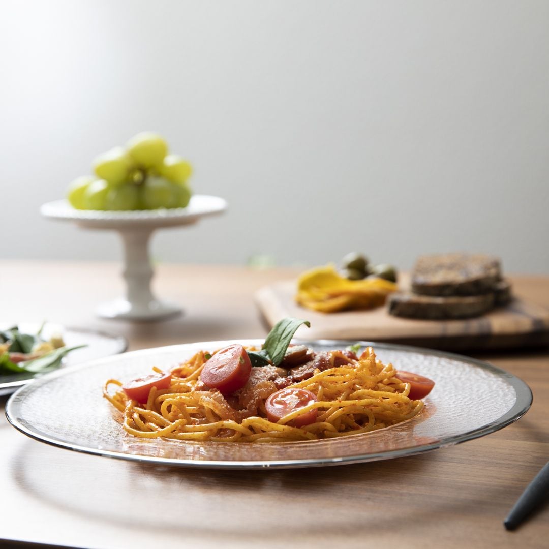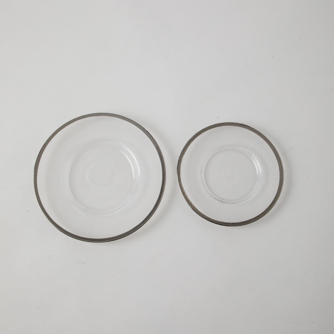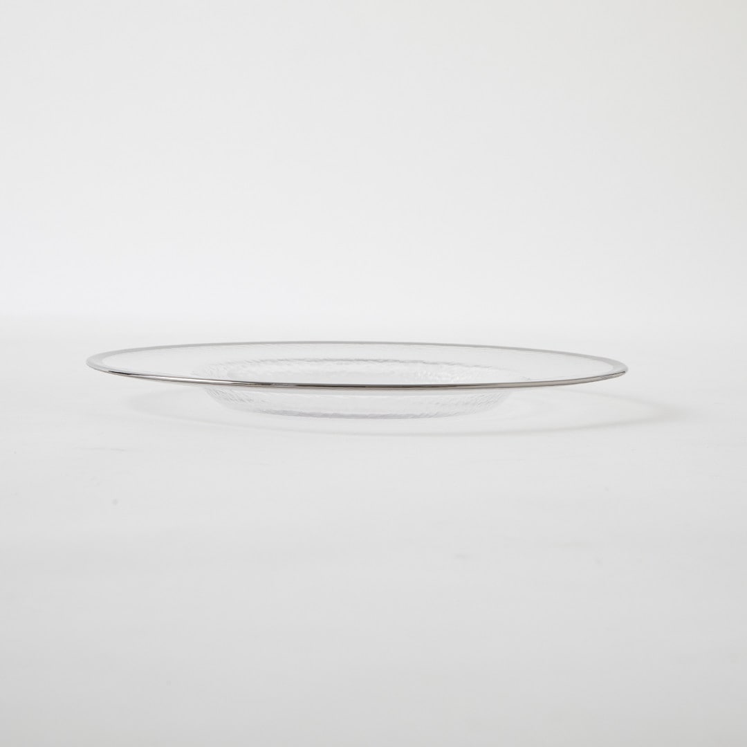 涼しげで高級感のあるガラスプレート 食器は、料理ごとだけでなく季節ごとに変えることでより美味しく楽しむことができます。こちらのガラスプレートは夏にぴったりな1枚で、シンプルかつ涼しげな雰囲気に仕上がっているのが特徴です。涼しさだけでなく高級感もあるプレートとなっているので、ちょっとしたお祝いの席やおもてなしの際にも活用できます。サラダやお刺身などを盛り付けるのにぴったり シンプルで透明感のあるこのガラスプレートは、いろいろな料理を盛り付けることができます。サラダやお刺身、カルパッチョなどにぴったりなプレートですが、その他スイーツやフルーツ、パスタなどを盛り付けるのにもおすすめです。シンプルなプレートなので、カラフルな料理が映えてとても美しく仕上がるでしょう。暑い夏には、アイスクリームやシャーベットを乗せて食べると、涼しさを感じながら過ごすことができます。レストランのようにきれいに料理を盛り付けることができる 普通に盛り付けているのにレストランのような仕上がりになる、そんな魔法がかかったようなプレートでもあるこちらの商品は、リムが広く作られているため盛り付けがプロ並みになります。リムのおかげで、様々な料理をより美味しくおしゃれに盛り付けることができるのです。シルバーラインが幻想的な雰囲気を演出している こちらのプレートは、シルバーラインが美しく、より料理を引き立たせてくれます。凹凸を感じられるガラス部分が幻想的であり、シルバーラインが神秘的な雰囲気も醸し出しているようです。光の加減で見え方が異なり、その美しさを感じながら料理を味わうことができるでしょう。2種類のサイズからより使い勝手の良いものを選ぼう いろいろな料理を乗せて楽しめるこのプレートは、サイズが2種類あります。デザートやサラダを乗せるのにぴったりな直径22cm、パスタやカルパッチョなどのメインディッシュを乗せるのおすすめな直径28cmとがあります。Sサイズ、Mサイズという表記がされているため、どんなときに使うことが多いか、どんな料理を盛り付けたいかなど考えながらじっくり選んでみましょう。