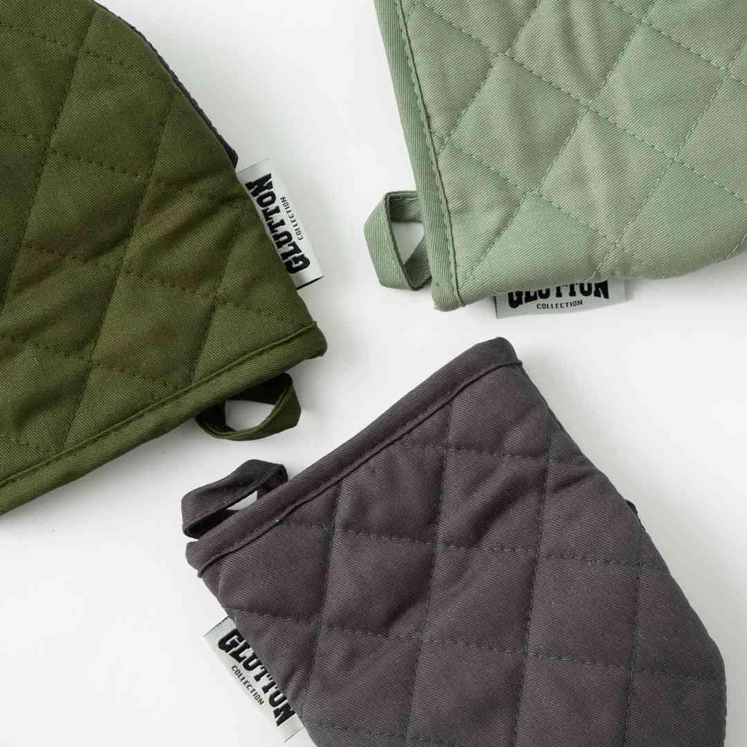 アツアツの料理も安心して取り出せる。かわいい見た目の実力派オーブンミット オーブンや直火で調理したできたてアツアツの料理を、安心して取り出せる・持ち運べるオーブンミットです。耐熱温度は、驚きの180℃。熱伝導率の高いグラットンシリーズのスキレットやラウンドパンなども、安心して持つことができます。パペットのようなかわいらしい見た目ながら、手を熱さからしっかりと守ってくれる頑丈な作りになっており、信頼感は抜群。グラットンシリーズの調理器具を持っているなら、オーブンミットも合わせて使うことで、よりおしゃれに見せることができます。キュートなデザインの耐熱オーブンミットを探している人にもおすすめです。小ぶりで使いやすいから、アウトドアでも大活躍。グラットン オーブン ミットは、普段の料理はもちろん、アウトドアでも大活躍してくれます。小ぶりで使いやすく、付け外しがスムーズにできるので、キャンプなどでの料理中のワンシーンをスマートに演出してくれるでしょう。「アウトドア料理には、ダッチオーブンやスキレットが欠かせない。」という人は、ぜひグラットン オーブン ミットの魅力を実感してみてください。掴む部分がゴム製で滑りにくいのも安心ポイント 掴む部分は、滑りにくいゴム製でできています。スキレットなどの持ち手をしっかりと掴めるから、アツアツの料理も安全に運べます。重たい鍋蓋を開けるときにも便利で、一枚あると重宝するアイテムです。引っ掛け収納ができるループ付き ループが付いているので、フックなどに引っ掛けて収納することができます。おしゃれなオーブンミットだからこそ、見せる収納ができるのはうれしいですね。すぐに手の届く場所に掛けておけば、調理中でもサッと使えて便利です。アウトドアでもキッチンでもおしゃれに決まる、3種類のカラーバリエーション カラーバリエーションは、カーキ・フォレストグリーン・ダークグレーの3種類。いずれも、アウトドアの大自然に違和感なく溶け込む、ナチュラルで落ち着いたカラーです。テントや折り畳みチェアなど、手持ちのキャンプ用品ともテイストを合わせやすいのがうれしいですね。また、キッチンで見せる収納をするなら、おしゃれなインテリアになることもポイント。白を基調とした清潔感のある明るいキッチンなら、カーキがなじみやすいでしょう。空間にアクセントを与えたい場合には、あえてフォレストグリーンやダークグレーの濃いカラーを選ぶのもおすすめです。シンプルでモダンな印象のキッチンなら、3色どれを選んでも雰囲気にマッチするので、好みに合う色を選んでみてください。