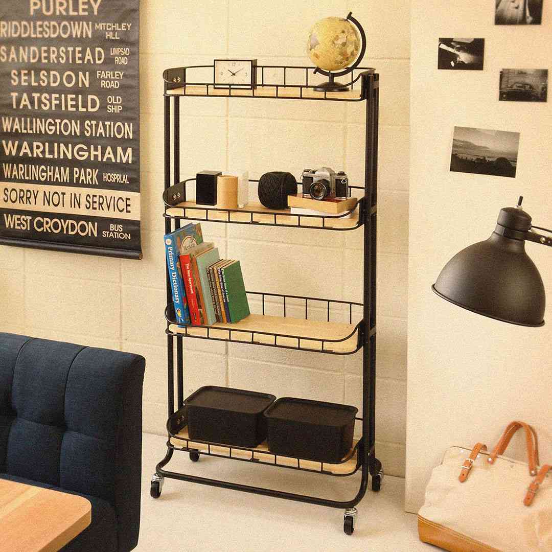 自転車カゴをイメージしたレトロなラック 小物や日用品の収納に便利なラック、どこのご家庭にもあるでしょう。便利なラック、機能面だけでなくデザインもおしゃれでかわいいものが良いという人にぴったりなのが、「バイケージラック」です。どこかレトロな雰囲気が感じられるラックで、自転車カゴをイメージして作られているのがポイントです。アイアンとパインウッドの組み合わせがおしゃれで、一つ置いてあるだけでリラックスできるようなデザイン性も魅力となっています。4段あるうえにカゴが大きめなのでたっぷりものを入れられる ラックには収納力を求める、そんな人にも満足してもらえるのがこちらのラックです。全部で4段あり、カゴ一つずつが大きめに作られているため、たっぷりものを入れることができます。段ごとに収納するものを分けておけば、必要なものを取り出しやすく、また片づけもスムーズにできるでしょう。高さのあるものもきちんと収納できるサイズ感 こちらのラックは、段と段の間に適度な高さがあるため、少し背のあるものも快適に収納することができます。ペットボトルや瓶をはじめ、A4サイズのファイルもきちんと収まるサイズ感です。書類などがきれいに収まるラックということで、キッチンやリビング以外にデスクの隣や作業場などに置くのも良いでしょう。各段に敷いてあるパインウッドがナチュラルな雰囲気 4つの段に、高さのあるものもすっきりまとめることができる「バイケージラック」は、各段の底に敷いてあるパインウッドが特徴的です。パインウッドが一枚敷いてあるだけでナチュラルな雰囲気になり、温かみも感じられるようになります。シンプルだけどどこか温かい、そんな空間を作ることができるラックです。どのカラーも空間によく合うのがポイント パインウッドが素敵なだけでなく、アイアン部分のカラーにもこだわることでより空間に馴染むラックとなります。ブラックやホワイトと定番のカラーがそろっているため、設置したい場所に合わせてよりぴったりくるカラーを選んでみましょう。