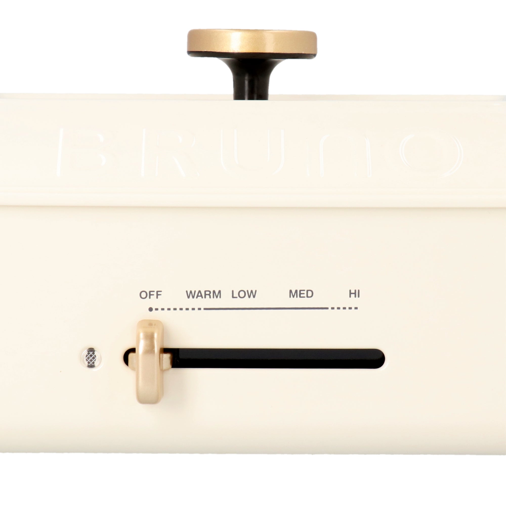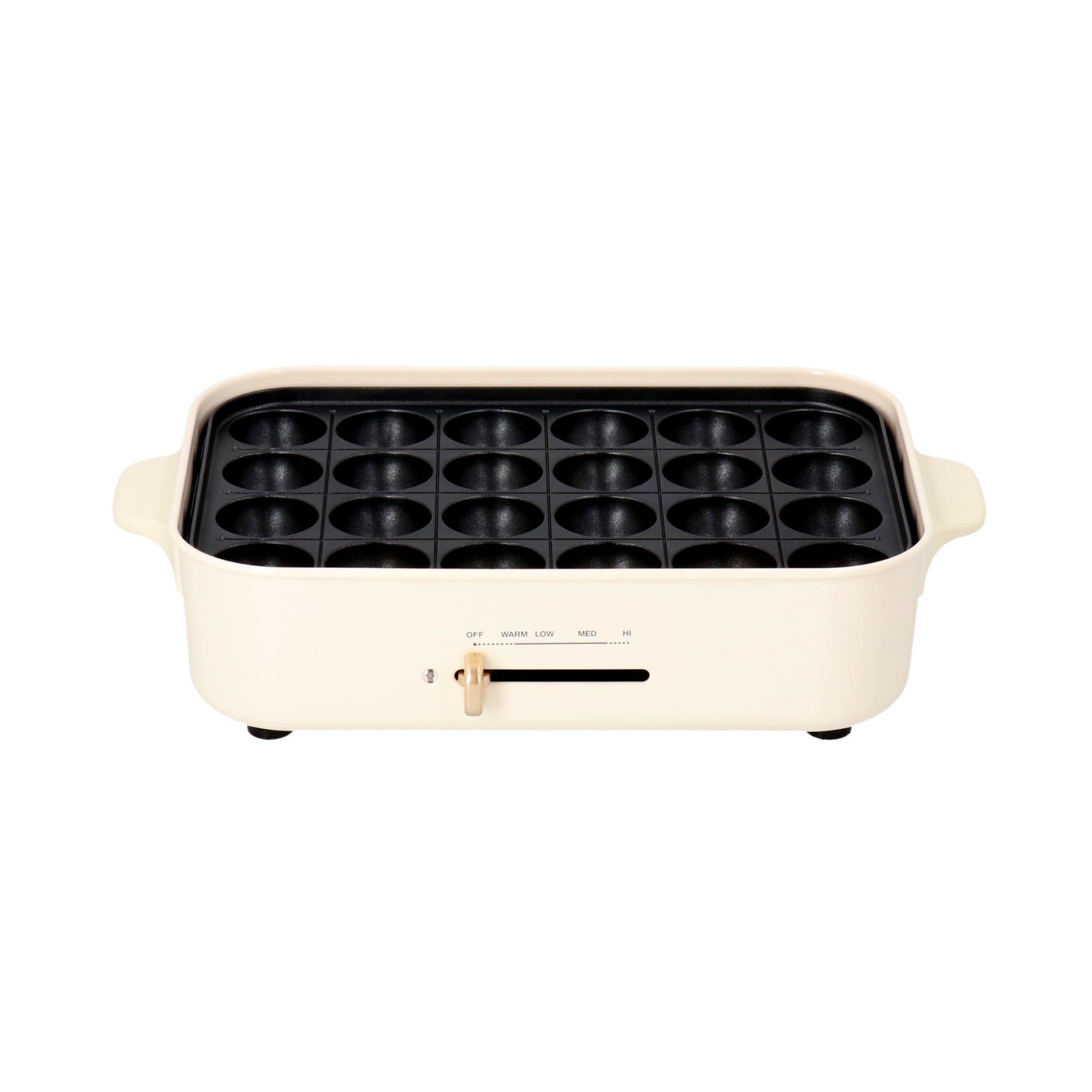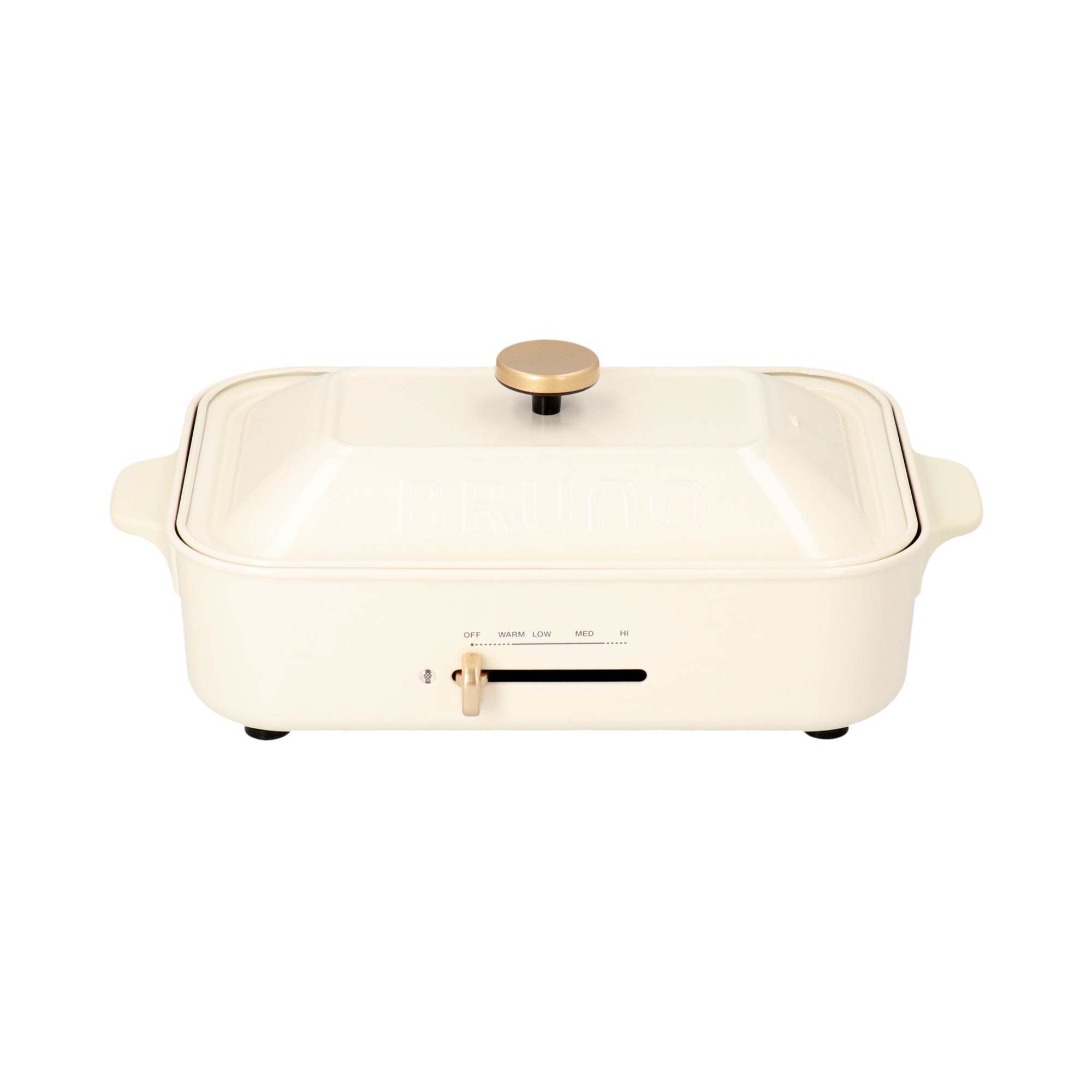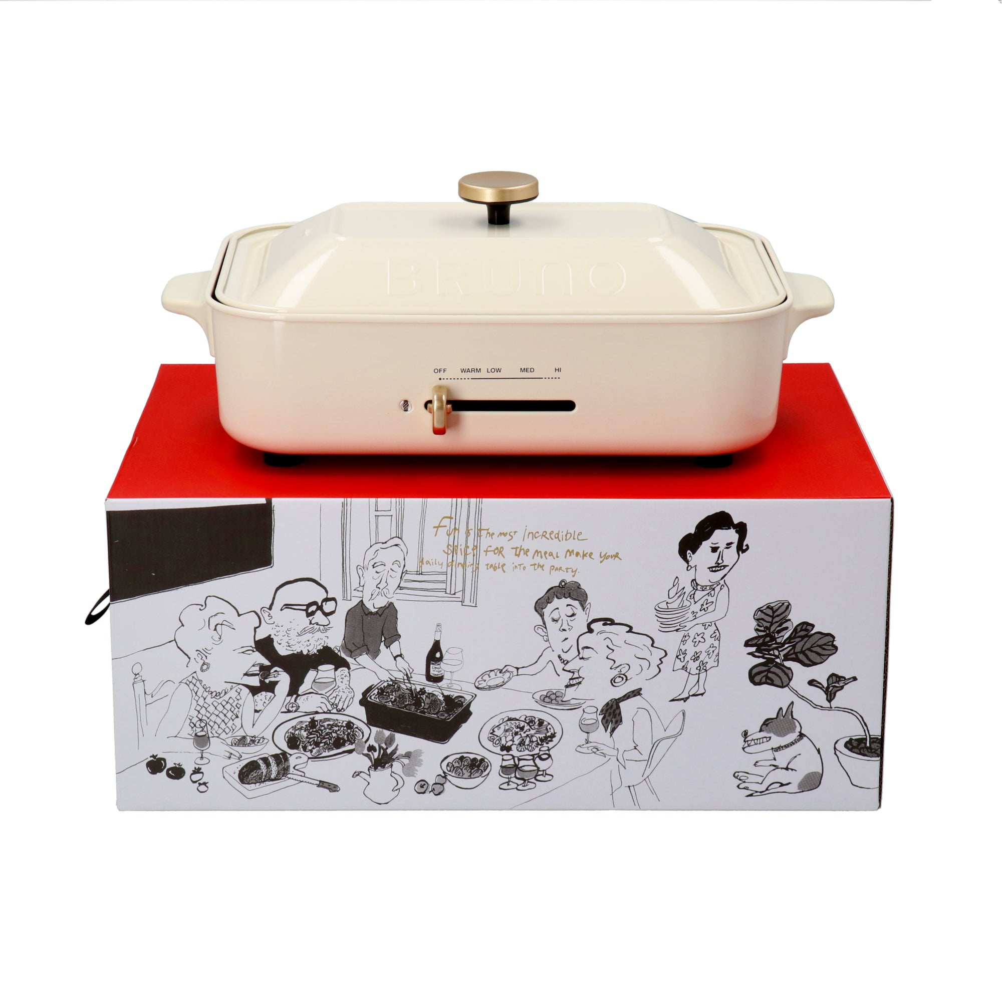 毎日使えるホットプレートの新定番 今までのホットプレートにはなかったお洒落さが自慢。思わず友達を呼びたくなるBRUNO コンパクトホットプレート。愉しみ上手な大人が集い生まれた、ライフスタイルブランド「BRUNO(ブルーノ)」 。今までのホットプレートは、大きくて食卓を占領してしまったり、小さすぎて作れる量が少なかったり…そんな不満を解消してくれる、2~3人用のちょうどいいサイズ感が魅力のコンパクトホットプレート。鋳物ホーローをイメージしたデザインはテーブルウエアのように食卓を彩り、1人暮らしでも、家族の食事にも、毎日使える「新しい」ホットプレートの形です。セット内容 本体、平面プレート、たこ焼きプレート、電源コード、木べらがセットになっています。アイデア広がる2枚のプレート フッ素樹脂コートの平面プレートとたこ焼きプレートの2種類。「焼く」はもちろん、フタを使って「蒸す」もおしゃれにこなします。2枚のプレートを使い分けて、前菜からデザートまで幅広いレシピの出来立てをその場でシェアしましょう。プレートは、取り外して丸洗いが出来るので、お手入れもラクラクです。コンパクトで置きやすい A4サイズほどしか場所をとらないので、テーブルに置いても圧迫感がなく、まるでテーブルウエアのひとつのよう。テーブルの上で調理できるので、朝食の準備の手間が省けて忙しい朝に嬉しいアイテムです。また、大人数での食卓では、他の料理も楽しみつつプラスワンメニューをホットプレートで作るという使い方も◎。平面プレートは、3枚のホットケーキを同時調理可能で、定番のお好み焼きや餃子、パエリアなどにも最適なベーシックなプレートです。マルチに使えるたこ焼きプレート 24個のたこ焼きが一度にできるたこ焼きプレート。たこ焼き以外にも、アヒージョやベビーカステラ、手作りしゅうまい、オムレツや焼きおにぎりなどアイデア次第でマルチに使えます。色とりどりの食材を使えば華やかな食卓を演出してくれるので、ホームパーティーで活躍してくれそうですね。最大250℃。美味しく仕上げる本格機能 保温~250℃まで無段階調整ができ、本格的なレシピも作れる満足の温度。温度の目盛りは、料理を保温するのに適した「WARM(65~80℃)」。クレープやパンケーキの調理に適した「LOW(100~130℃)」。たこ焼きやハンバーグなどの調理に適した「MED(160~200℃)」。ステーキやお好み焼きなどの調理に適した「HI(190~250℃)」の4段階。スライド式なので、“「MED」と「HI」の中間の温度”といった設定もできます。また、温度の上がり過ぎを防ぐサーモスタット付きで、自動で設定温度を維持してくれます。食卓に映える3カラー カラーは、ホワイト、ネイビー、レッドの3色。本体のフォルムはもちろん、フタにあしらわれた「BRUNO」のロゴ、大きなゴールドの取っ手や温度調節レバーもアクセントになっています。引っかかっても安心のマグネット式コンセント プラグ受けは本体右側面にあり、コンセントはマグネット式。万が一コードに足をひっかけても、簡単に外れるようになっているので安心です。※コードの長さは1.8mです。便利な木べら付き 具材を混ざるのに便利な木べらは、逆さにすると本体に設置したプレートの取り外しにも使える優れものです。お洒落なイラスト入りパッケージ 側面に入ったお洒落なイラストが目を引くパッケージデザイン。本体使用後は、パッケージをそのまま収納箱としてすっきり収納も出来ちゃいます。ご家庭用にはもちろん、大切な方への贈り物にもおすすめです。安心の保証付き お買い上げから1年間の保証付きの説明書が付属しています。※ご使用前に必ず説明書をお読みください。最後までご覧いただきましてありがとうございます。見た目もお洒落でコンパクトサイズなので収納にも困らないのが嬉しいポイント。これならキッチンの棚に出しっぱなしでもありですね。毎日のお料理で上手に活用すれば、簡単でお洒落なお料理のレパートリーが一気に増えそうですね。