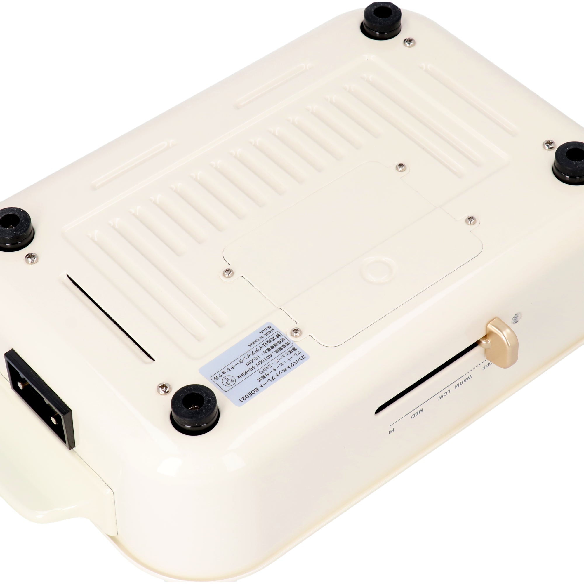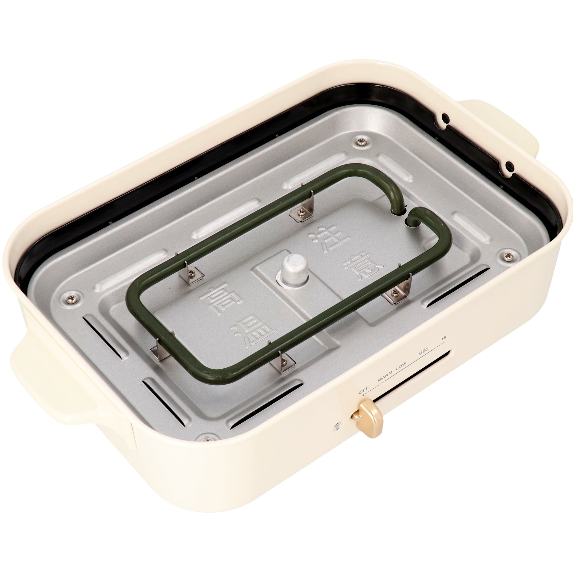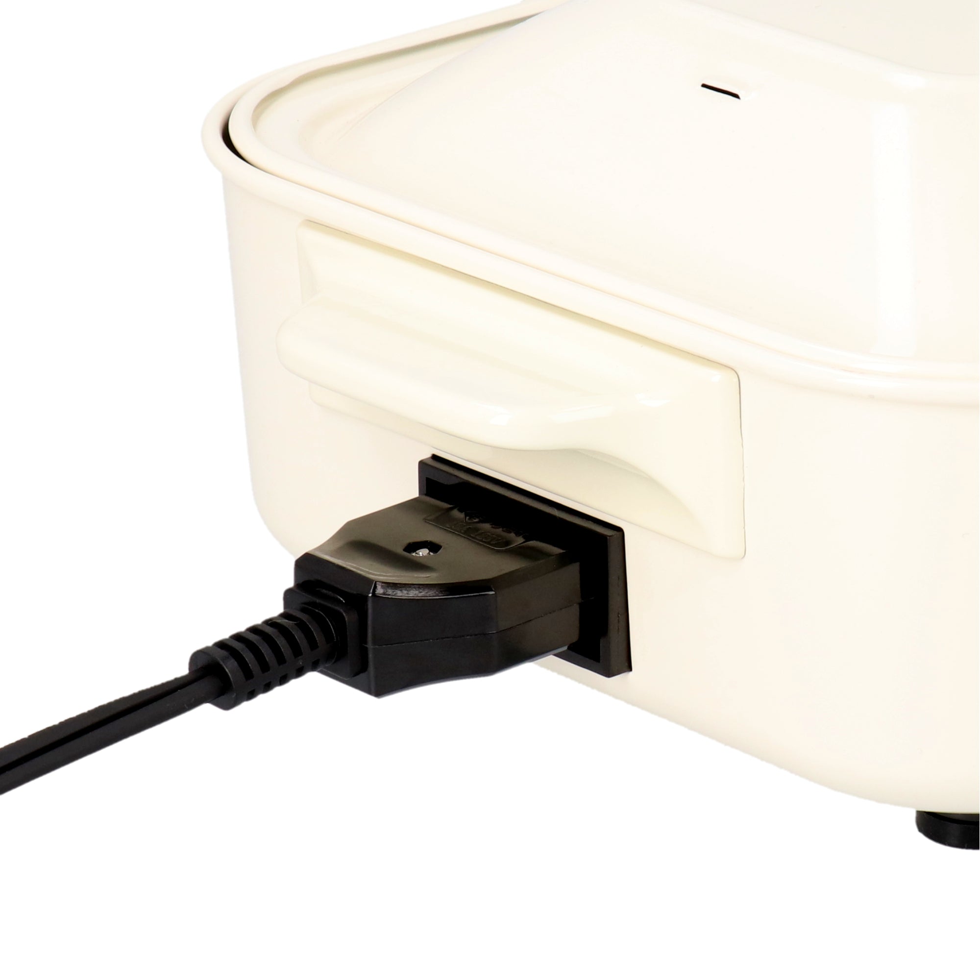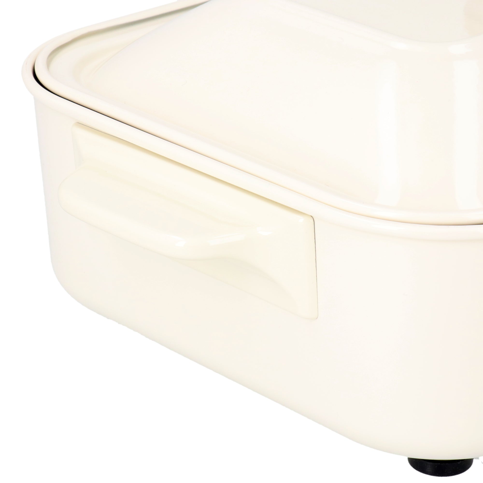 毎日使えるホットプレートの新定番 今までのホットプレートにはなかったお洒落さが自慢。思わず友達を呼びたくなるBRUNO コンパクトホットプレート。愉しみ上手な大人が集い生まれた、ライフスタイルブランド「BRUNO(ブルーノ)」 。今までのホットプレートは、大きくて食卓を占領してしまったり、小さすぎて作れる量が少なかったり…そんな不満を解消してくれる、2~3人用のちょうどいいサイズ感が魅力のコンパクトホットプレート。鋳物ホーローをイメージしたデザインはテーブルウエアのように食卓を彩り、1人暮らしでも、家族の食事にも、毎日使える「新しい」ホットプレートの形です。セット内容 本体、平面プレート、たこ焼きプレート、電源コード、木べらがセットになっています。アイデア広がる2枚のプレート フッ素樹脂コートの平面プレートとたこ焼きプレートの2種類。「焼く」はもちろん、フタを使って「蒸す」もおしゃれにこなします。2枚のプレートを使い分けて、前菜からデザートまで幅広いレシピの出来立てをその場でシェアしましょう。プレートは、取り外して丸洗いが出来るので、お手入れもラクラクです。コンパクトで置きやすい A4サイズほどしか場所をとらないので、テーブルに置いても圧迫感がなく、まるでテーブルウエアのひとつのよう。テーブルの上で調理できるので、朝食の準備の手間が省けて忙しい朝に嬉しいアイテムです。また、大人数での食卓では、他の料理も楽しみつつプラスワンメニューをホットプレートで作るという使い方も◎。平面プレートは、3枚のホットケーキを同時調理可能で、定番のお好み焼きや餃子、パエリアなどにも最適なベーシックなプレートです。マルチに使えるたこ焼きプレート 24個のたこ焼きが一度にできるたこ焼きプレート。たこ焼き以外にも、アヒージョやベビーカステラ、手作りしゅうまい、オムレツや焼きおにぎりなどアイデア次第でマルチに使えます。色とりどりの食材を使えば華やかな食卓を演出してくれるので、ホームパーティーで活躍してくれそうですね。最大250℃。美味しく仕上げる本格機能 保温~250℃まで無段階調整ができ、本格的なレシピも作れる満足の温度。温度の目盛りは、料理を保温するのに適した「WARM(65~80℃)」。クレープやパンケーキの調理に適した「LOW(100~130℃)」。たこ焼きやハンバーグなどの調理に適した「MED(160~200℃)」。ステーキやお好み焼きなどの調理に適した「HI(190~250℃)」の4段階。スライド式なので、“「MED」と「HI」の中間の温度”といった設定もできます。また、温度の上がり過ぎを防ぐサーモスタット付きで、自動で設定温度を維持してくれます。食卓に映える3カラー カラーは、ホワイト、ネイビー、レッドの3色。本体のフォルムはもちろん、フタにあしらわれた「BRUNO」のロゴ、大きなゴールドの取っ手や温度調節レバーもアクセントになっています。引っかかっても安心のマグネット式コンセント プラグ受けは本体右側面にあり、コンセントはマグネット式。万が一コードに足をひっかけても、簡単に外れるようになっているので安心です。※コードの長さは1.8mです。便利な木べら付き 具材を混ざるのに便利な木べらは、逆さにすると本体に設置したプレートの取り外しにも使える優れものです。お洒落なイラスト入りパッケージ 側面に入ったお洒落なイラストが目を引くパッケージデザイン。本体使用後は、パッケージをそのまま収納箱としてすっきり収納も出来ちゃいます。ご家庭用にはもちろん、大切な方への贈り物にもおすすめです。安心の保証付き お買い上げから1年間の保証付きの説明書が付属しています。※ご使用前に必ず説明書をお読みください。最後までご覧いただきましてありがとうございます。見た目もお洒落でコンパクトサイズなので収納にも困らないのが嬉しいポイント。これならキッチンの棚に出しっぱなしでもありですね。毎日のお料理で上手に活用すれば、簡単でお洒落なお料理のレパートリーが一気に増えそうですね。