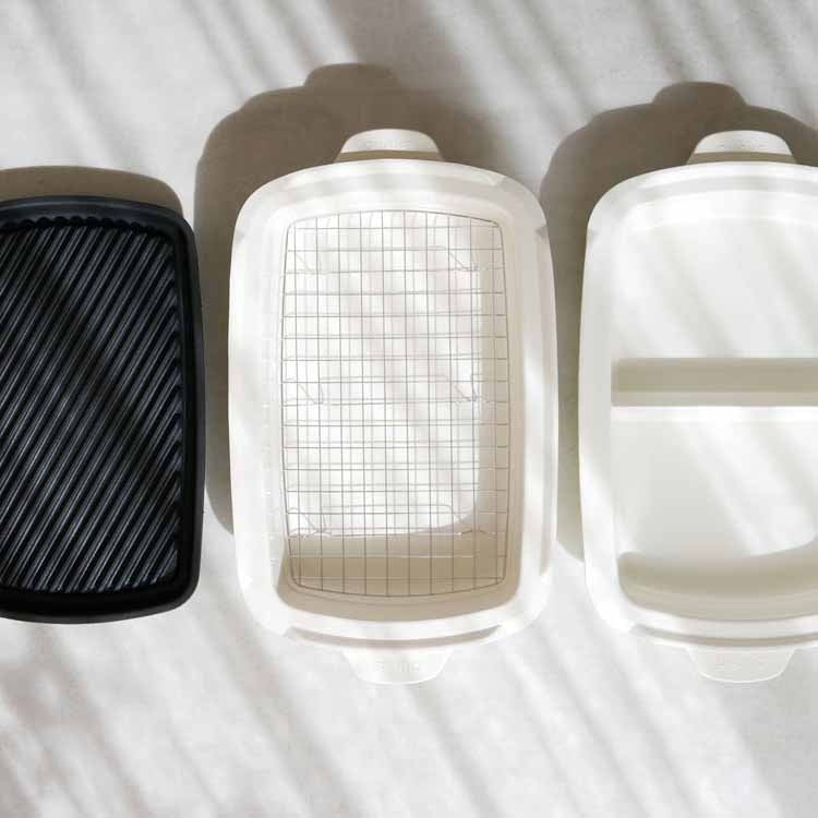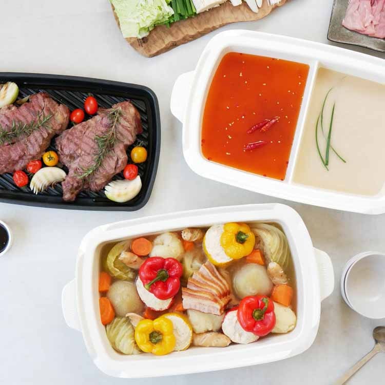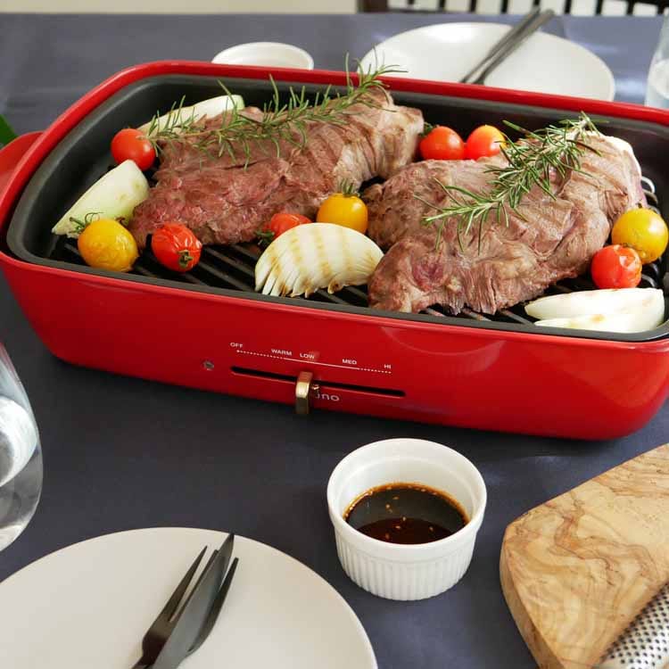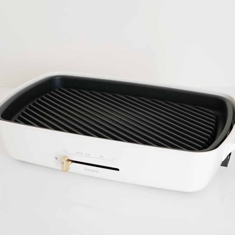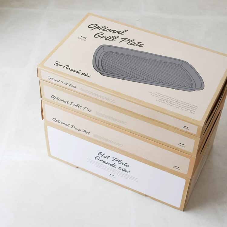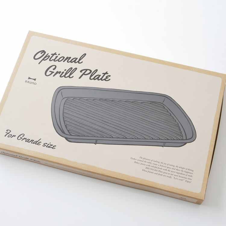 オプションパーツで愉しむホットプレートメニュー BRUNOホットプレート グランデサイズより待望のオプションパーツが新登場。ホットプレートグランデに乗せるだけで簡単に使えてアイデア広がるオプションプレート&鍋。オプションパーツをプラスすればメニューの幅が広がり、ホームパーティーだけでなく毎日の食卓でも気軽にホットプレートメニューが楽しめそうですね。メニューに合わせて選べる3種類 余分な脂を落としてヘルシーにお料理を楽しめるグリルプレートと、表面がセラミックコート加工された深さ10cmの深鍋と、深さ8.2cmのしきり鍋の3タイプをご用意しました。全て簡単に取り外して丸洗いできるので、お手入れも楽々です。※こちらの商品は「ホットプレート グランデサイズ」用となります。「コンパクトホットプレート」には対応しておりませんのでご確認の上お買い求めください。きれいな焼き色がつくグリル専用プレート お肉や野菜、焼き魚などをおいしく焼き上げるグリルプレートにホットプレートグランデサイズ用が登場。調理したい魚や肉、野菜などをそのまま乗せて焼き上げるだけのシンプル調理が魅力です。プレートの表面部分が凸凹になっているのが特徴で、魚やお肉の余分な脂を落とし、ヘルシーに焼き上げます。傾斜のあるグリルと溝がポイント 溜まった余分な油が流れるよう、グリル周りに溝を付けたグリルプレート。余分な脂を落とせるのでヘルシーにお料理を楽しめます。何と言っても見た目も美しい美味しそうな焼き目が付けられるのが特徴です。可愛いイラストが目を引くパッケージ グランデサイズをお持ちの方へのギフトにも最適なお洒落なパッケージ入り。収納BOXとしてもそのまま使えるのが嬉しいですね。最後までご覧いただきましてありがとうございます。ホットプレートグランデを買ったら思わずほしくなってしまうオプションパーツ。その中でも特に気になったのが「仕切り鍋」。お店などではよく目にしますが、お家でも2色の鍋が楽しめちゃうなんてと密かに憧れを持っていました。2種類の味が味わえるだけでなく、見た目も華やかでホームパーティーにぴったり。お鍋は丸いものだと思っていましたが、四角いお鍋がとってもスタイリッシュで新鮮。更にテーブルに置いた時の収まりの良さも◎で季節を問わず活躍しそうです。