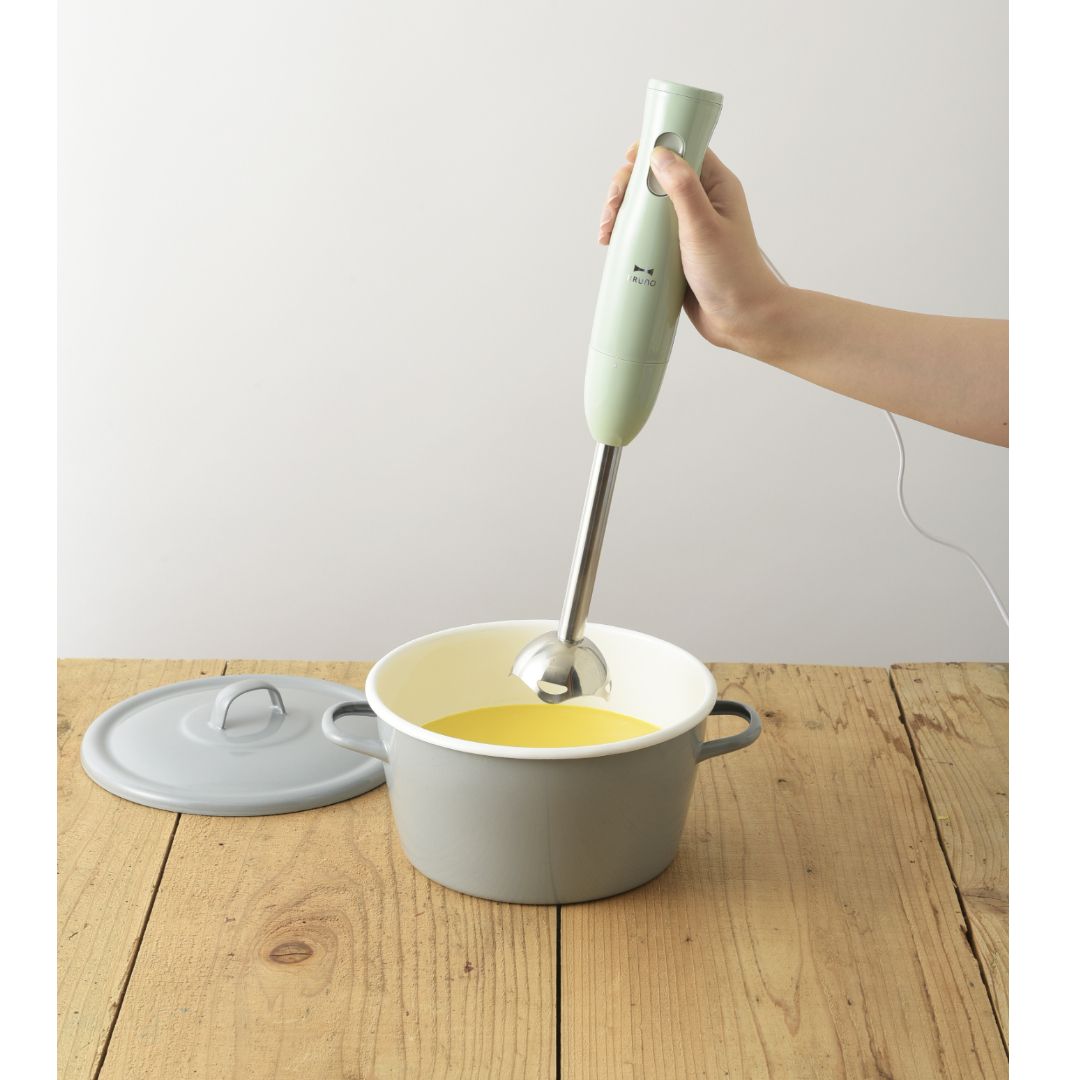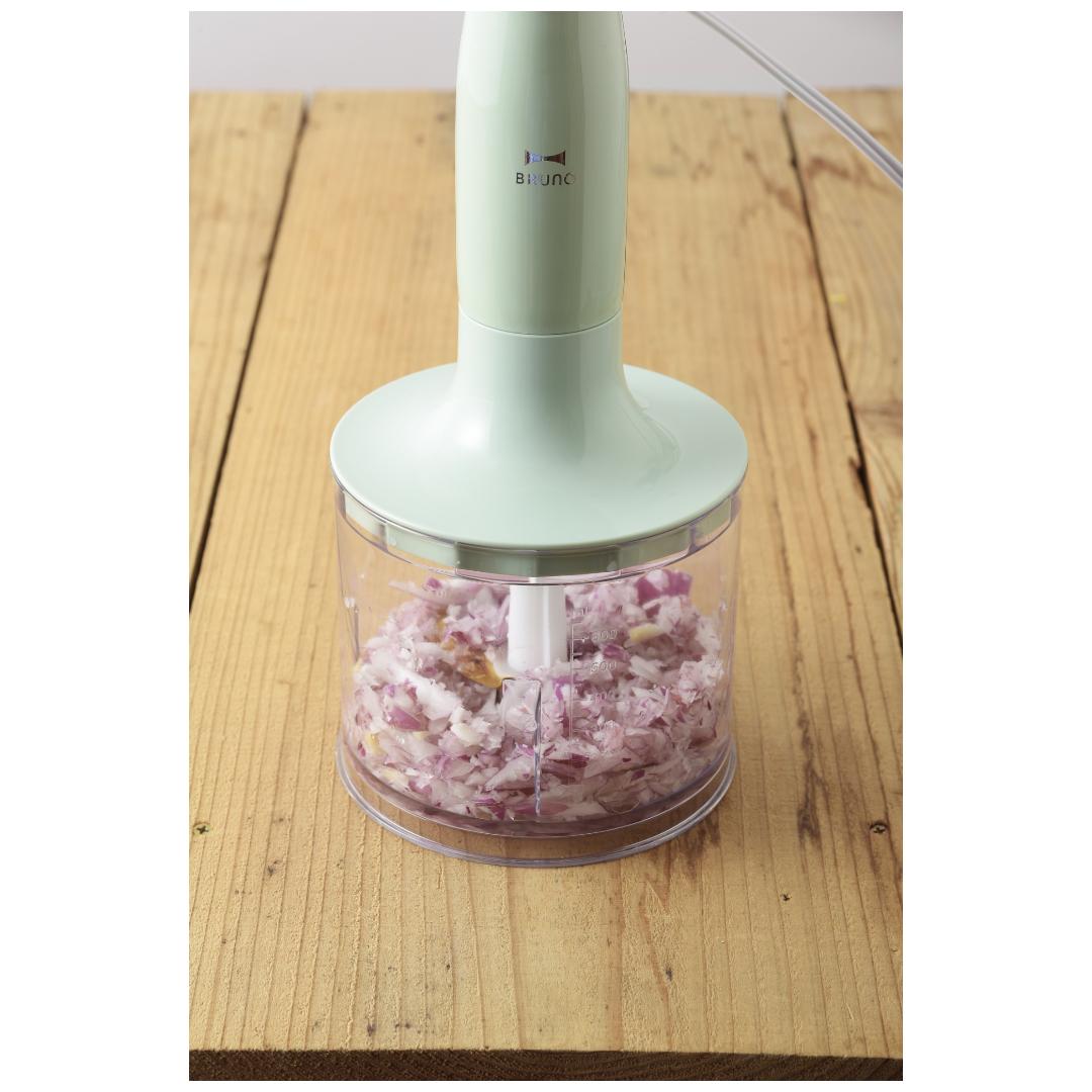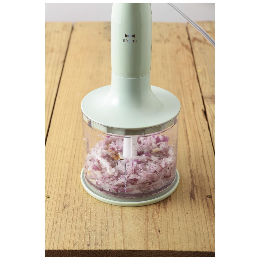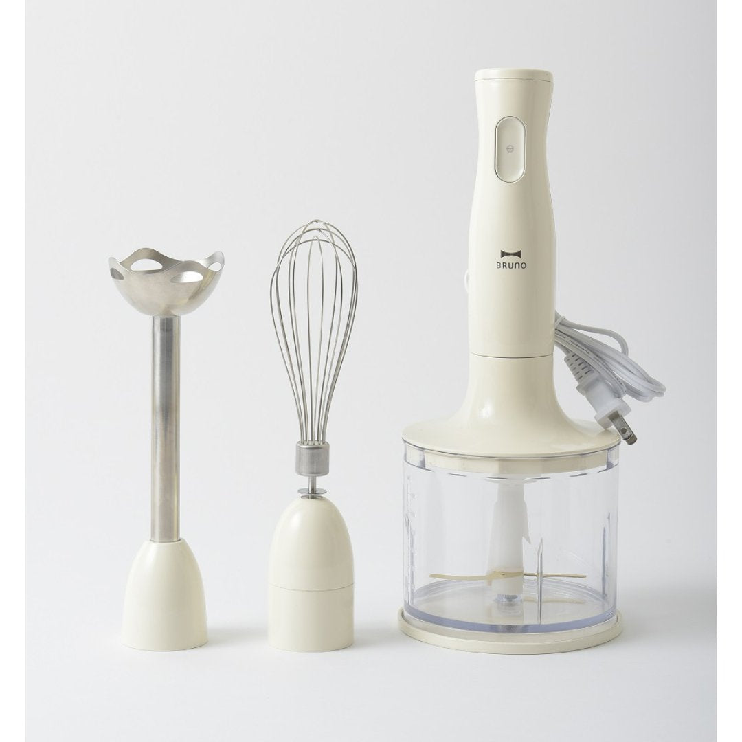 1台5役。料理の幅を広げるスティックブレンダー料理の幅を広げたいとき、時短で凝った料理を作りたいときに役立つのが、このブレンダーです。BRUNOのマルチスティックブレンダーは、5役をこなす優秀アイテム。『混ぜる』『つぶす』『刻む』『砕く』『泡立てる』などの、さまざまな調理作業がこれ1台。コンパクトながら力強いパワーで、幅広い料理の時短を叶えます。面倒な下ごしらえはスイッチひとつ。離乳食作りに、お菓子作りに食材を細かく刻んだり、潰したり、混ぜたりする下ごしらえ作業は、時間も労力も要するのでとても大変。このマルチスティックブレンダーがあれば、面倒な下ごしらえのストレスも解消できるでしょう。スイッチを押すだけで、食材を思い通りの形に仕上げられます。育児中の離乳食作りはもちろん、失敗しやすいお菓子作りの泡立ても、ブレンダーを使えばほんの一瞬。ポタージュやスムージー、フローズン作りにも使えます。コンパクトで使いやすく、片付けも簡単マルチスティックブレンダーは、スリムなボディが魅力の一つ。手の小さな女性でも扱いやすく、使用前の準備も簡単なので、必要な時にさっと取り出して使えます。さらに、使った後の片付けが簡単なのも嬉しいポイント。アタッチメントを取り外して洗うだけでOKです。コンパクトに仕舞えるので、収納場所も取りません。スタイリッシュなフォルムで見た目も合格。見た目のスタイリッシュさも、このブレンダーの特徴です。無駄な装飾のないミニマルなデザインは、キッチンに置いておいても生活感を感じさせません。おしゃれなキッチンアイテムは見た目が良く、料理のモチベーションを高めてくれるでしょう。カラーは料理を引き立てる3色、アタッチメントは万能性を叶える3種マルチスティックブレンダーのカラーバリエーションは、3色。シンプルなアイボリー、かわいらしいピンク、爽やかなグリーンがラインナップされています。どれもパステルがかった柔らかな色味で、ステンレスシルバーとの相性は抜群。食材の色鮮やかさも引き立てます。また、付属品としてブレンダー、チョッパー、ホイッパーの3種のアタッチメントが付いており、あらゆる調理に対応可能。本体は、コンセントを指してスイッチを押すだけで作動します。