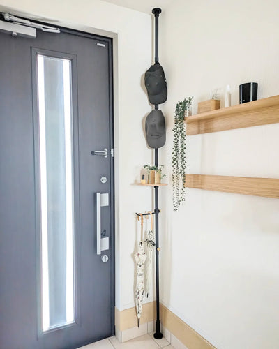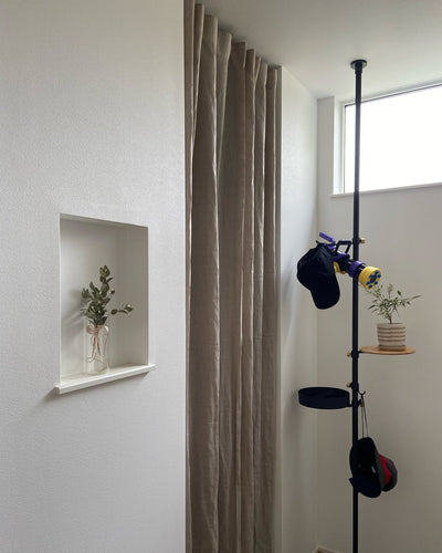 豊かな暮らしを提案する「DRAW A LINE」シリーズ DRAW A LINEは一本のラインで豊かな暮らしを提案するシリーズとして誕生したブランド。これまで、つっぱり棒は「収納用便利グッズ」というイメージでしたが、そんなイメージを一新し、オシャレな空間づくりに役立つアイテムに生まれ変わりました。つっぱり棒とテーブルやランプ、シェルフやフックなどを組み合わせ、お好きなようにカスタマイズ可能。今までデッドスペースだった場所をオシャレなディスプレーコーナーへと変えてみてください。パーツを選び、自分らしい収納をカスタマイズ 縦方向に取り付ける場合は、テーブルA、フックA、フックB(ロングタイプ)、シューズラック、トレイ、マグネット(3個セット)の中からお好きなアクセサリーを選んで組み合わせができます。また、シェード(203 Shade、204 Wire Shade)を組み合わせたランプアーム(201 Lamp Arm S、203 Lamp Arm L)も組み合わせることが可能です。自分らしい収納スぺースをカスタマイズして楽しむ事ができますよ。マットな質感で洗練されたイメージ DRAW A LINEのフックはいずれも粉体塗装されており、独特のマットな質感が楽しめます。シンプルでスタイリッシュなイメージで、単なるつっぱり棒のイメージをオシャレなものへと変えてくれるフックたち。どんなお部屋にもしっくりなじみそうです。取り付け方もカンタンで、DRAW A LINEテンションロッドに付属の真鍮製ネジで固定するだけ。お好みの位置でカンタンに取り付けられます。特に工具も必要ないので、女性でも気軽に取り付け可能なんです。サイズは2種類 フックは2種類、フックAとロングタイプのフックBがあります。フックAは、奥行の少ないオーソドックスなフックです。ハンガーに掛けた洋服やカバン、ハンギンググリーンなど、お好きな位置にフックを移動して掛けることができます。フックBは、奥行の長さを活用してさまざまなアイテムをかけられます。先端がラウンドしているため、服や帽子の傷みを気にせず掛けることができます。お好きなものをディスプレイしてみて DRAW A LINEテンションロッドと組み合わせ可能なフックたち。どちらも、お好きな位置に取り付けられるので、空間を有効活用できますね。ドライフラワーやカバン、ストールなどを掛けたり、ハンガーを掛けてお好みの洋服をディスプレイしたり…。また、付属の真鍮製ネジがレトロ感いっぱいでシックなイメージを与えてくれます。隠す収納から魅せる収納へと変えてくれる、そんなフックたちをインテリアのアクセントとして活躍させてみてください。