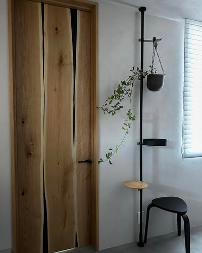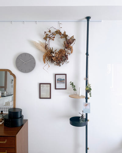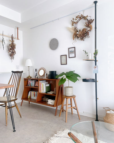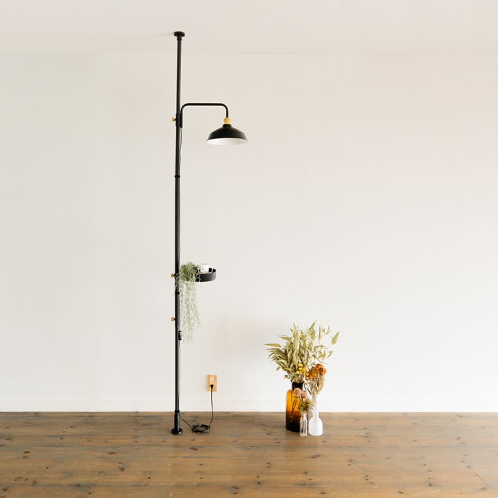 魅せる収納がカンタンに。「DRAW A LINE」シリーズ DRAW A LINEは魅せる収納がカンタンにできる魅力的なアイテムが揃っています。ちょっとしたスペースがあれば、壁に穴を開けなくてもお気に入りの空間へと早変わり。キッチンやリビング、洗面所だけでなく、玄関やお部屋の中のデッドスペースが洗練されたオシャレなスペースへと変えられるのは魅力的ですね。テンションロッドを設置して、トレイやシェルフ、フックなどと組み合わせれば、お気に入りのアイテムをディスプレイできますよ。パーツを選び、自分らしい収納をカスタマイズ 縦方向に取り付ける場合は、テーブルA、フックA、フックB(ロングタイプ)、シューズラック、トレイ、マグネット(3個セット)の中からお好きなアクセサリーを選んで組み合わせができます。また、シェード(203 Shade、204 Wire Shade)を組み合わせたランプアーム(201 Lamp Arm S、211 Lamp Arm L)も組み合わせることが可能です。自分らしい収納スぺースをカスタマイズして楽しむ事ができますよ。どこでも灯りが楽しめる DRAW A LINEのテンションロッドと組み合わせて使えるランプシェードとランプアーム。DRAW A LINEのランプアームやランプシェードの特徴はメッキをしていないので使えば使うほど味わい深い質感へと変わります。マットな色合いで落ち着いた雰囲気。シンプルなインテリアだけでなく、モダン、アンディークなインテリアのお部屋にもしっくりなじみそう。狭いスペースの場所でもテンションロッドが設置できれば、オシャレな灯りが楽しめますよ。アームとシェードの種類は2種類 DRAW A LINEテンションロッドと組み合わせて使えるアームシェードのサイズは2種類をご用意。アームSの長さは38cmでアームLは91.5cmとなっており、場所に合わせて選べます。シェードの種類も2種類あり、シンプルなシェードとワイヤーシェードがあるので、お部屋の雰囲気に合わせて選ぶことができますよ。灯り真下へ落ちるようになっているので、ベッドやソファで本を読む時に最適。おうちでのリラックスタイムになくてはならない存在になりそうです。お好きな場所にオシャレな灯りを DRAW A LINEの縦型テンションロッドに取り付ければ、お好きな場所でオシャレな灯りが楽しめます。「ここにスペースがあったらランプが置けるのに…」と諦めていた場所でも、テンションロッドが設置できればOK。スペースに合わせてワイヤーの長さを選び、お部屋の雰囲気に合ったシェードを選んでみてください。リビングにはシェードを、ベッドルームにはワイヤーシェードを…など、使い分けるのも楽しいですね。思いがけない場所でオシャレな灯りが楽しめそうです。
