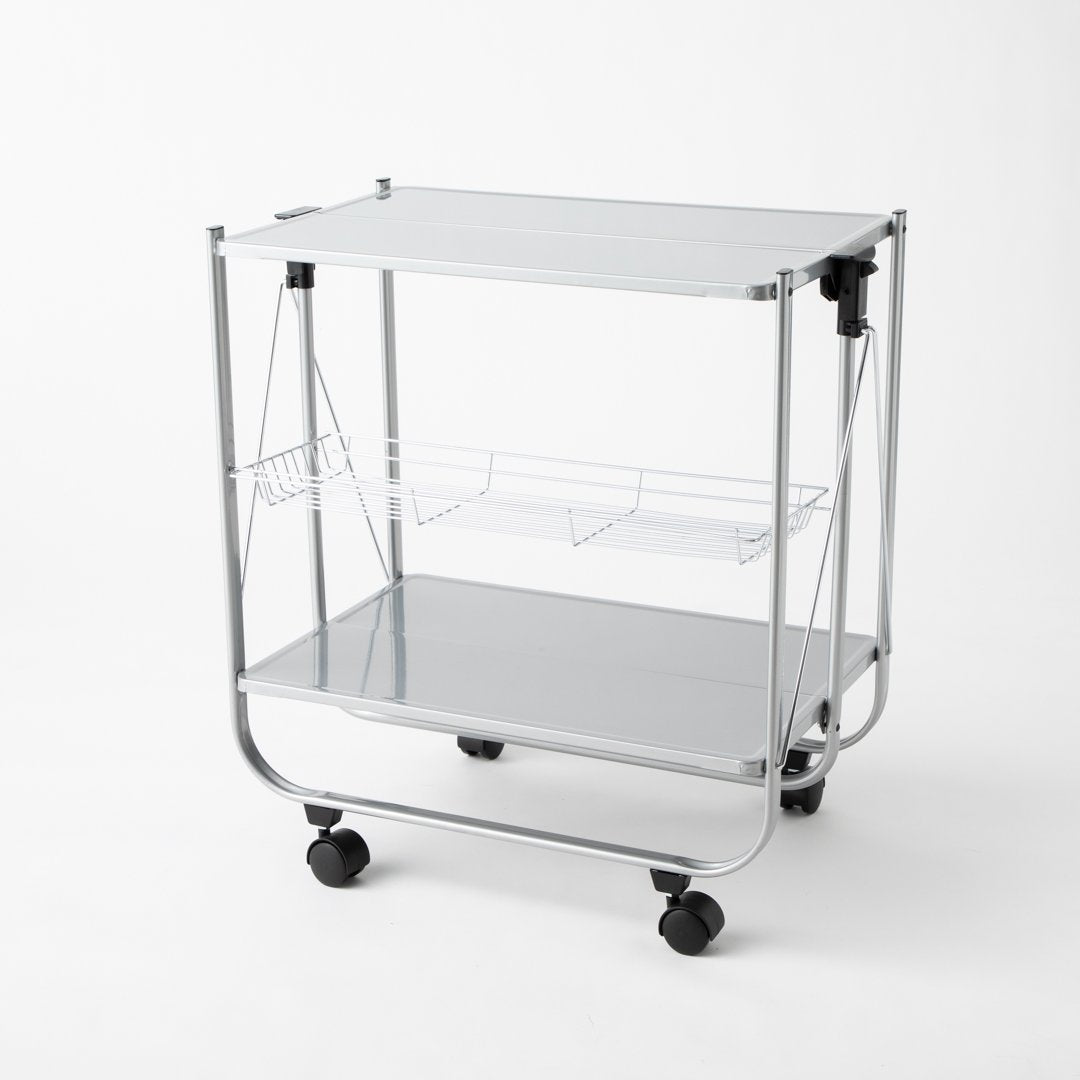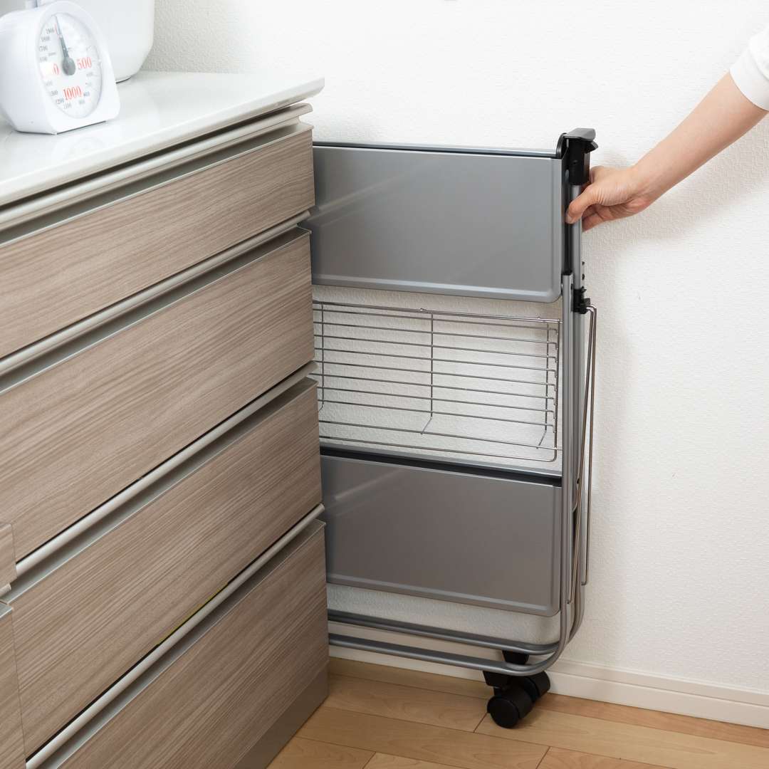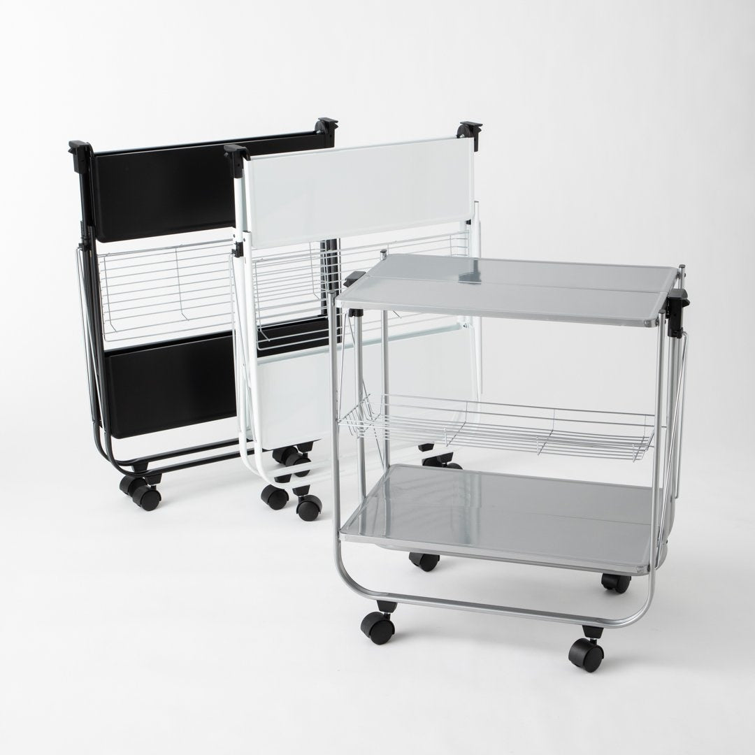 収納だけじゃない。実用的なキッチンワゴンをお探しの方に今回紹介するのは、フォールディングトローリーという商品です。商品名が耳慣れないという人もいるかもしれませんが、簡単にいうとキッチンワゴンのこと。ただ、この品は収納だけのキッチンワゴンではありません。実用性に富んだキッチンワゴンを探している人にぜひおすすめしたい1品です。ワゴンの1番上には天板があり、作業スペースとして使えるほか、レシピを見るための本やスマホ、タブレットなどを置くこともできるでしょう。もちろん、完成した料理を置くこともできますね。キャスター付きなので、キッチンワゴンに乗せたまま料理をテーブルに運ぶこともできますよ。中段のスチールラックには小物や食材を収納しようトローリーの中段にあるのはスチールラックです。上段の天板を作業台に使えるので、中段のスチールラックは小物入れや食材入れに使えます。また、S字フックを引っかけて使うと収納力アップ。(S字フックは付属していません)仮に上の天板を作業台として使うとしたら、使う小物をスチールラックにまとめておけば、わざわざ別の場所に取りに行く手間も省けるでしょう。1番下の天板には背の高いものや重ねて収納できるものを置くのがおすすめ1番下にも天板があります。お鍋やフライパンなどを置くのもいいですし、中段のラックに収納できないキッチン小物を置いておくのもいいですね。また、中段のラックは下にある天板の半分のサイズなので、背の高い物を置くこともできて非常に便利です。場所を取りがちなボウルを重ねて収納するなど、重ねられるものは重ねて収納するとキッチンもすっきりします。使わないときは折りたたんで収納できるのが人気ポイントこのキッチンワゴンのメリットは、使わないときに折りたたんで収納できることです。「キッチンワゴンって便利だけど、使わないときに場所を取って困る」という場合におすすめ。折りたたむと厚さ約7.5cmのコンパクトサイズになります。壁に立てかけておいてもいいですし、ちょっとしたすきまに収納しておいてもいいですね。使いたいときにはさっと出して使えるので非常に便利です。カラーバリエーションは全部で3色。スタイリッシュなカラーが勢揃いカラーバリエーションはホワイト・マットブラック・シルバーの3色展開です。どのカラーもおしゃれでスタイリッシュなイメージなので、どのカラーを選んでもキッチンやお部屋になじむことでしょう。