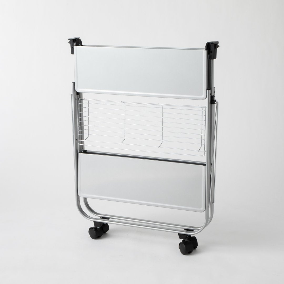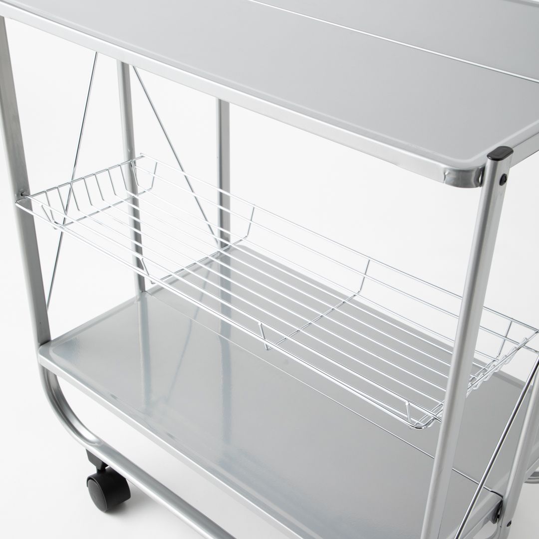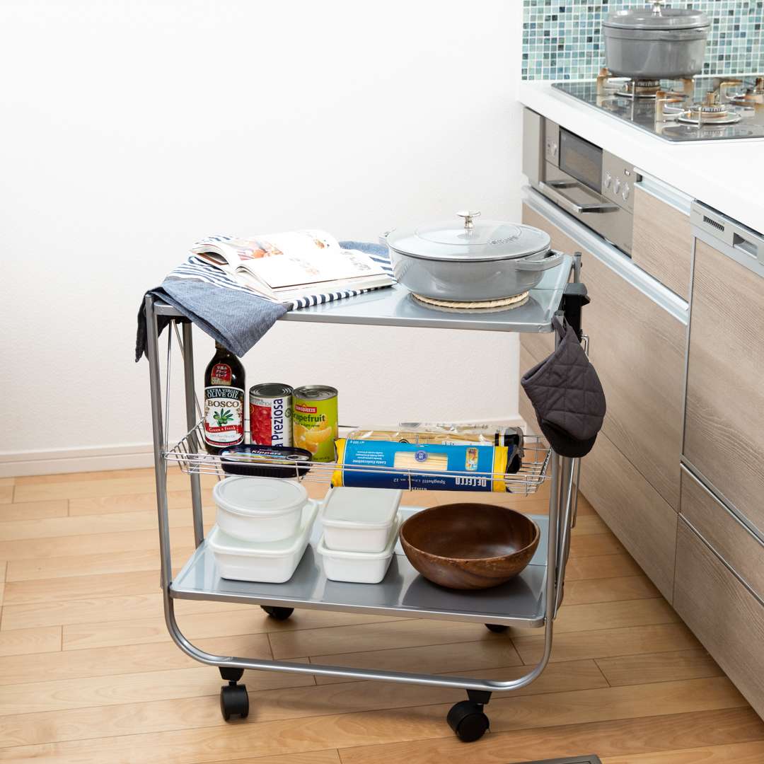 収納だけじゃない。実用的なキッチンワゴンをお探しの方に今回紹介するのは、フォールディングトローリーという商品です。商品名が耳慣れないという人もいるかもしれませんが、簡単にいうとキッチンワゴンのこと。ただ、この品は収納だけのキッチンワゴンではありません。実用性に富んだキッチンワゴンを探している人にぜひおすすめしたい1品です。ワゴンの1番上には天板があり、作業スペースとして使えるほか、レシピを見るための本やスマホ、タブレットなどを置くこともできるでしょう。もちろん、完成した料理を置くこともできますね。キャスター付きなので、キッチンワゴンに乗せたまま料理をテーブルに運ぶこともできますよ。中段のスチールラックには小物や食材を収納しようトローリーの中段にあるのはスチールラックです。上段の天板を作業台に使えるので、中段のスチールラックは小物入れや食材入れに使えます。また、S字フックを引っかけて使うと収納力アップ。(S字フックは付属していません)仮に上の天板を作業台として使うとしたら、使う小物をスチールラックにまとめておけば、わざわざ別の場所に取りに行く手間も省けるでしょう。1番下の天板には背の高いものや重ねて収納できるものを置くのがおすすめ1番下にも天板があります。お鍋やフライパンなどを置くのもいいですし、中段のラックに収納できないキッチン小物を置いておくのもいいですね。また、中段のラックは下にある天板の半分のサイズなので、背の高い物を置くこともできて非常に便利です。場所を取りがちなボウルを重ねて収納するなど、重ねられるものは重ねて収納するとキッチンもすっきりします。使わないときは折りたたんで収納できるのが人気ポイントこのキッチンワゴンのメリットは、使わないときに折りたたんで収納できることです。「キッチンワゴンって便利だけど、使わないときに場所を取って困る」という場合におすすめ。折りたたむと厚さ約7.5cmのコンパクトサイズになります。壁に立てかけておいてもいいですし、ちょっとしたすきまに収納しておいてもいいですね。使いたいときにはさっと出して使えるので非常に便利です。カラーバリエーションは全部で3色。スタイリッシュなカラーが勢揃いカラーバリエーションはホワイト・マットブラック・シルバーの3色展開です。どのカラーもおしゃれでスタイリッシュなイメージなので、どのカラーを選んでもキッチンやお部屋になじむことでしょう。