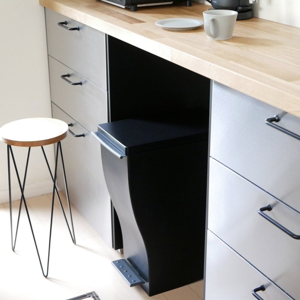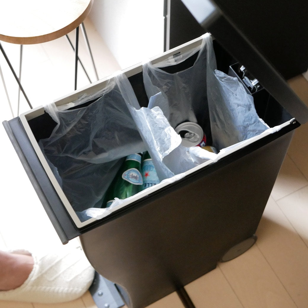 ワイドなペダルと、スリムなサイズ ペダルはワイドで踏みやすく、サイズはとことんスリム。なゴミ箱です。ペダルを踏んでフタを開けるタイプのゴミ箱は、踏みやすさが命。こちらのゴミ箱はペダルの幅が広いので確実にフタを開けることができます。ペダルを踏むとフタが開き、離すと閉まるので手を使うこともなく、生ゴミのニオイも抑えてくれます。大容量の1枚でも、レジ袋2枚でも ゴミ箱には大容量のポリ袋1枚をセットできるほか、レジ袋を2枚セットしてゴミを仕分けることもできます。燃えるゴミ、燃えないゴミ。あるいはプラスチック製品やビン・カンなど、細かい分別をするにも便利ですね。キャスター付きなので移動させたいときもスムーズです。