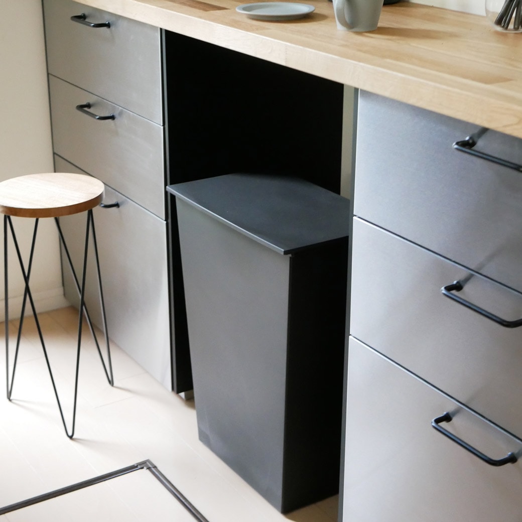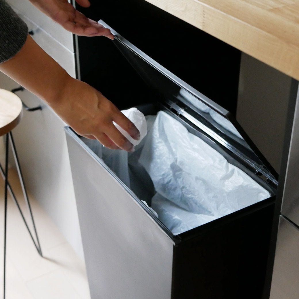 たどりついた究極のシンプル&スリム モダンでおしゃれな印象のゴミ箱です。特徴的なのは、とことん無駄な要素をとりのぞいたシンプルさとスリムなフォルム。底面にキャスターが付いているものの、まったく目立たないので、一見すると「本当にゴミ箱?」と疑ってしまうかも…。角型なので壁にそわせてもピッタリ配置でき、複数使いしてもスマートです。ゴミの複数分別も簡単。ワイヤーフレームには凹凸があるので、複数のビニール袋を分けてかけられます。だから、細かなゴミの分別がしたいときも簡単。自宅のゴミの量や分けたい種類に応じて、使い方を選べるところがうれしいですね。