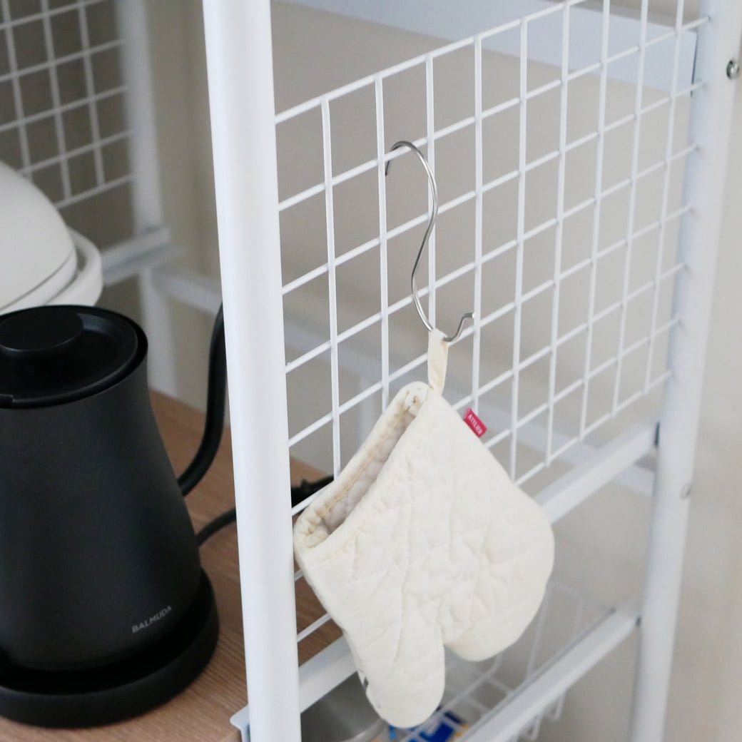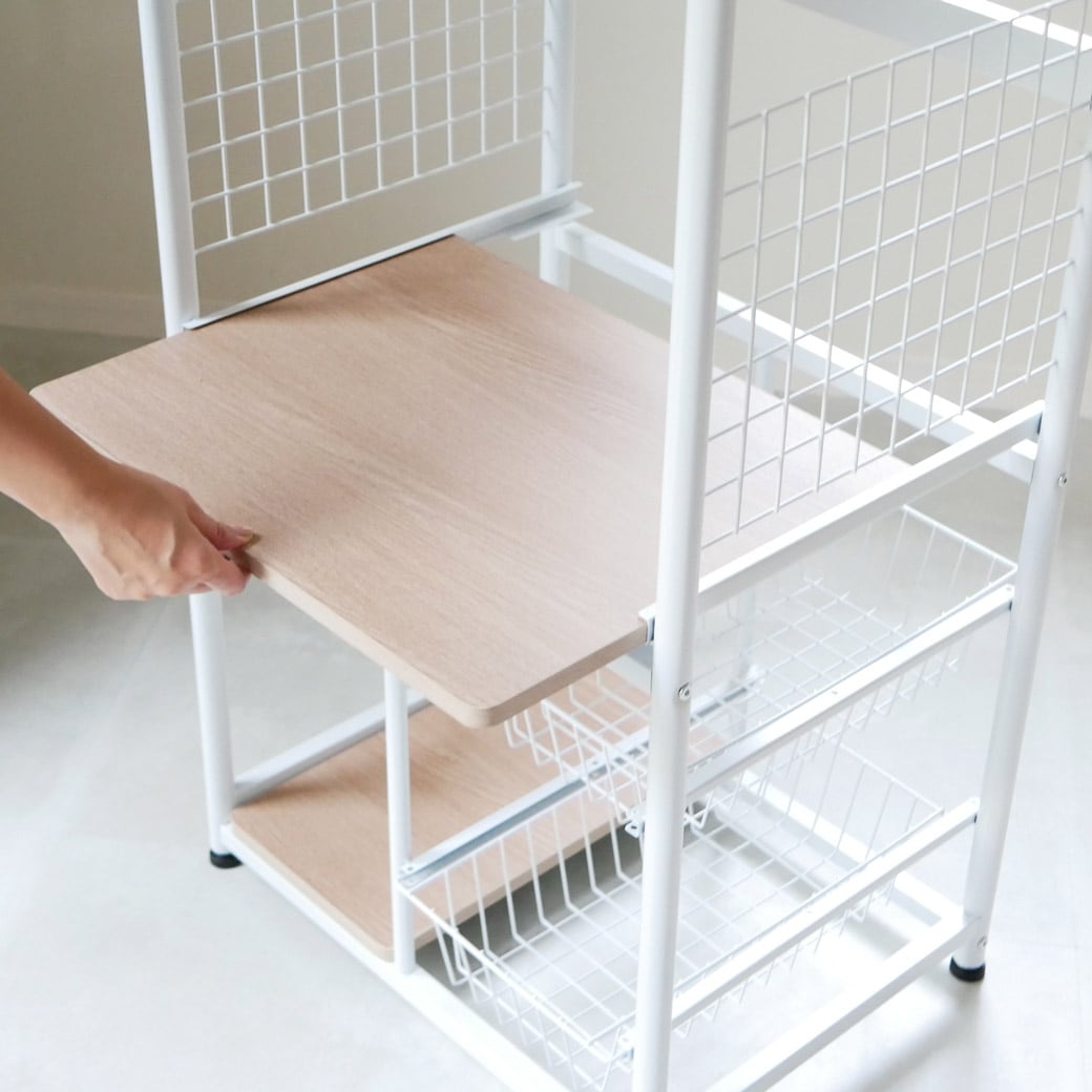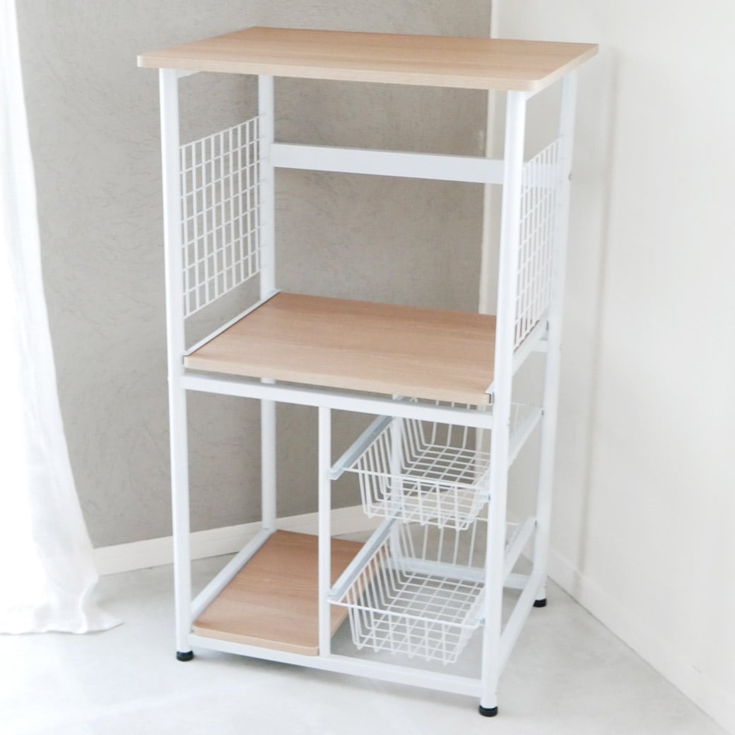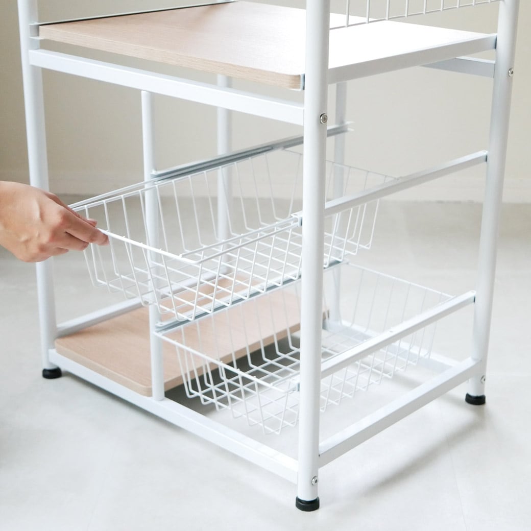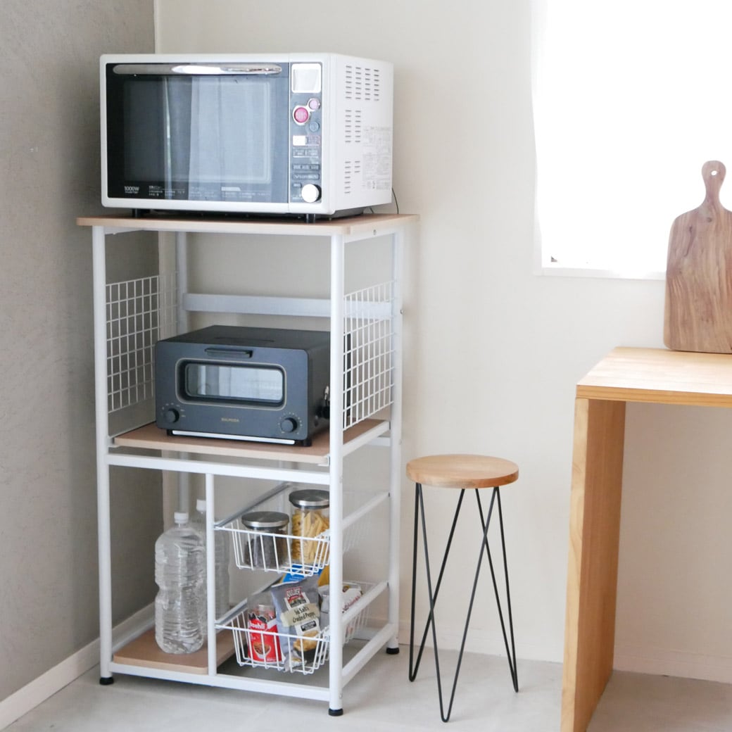 悩めるキッチン家電もまとめてスッキリ収納。 天板にレンジが置ける、便利なキッチンラックです。ラックのいちばん上はオーブンレンジや電子レンジを置くのにぴったり。かさばる調理家電の置き場所にぴったりなうえ、ラック部分には手元に置いておきたい食材ストックなどをひとつにまとめておくことができます。散らかって見えがちなキッチンまわりも、ずいぶんスッキリしますね。 引き出しやすい中棚 中棚はスライド式になっているのでフタを開けて使う電子ジャーなど、蒸気が発生する家電の置き場所におすすめ。スルスルと引き出しやすく、どこに何があるかも一目瞭然なので「どこに何を収納するか」考える作業も楽しくなってきそうですね。