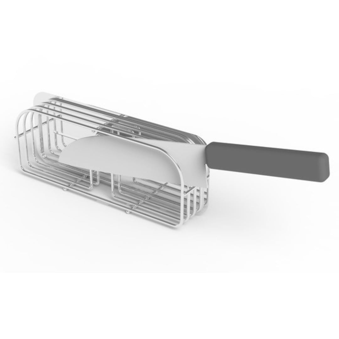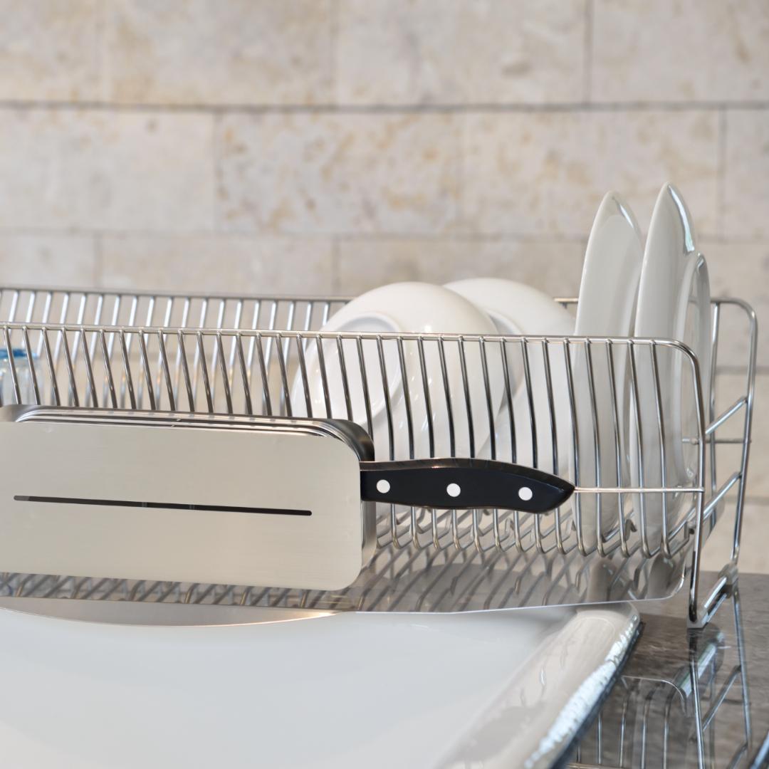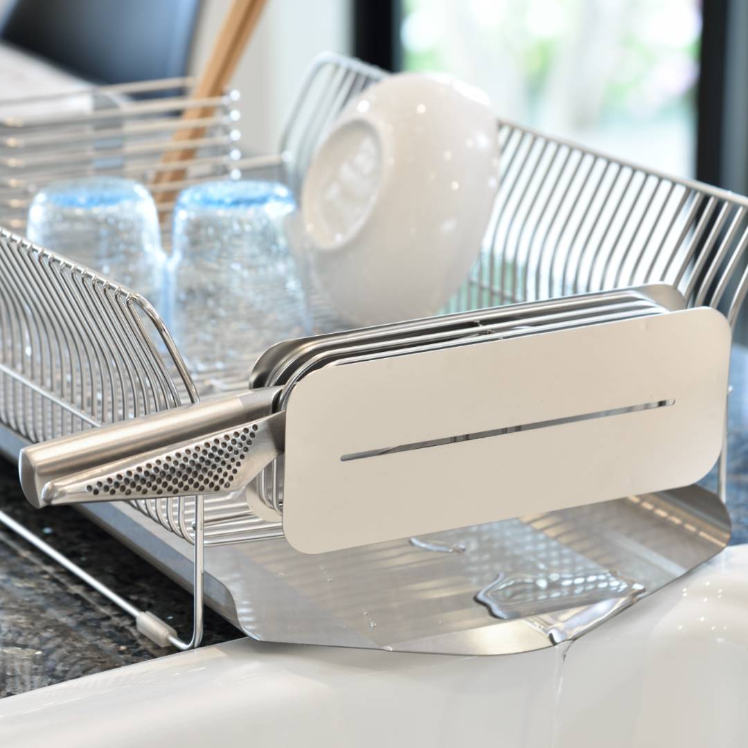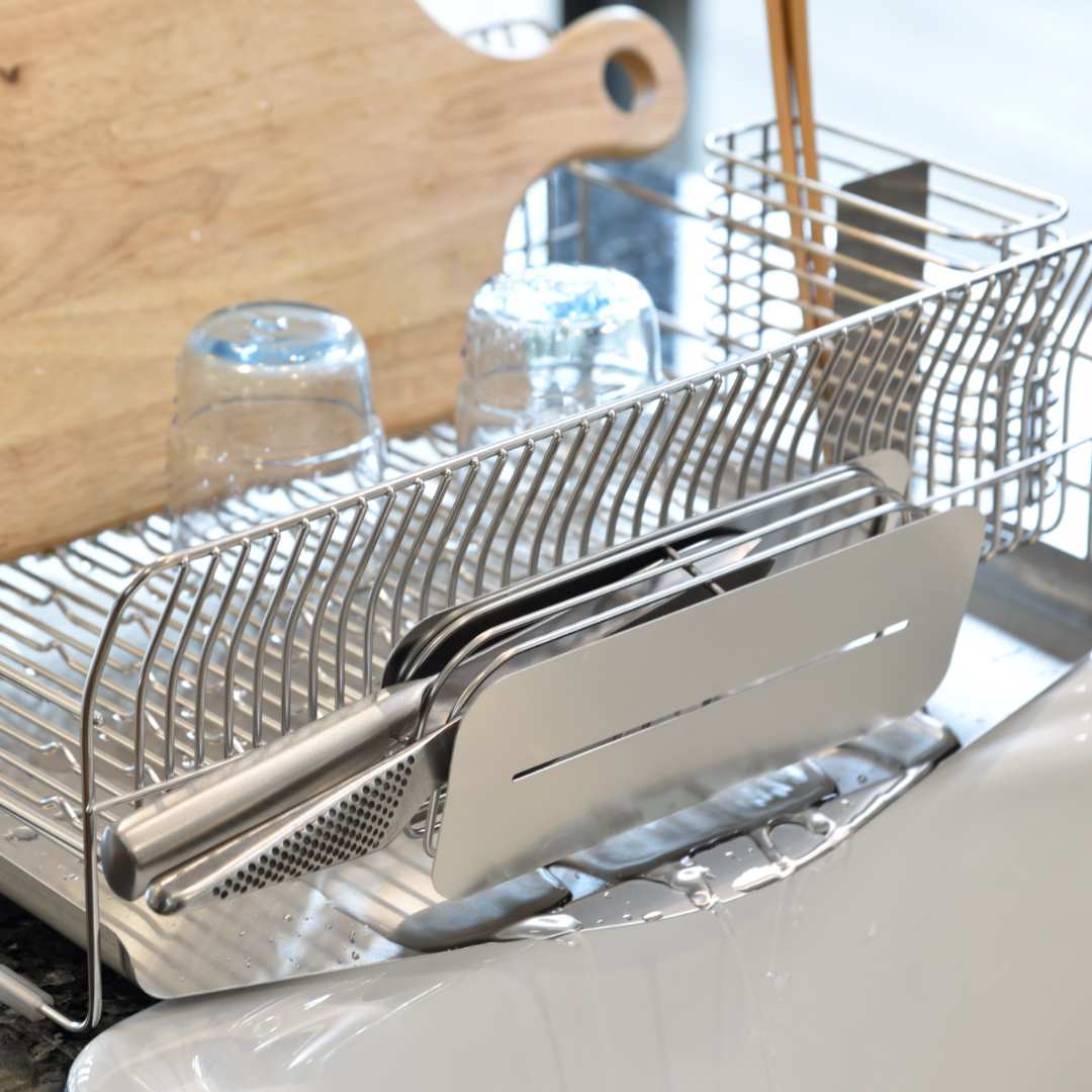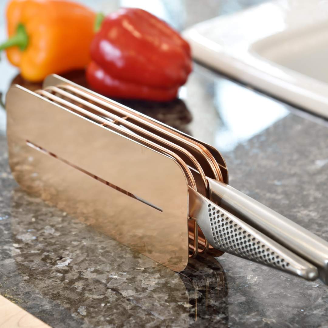 大切な包丁に傷をつけない!スマートに収納できる包丁スタンド毎日の調理に欠かせない包丁の専用置場になるスタンドです。包丁の柄の重みで刃が浮き上がる設計により、包丁の刃が傷つかないのが魅力。大切な包丁を守りながら、スマートに保管しておけます。包丁によっては柄より刃が重い場合もありますが、スタンド下部に付属のクッションを付けることで、刃が重い包丁も傷つけません。また、こちらのスタンドは作業台にそのまま置いて使うのはもちろん、水切りかごに取り付けて使うことも可能。縦置き・横置き・ロングなど……水切りかごの形状を問わずにピタッとはまります。すっきりスリムなデザインなので、水切りかごに食器を出し入れする際も邪魔になりません。キッチンの雰囲気に合わせて選べる2カラーカラーは、シルバーとローズゴールドの2色展開です。シルバーはキッチンをスタイリッシュな印象に、ローズゴールドは上品で美しい輝きをキッチンにプラスしてくれます。設置したい場所の雰囲気に合わせて、好きなカラーを選んでください。