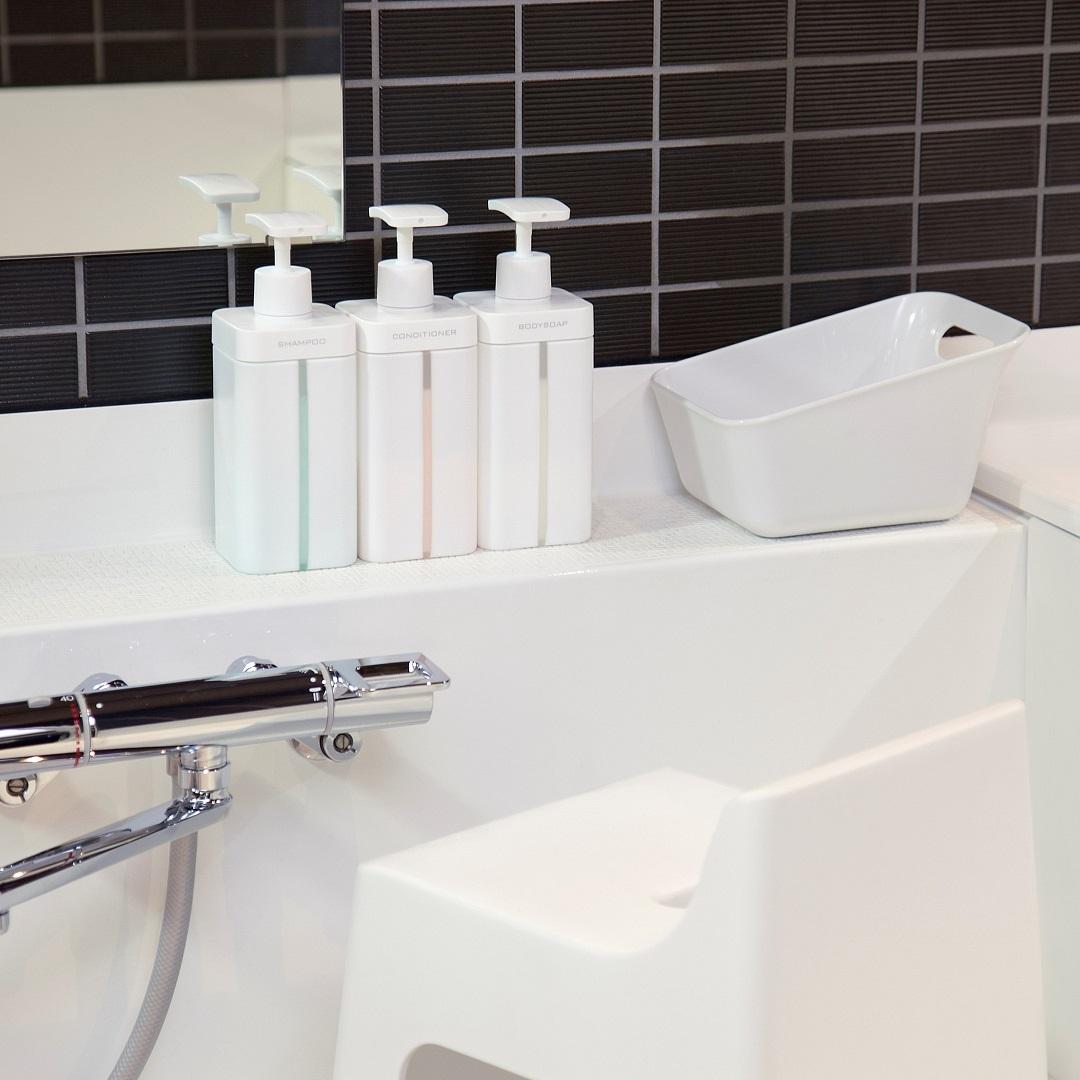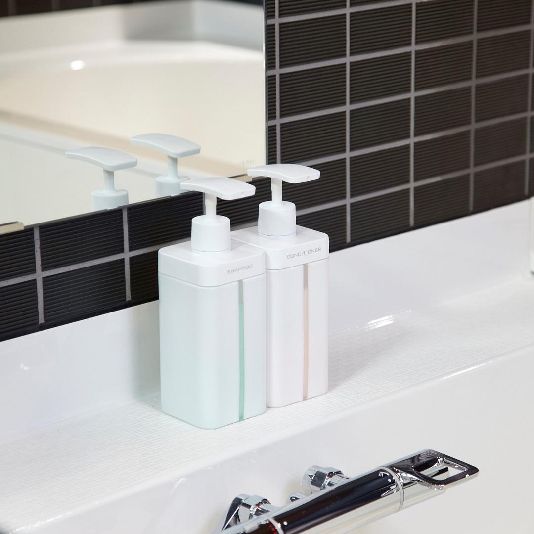 置くのも吊り下げ収納も相性バツグン!シンプルなコンディショナーディスペンサーホワイトを基調としたシンプルなデザインのコンディショナーディスペンサーです。ボトルの前面には半透明のスリットが入っており、コンディショナーの残量を一目で確認できます。一般的なディスペンサーと比べてボトル開口部が大きいため、詰め替え時や洗って乾かす際にも便利です。800mlも入る大容量なので頻繁に詰め替え作業を行う必要がないだけでなく、詰め替えパックごとボトルに入れられるので時短になります。フラットで大きめのポンプは手のひらでも指先でも押しやすく、ポンプヘッドを収納するネジや滑り止めの凹凸がないので、汚れがたまりづらい構造となっています。四角い本体はモダンなバスルームに置くのはもちろん、バスケットやハンギングフックで吊り下げて収納したい方にも相性がいいです。